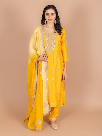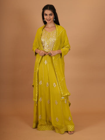 Elevate your style with our Ranas Yellow Color Designer Suit. This trendy suit features a...