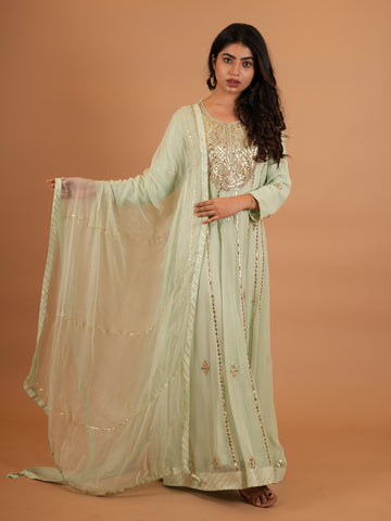 Elevate your style with our Ranas Designer Anarkali Suit. Hand-embroidered with gota work, this art...