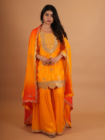 Experience the rich elegance of our Ranas Mustard Yellow Sharara Set. Kurta made with luxurious...