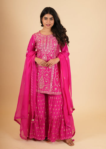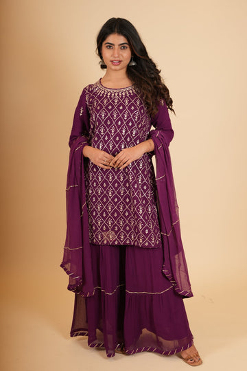 This beautifully designed Purple Color Sharara Set features exquisite Pittan work and trendy aesthetics. The...