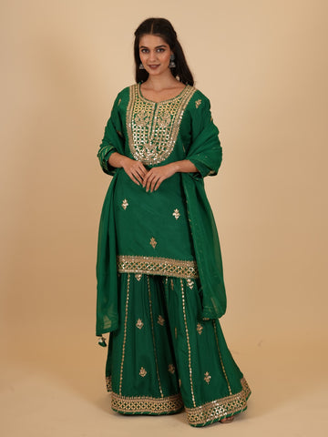 This Ranas Gota Patti Work Sharara Set features a green shaded kurta with intricate gota...