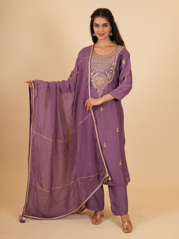 This Ranas Designer Gota Work Suit features a beautiful purple color that adds elegance to...