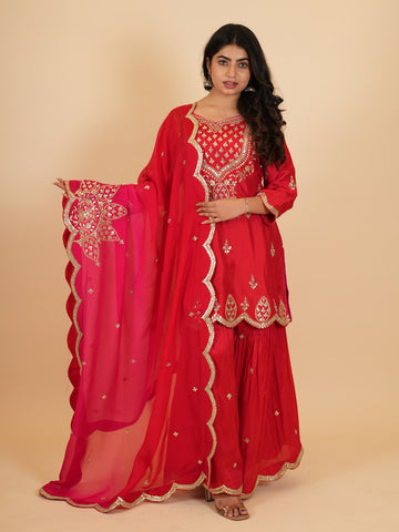 This elegant Ranas Red Color Designer Sharara Set features intricate gota patti design on a...