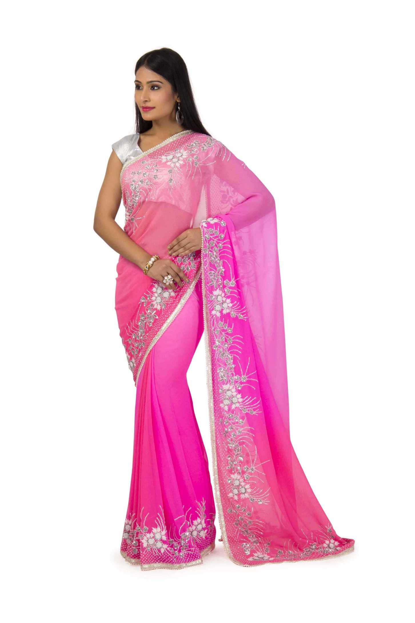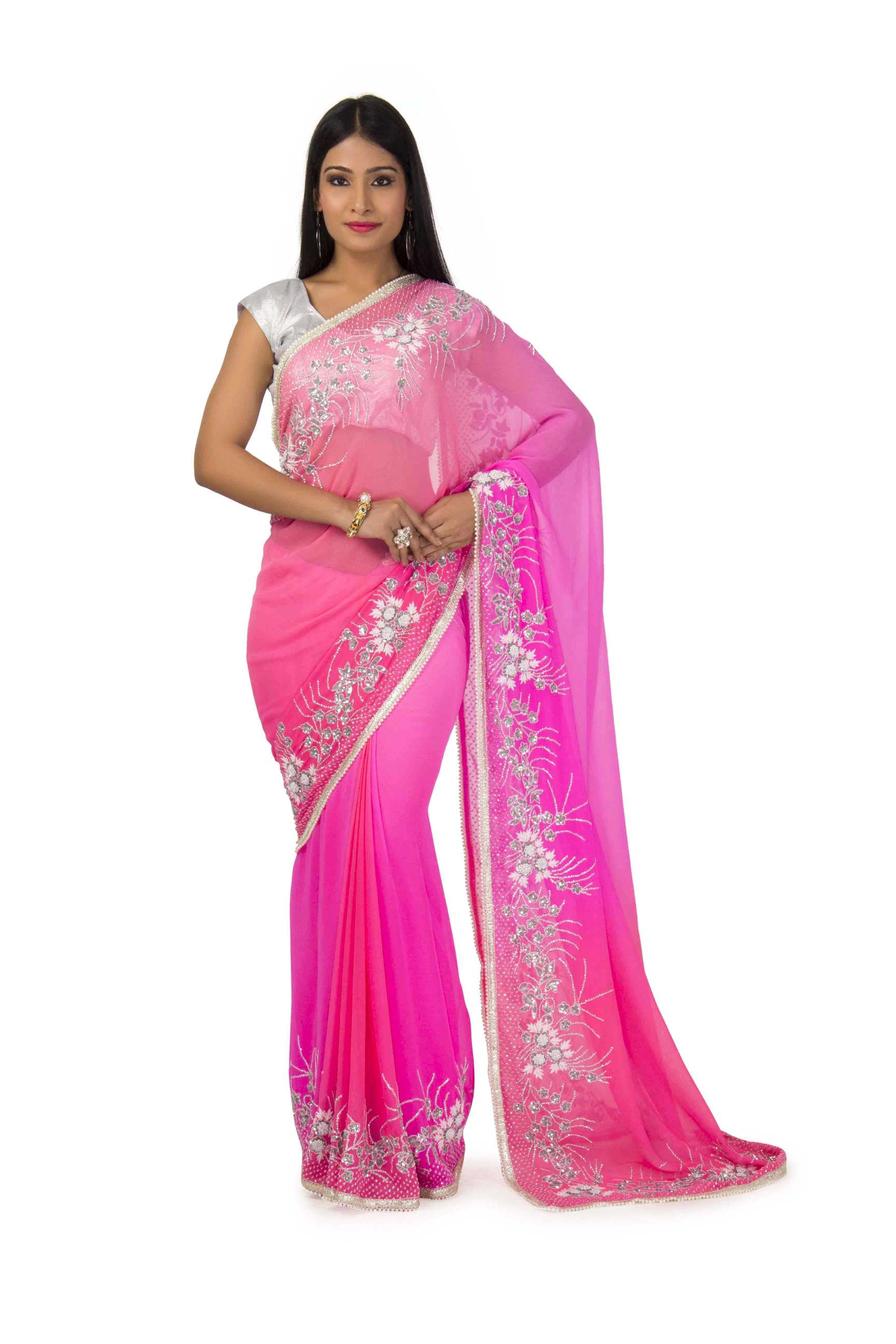 Chiffon Saree In Peach Shaded With Sequence, Thread, Moti Work
