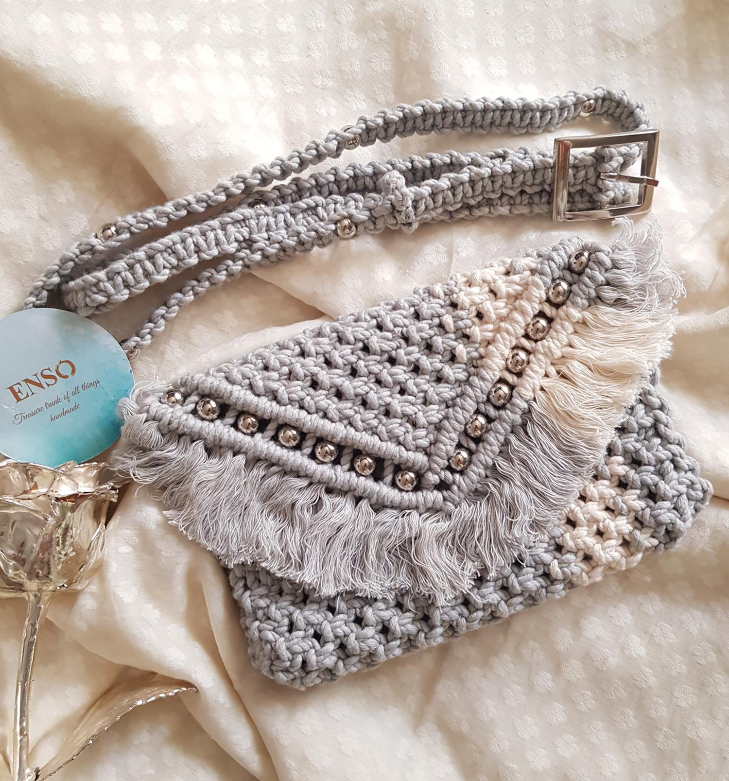 Expertly handcrafted with high-quality cotton yarn, this Enso 3 in 1 waist bag offers versatile functionality as a waist bag, clutch, and sling bag. Its elegant grey and ivory color scheme adds a touch of sophistication to any outfit. Perfect for stylishly carrying your essentials on the go.