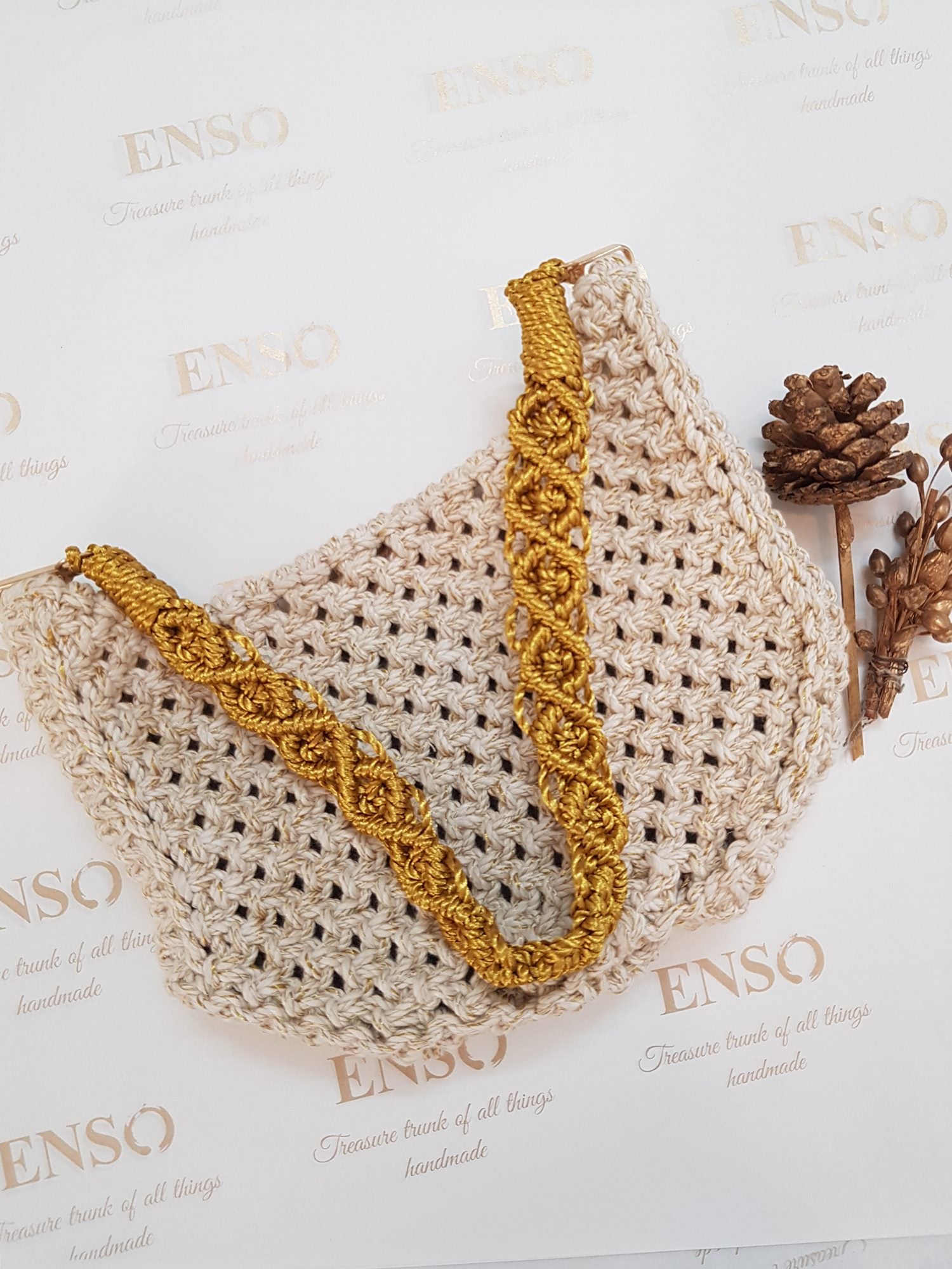 Experience luxury and elegance with the Enso Handmade Shoulder Bag. Handcrafted with soft cotton yarn fabric, this bag features a stunning ivory and gold color, perfect for any occasion. Stay organized with enough space for your daily essentials and work gadgets. Elevate your style with Enso.