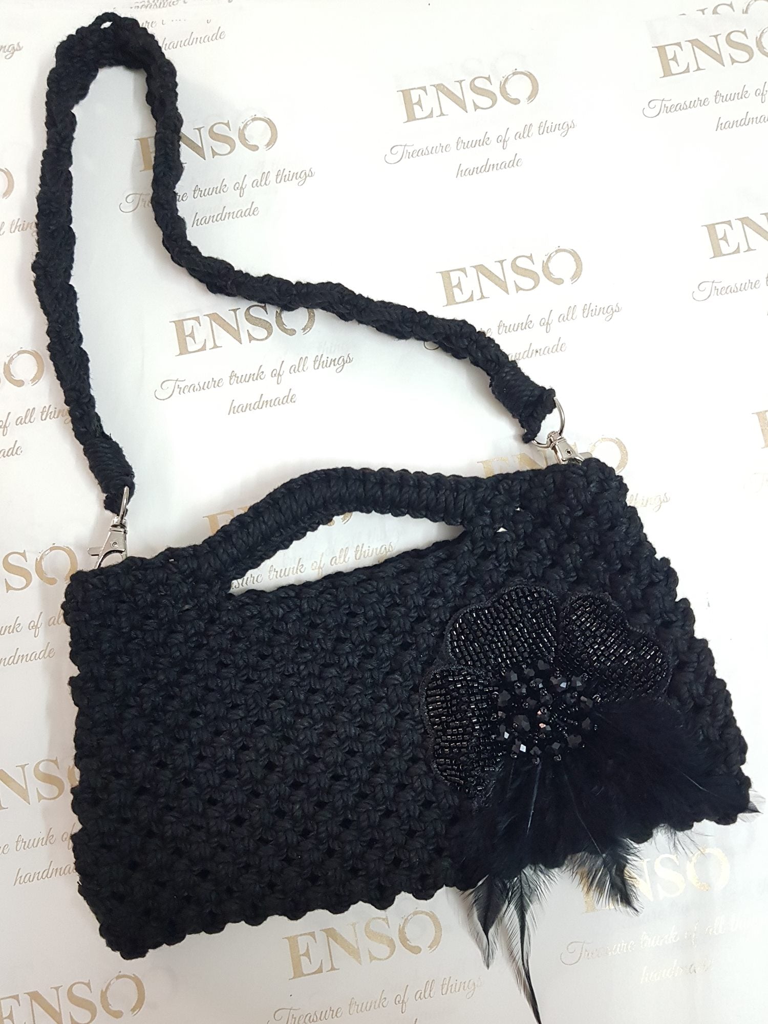 This black Enso Handmade shoulder bag features stunning glass beadwork, delicate feather details, and intricate sequin designs. Handcrafted with care, this bag is the perfect accessory for any outfit, adding a touch of elegance and sophistication. The Enso Handmade Shoulder Bag is a beautiful blend of tradition and contemporary style.