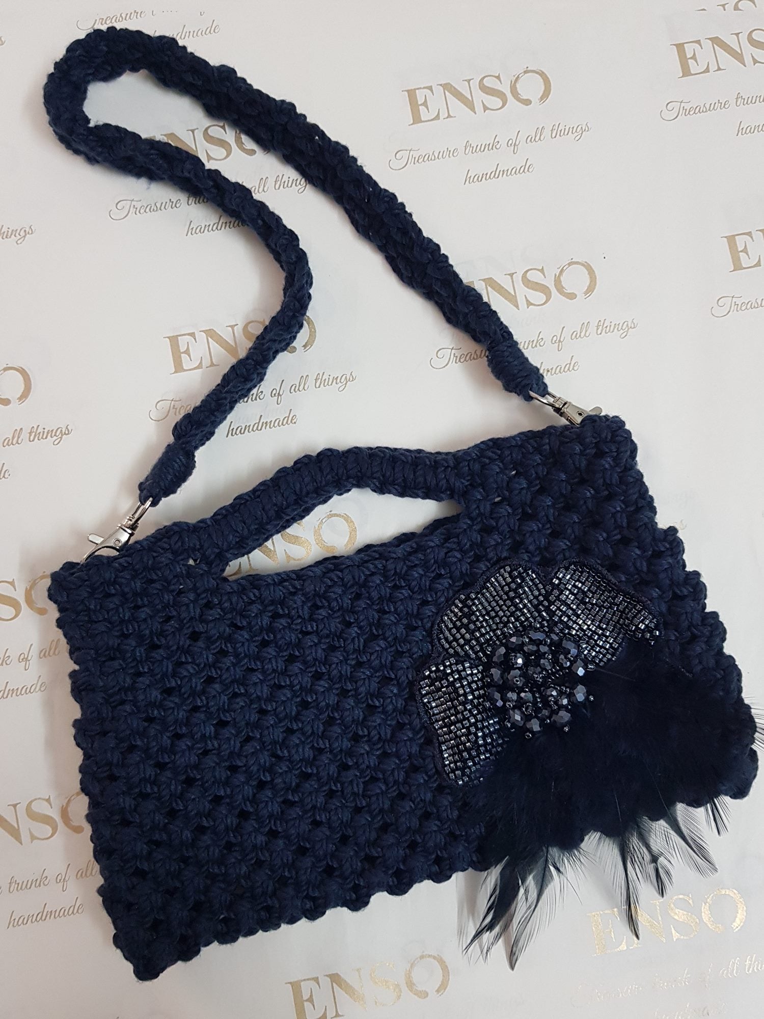 Expertly crafted, the Enso Handmade shoulder bag is adorned with macrame, glass, feathers, and sequin accents. Handmade with care using soft cotton yarn fabric, this blue bag exudes bohemian charm. Add a unique touch to any outfit while carrying your essentials in style.