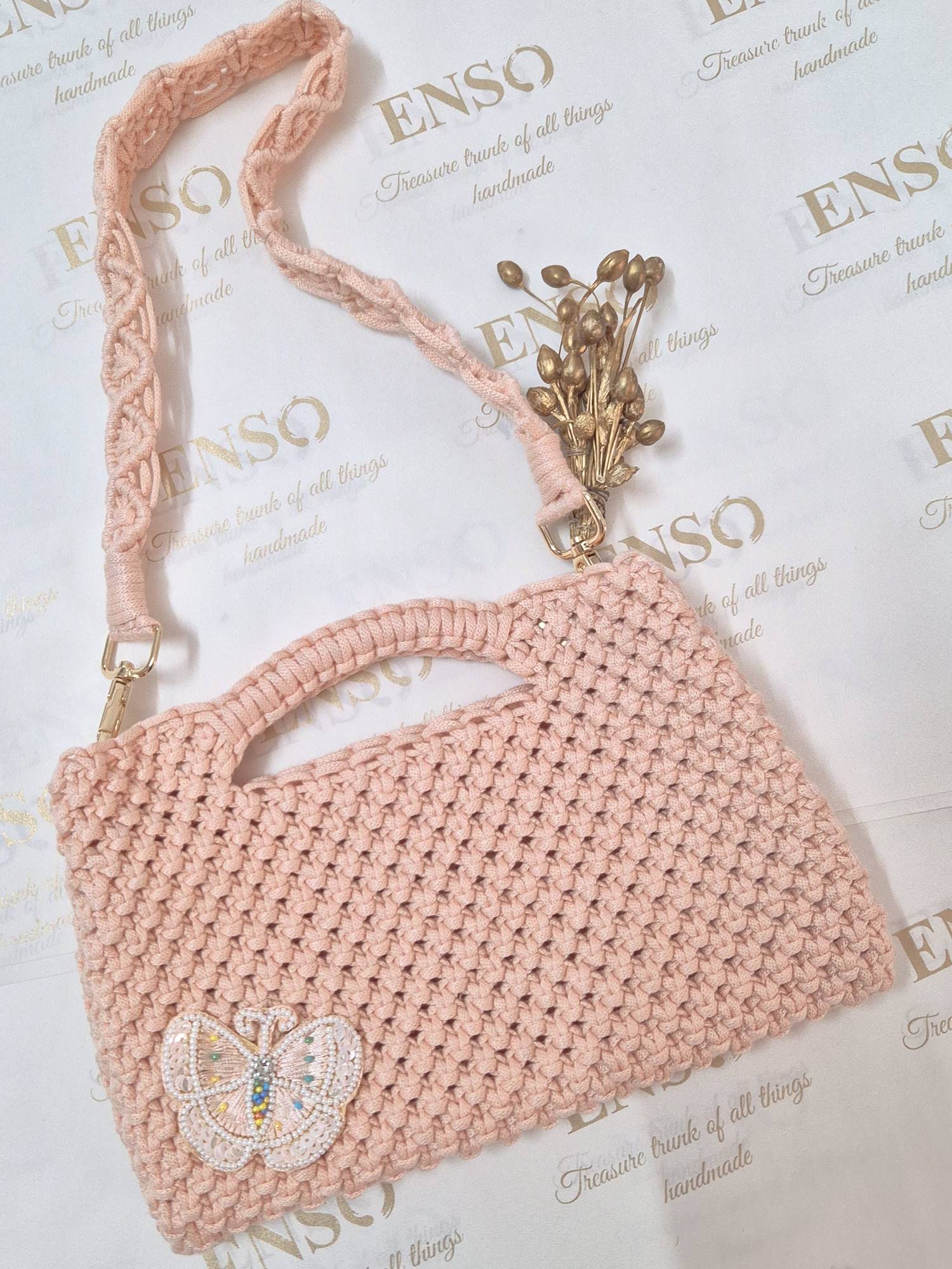 Introducing the Enso Handmade Shoulder Bag - a must-have for any fashion lover. This trendy bag features a stunning handmade macrame design embellished with glass beads and sequins. The peach color adds a touch of elegance, while the butterfly motif adds a touch of whimsy. Elevate your style with this unique and versatile accessory.
