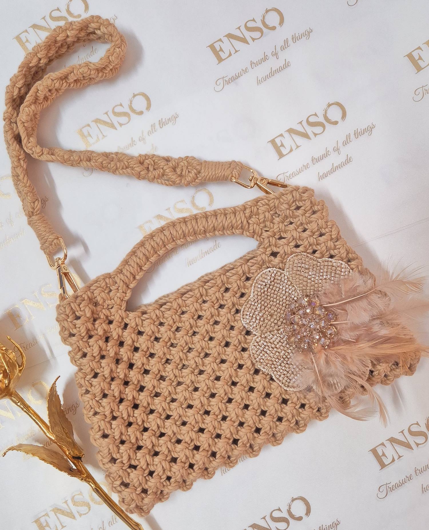 This Enso handmade shoulder bag is the perfect accessory for carrying essential items. Handcrafted with macrame, glass beads, feathers, and sequins, it adds a trendy and unique touch to any outfit. Practical and stylish, it is the ideal choice for on-the-go fashionistas.