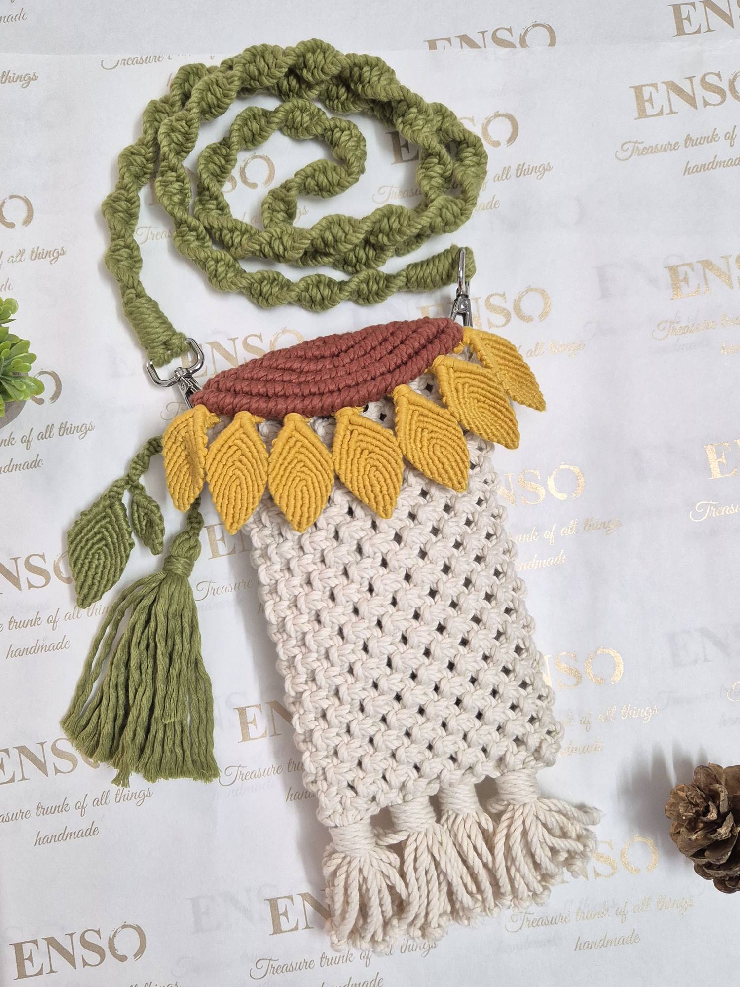 This Enso Handmade Sling Bag features a beautiful macrame sunflower design, making it a unique and stylish accessory. Handmade with care, it is a durable and eye-catching addition to any outfit. Perfect for those looking to stand out with a touch of bohemian flair.