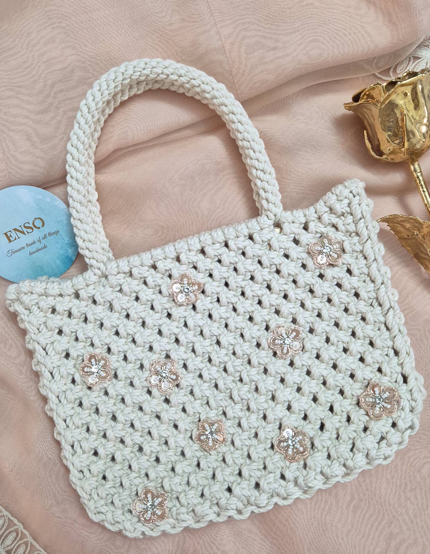 Color : Ivory Fabric : Cotton Yarn Work : Macrame with sequins flowers |