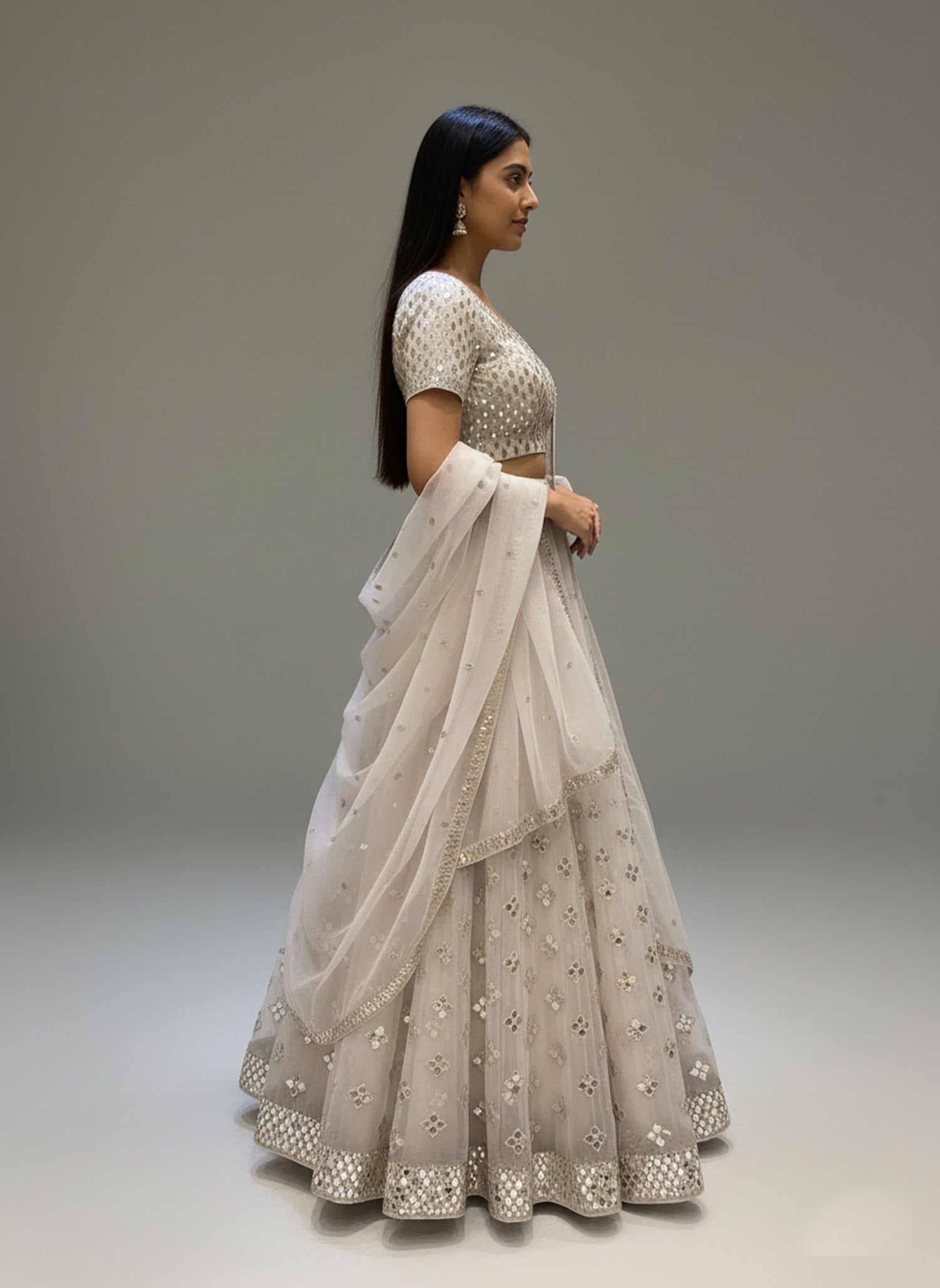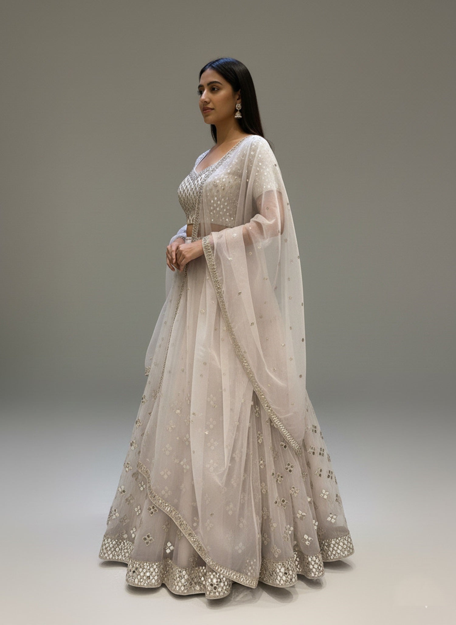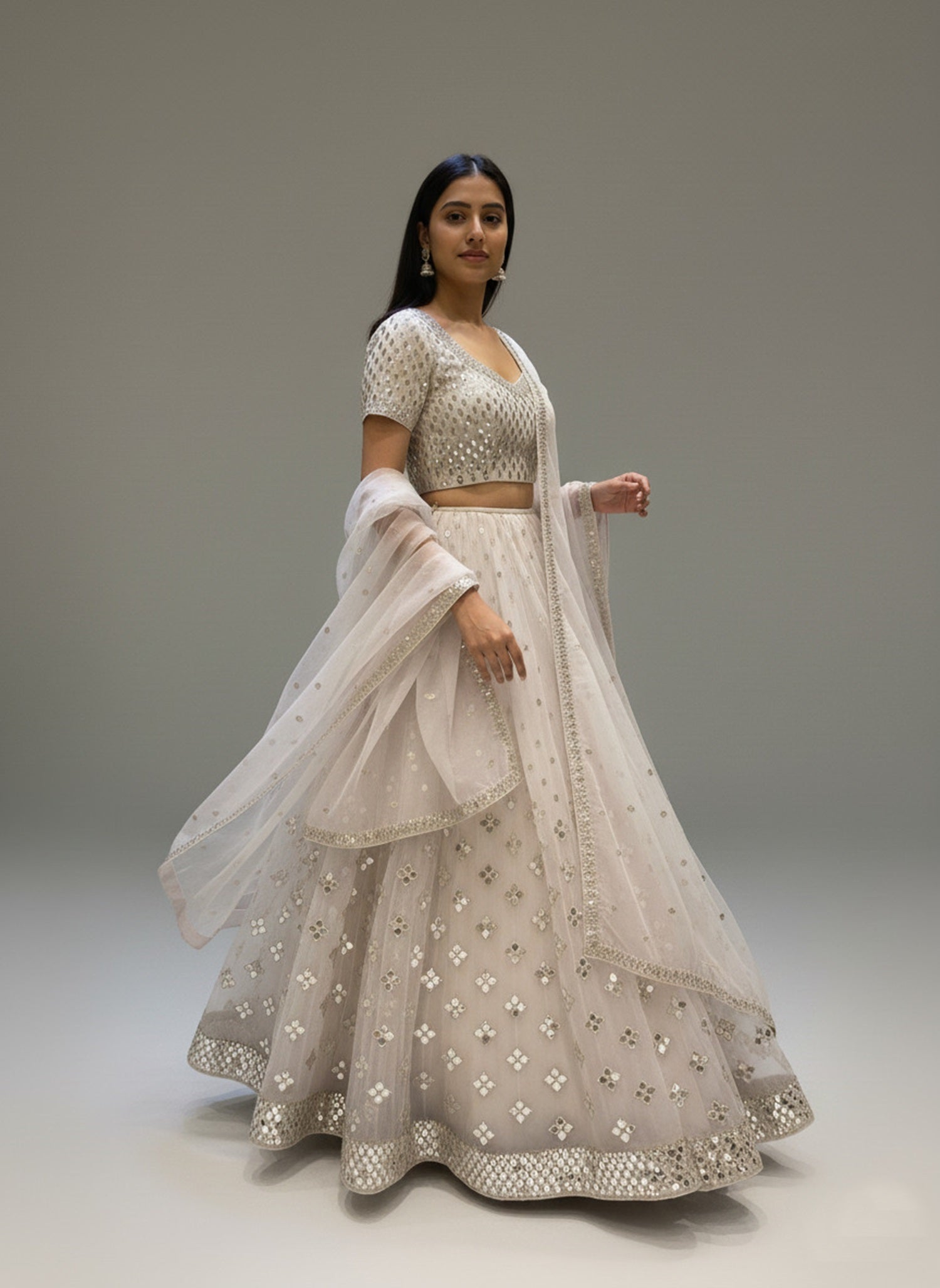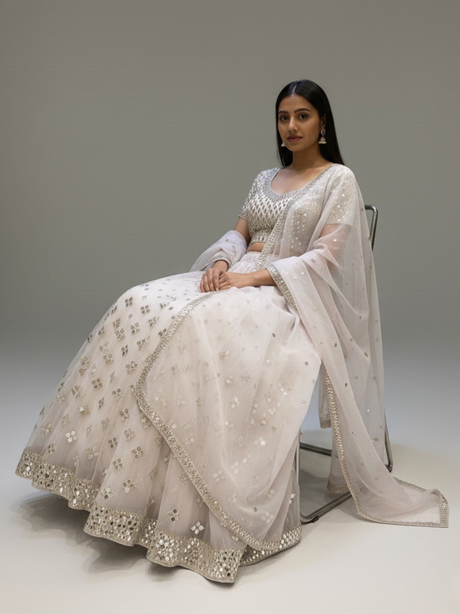 Elevate your festive occasions with the Ranas Aari & Mirror Work Lehenga, crafted from delicate organza fabric. This party wear ensemble features intricate Aari embroidery paired with reflective mirror accents, creating a sophisticated and radiant look. Lightweight and graceful, it offers both comfort and style, perfect for celebrations where you want to make a stunning impression.