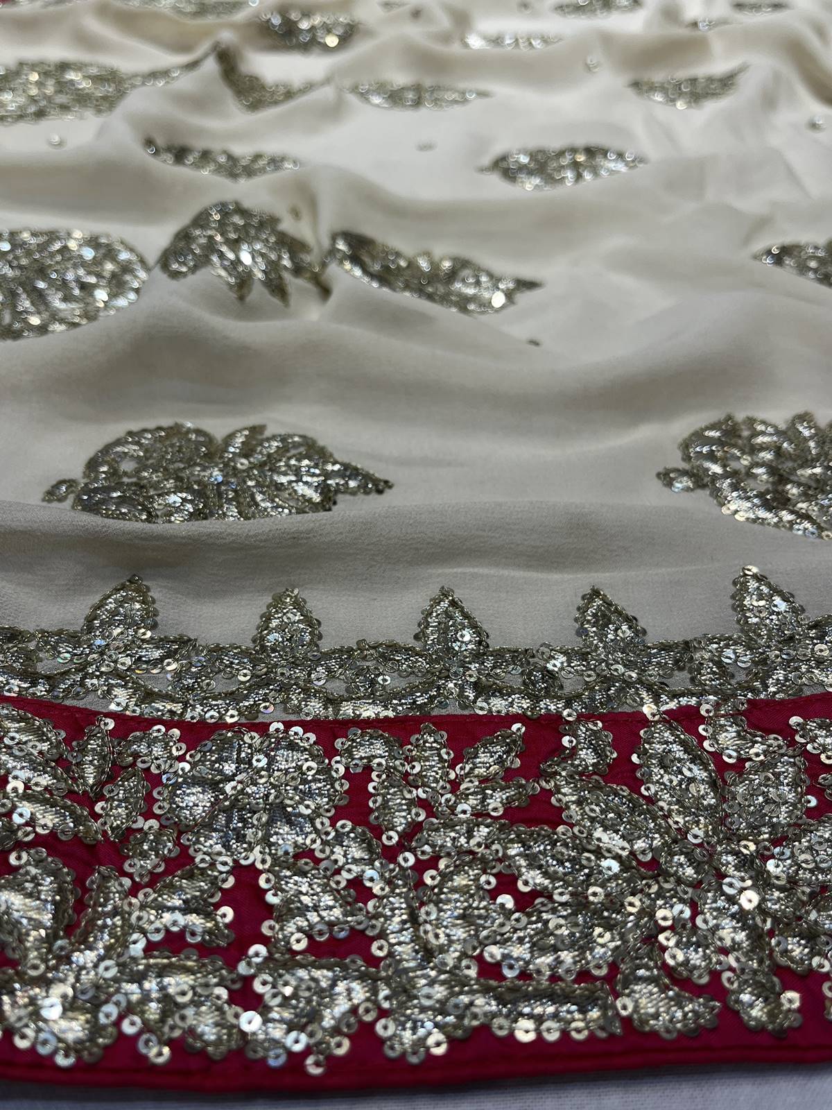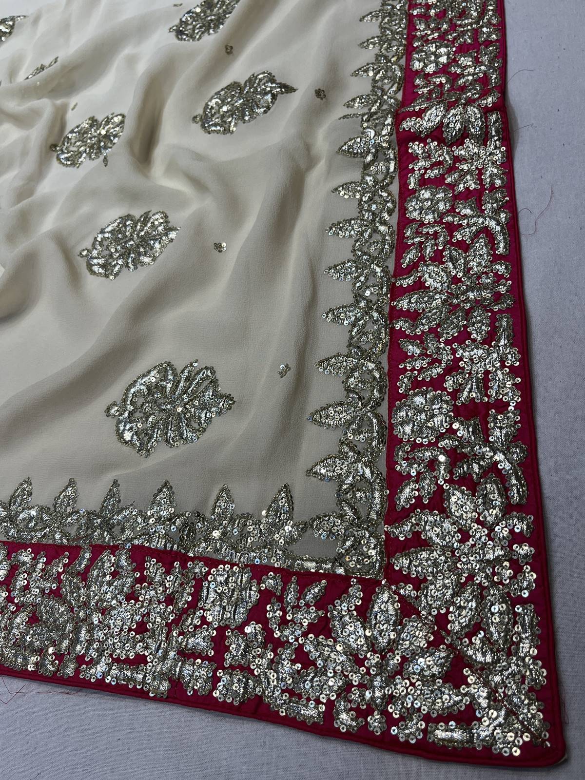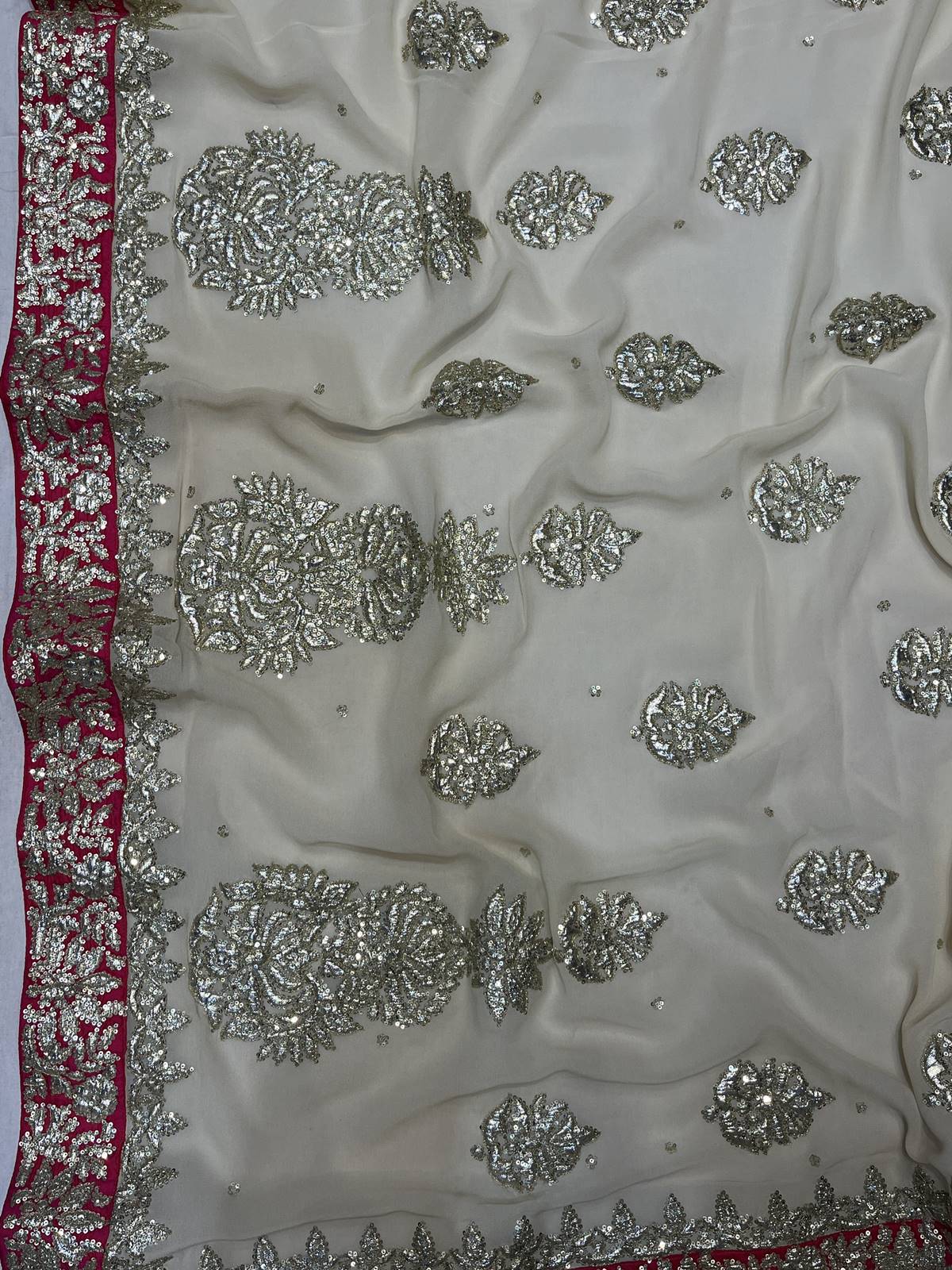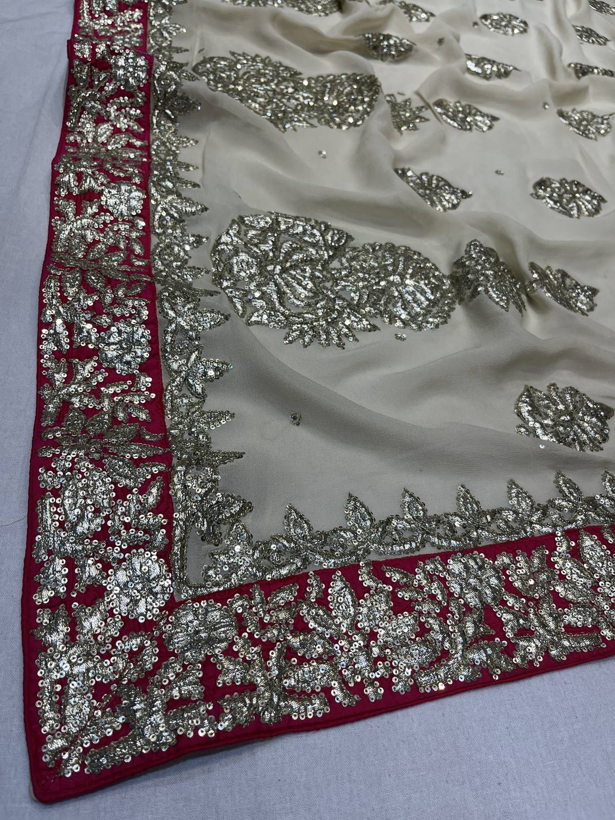 Saree Color : Beige Saree Fabric : Georgette Saree Work : Sequins & Lappa Blouse Color : Rani Blouse Fabric : Silk Blouse Work : Sequins & Lappa |