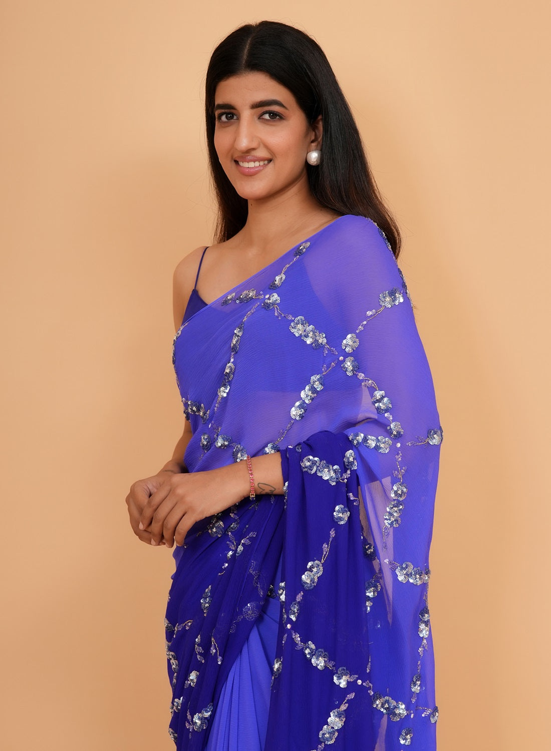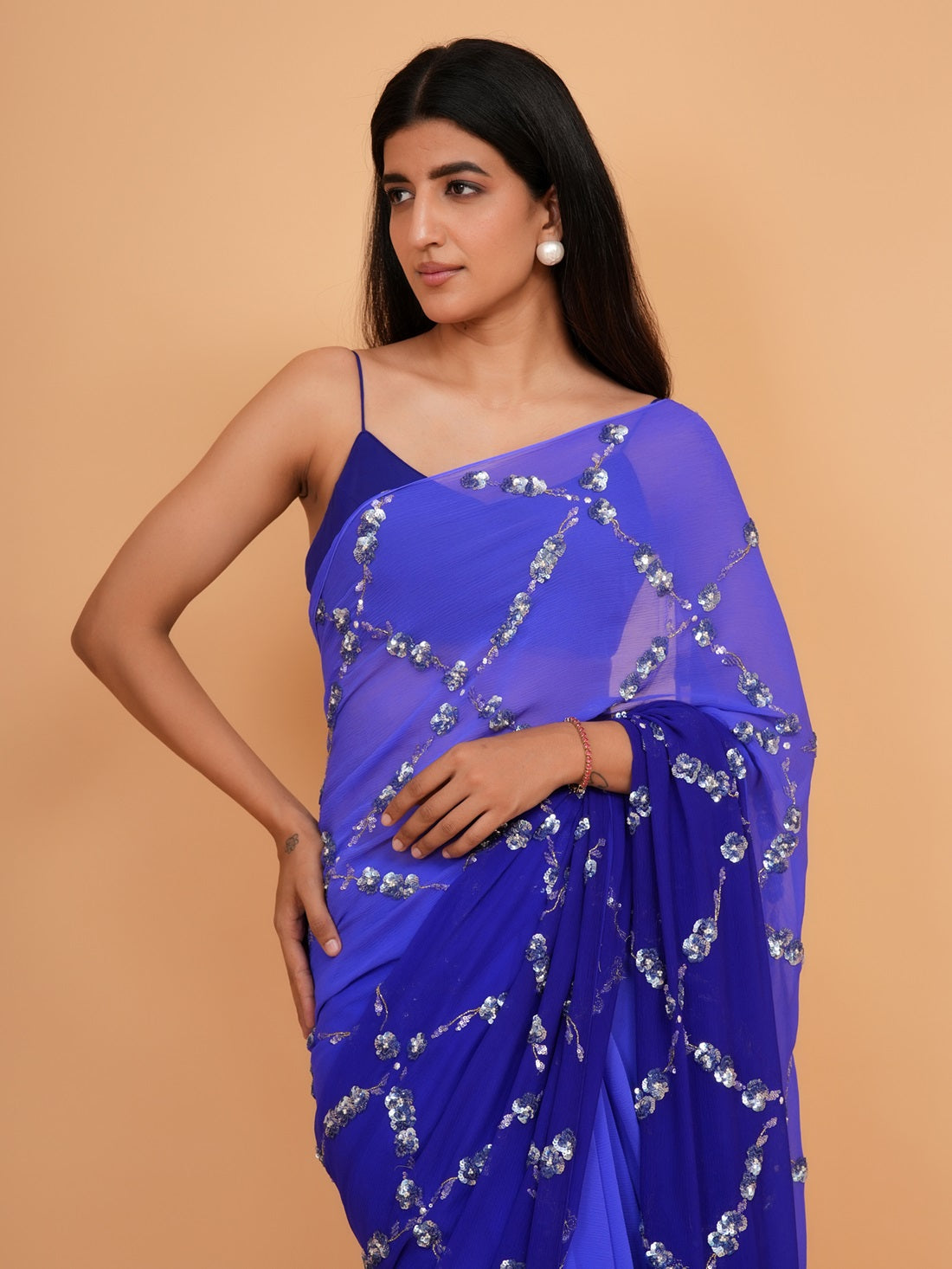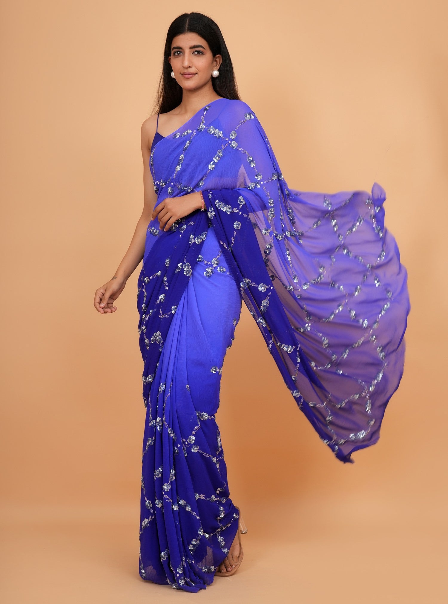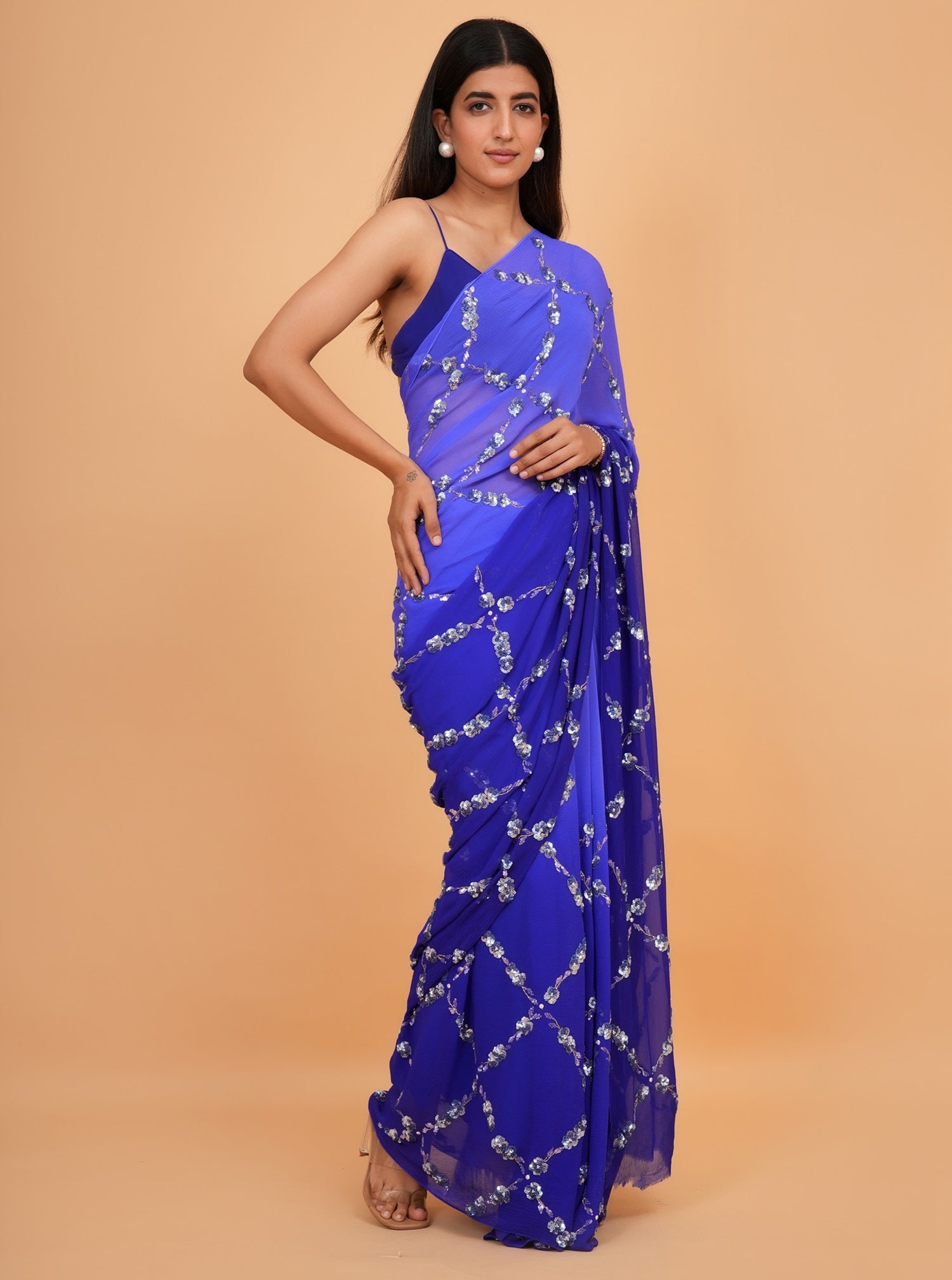 Saree Color : Shaded Blue Saree Fabric : Pure Chiffon Saree Work : Sequine & Cutdana Blouse Color : Blue Blouse Fabric : Crepe Blouse Work : Sequine & Cutdana |