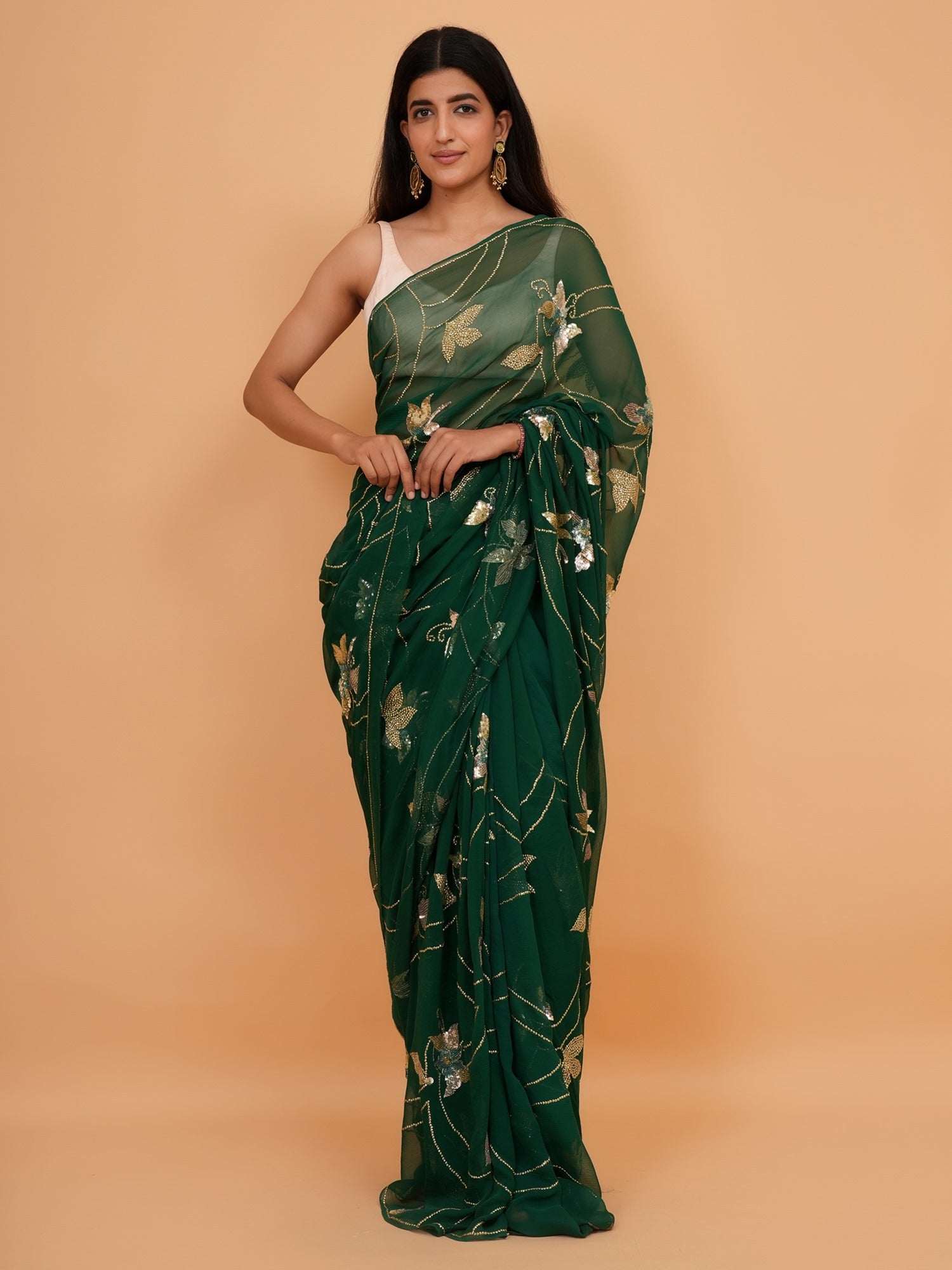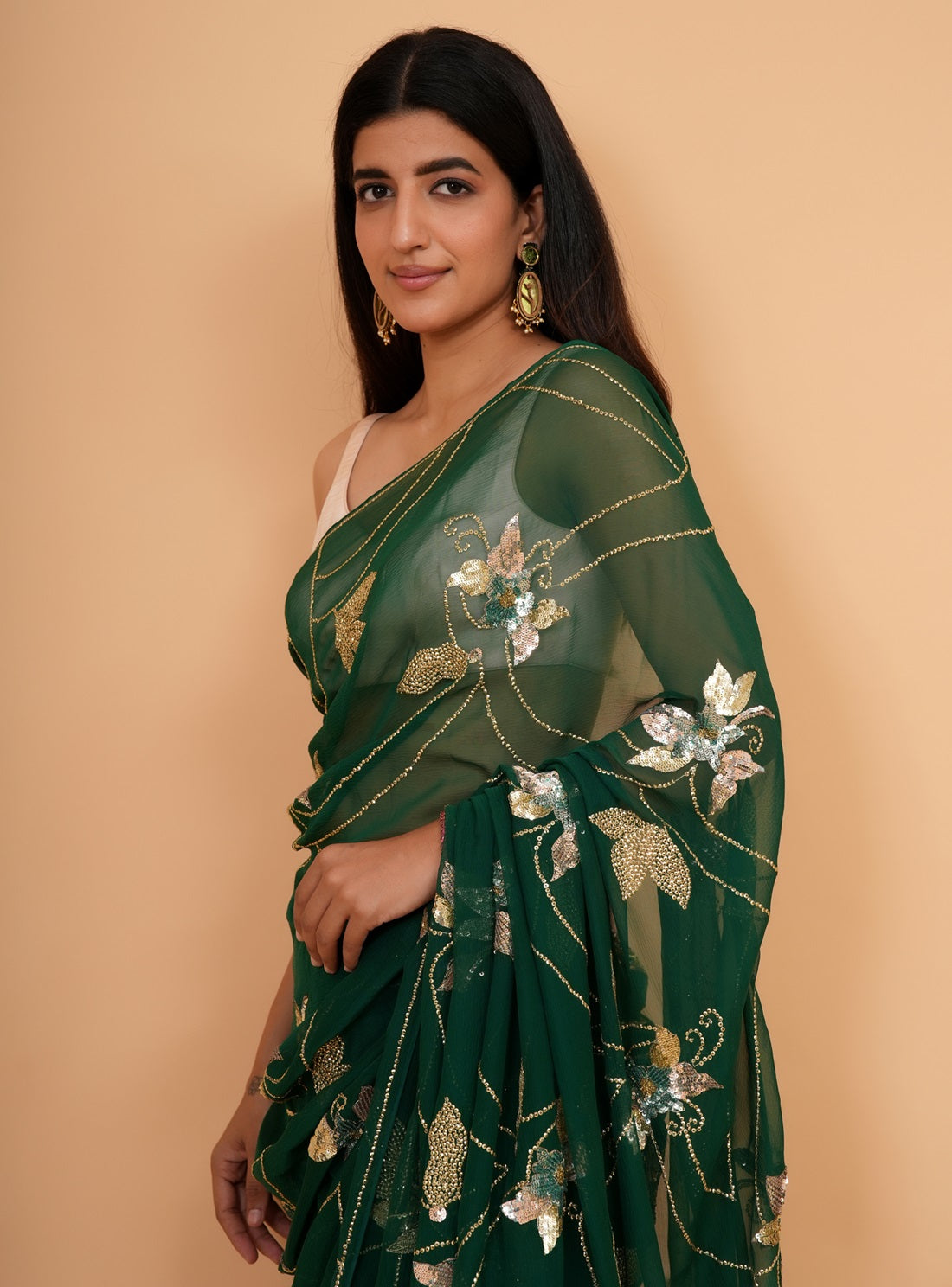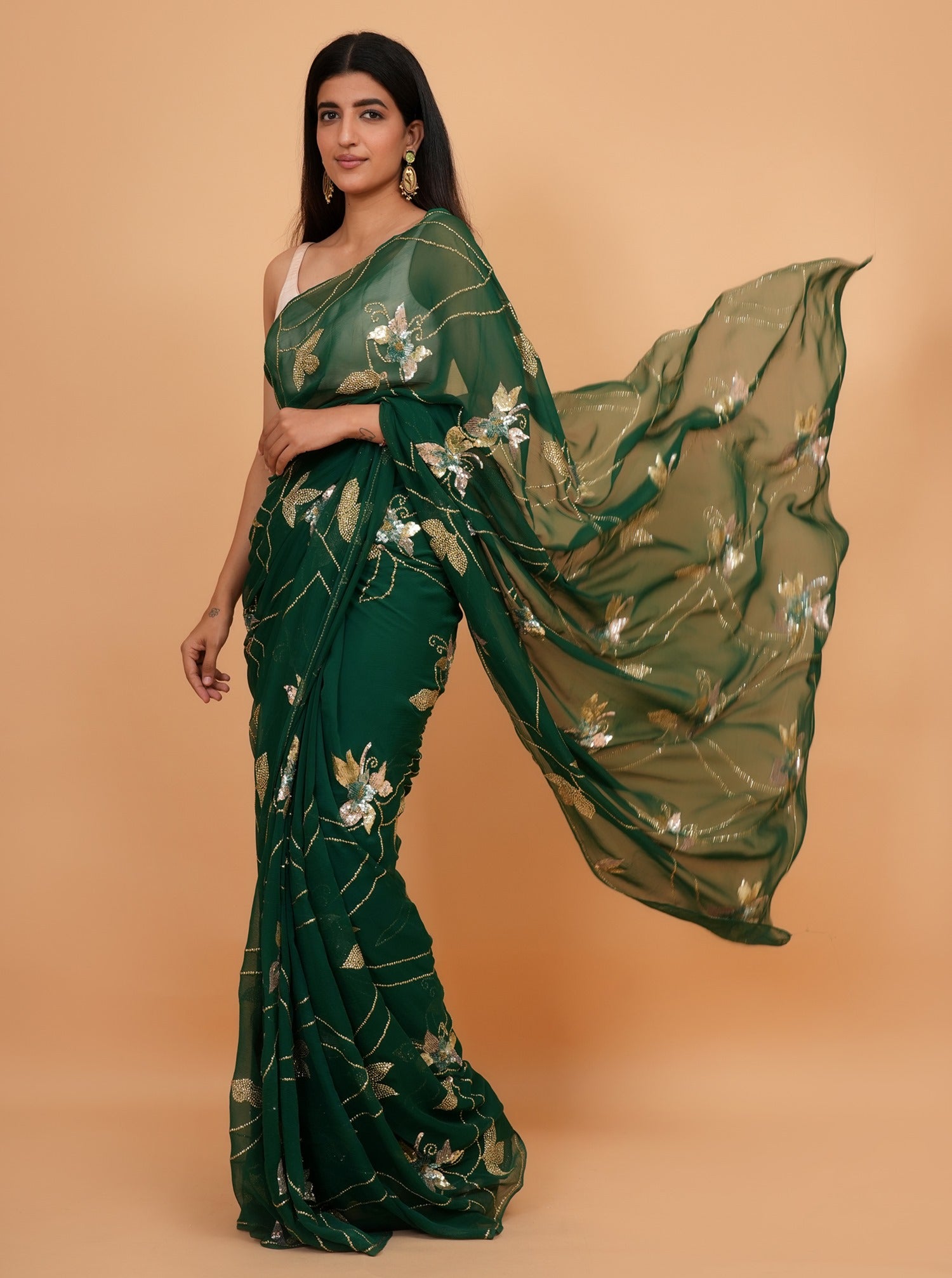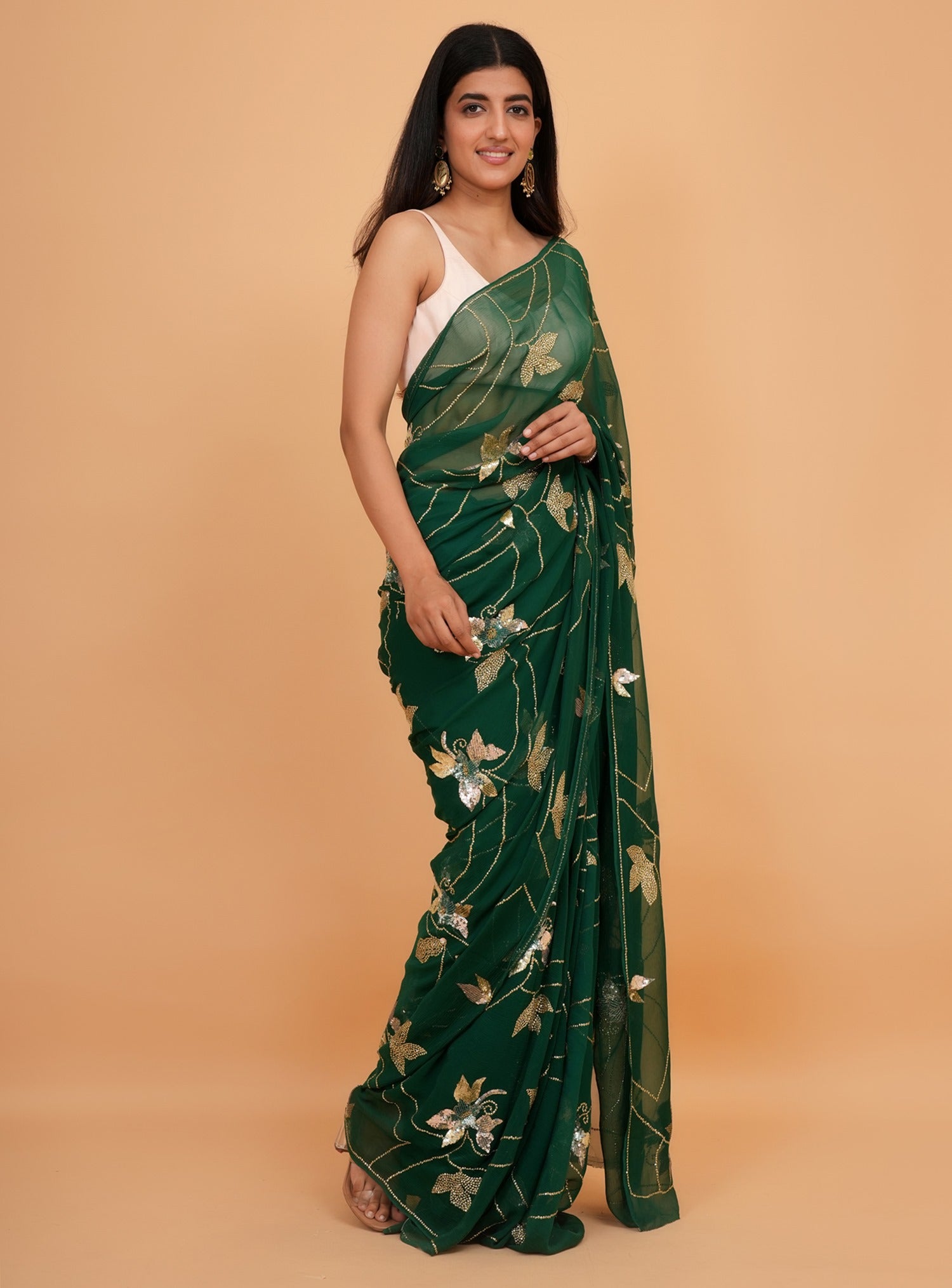 Elevate your wardrobe with the Ranas Bottle Green Sequine Work Saree, crafted from pure chiffon for a graceful drape. Featuring intricate aari taari and sequined embellishments, this saree exudes elegance and contemporary charm. It comes with a matching blouse fabric adorned with the same detailed work, ensuring a coordinated and fashionable look perfect for any special occasion.