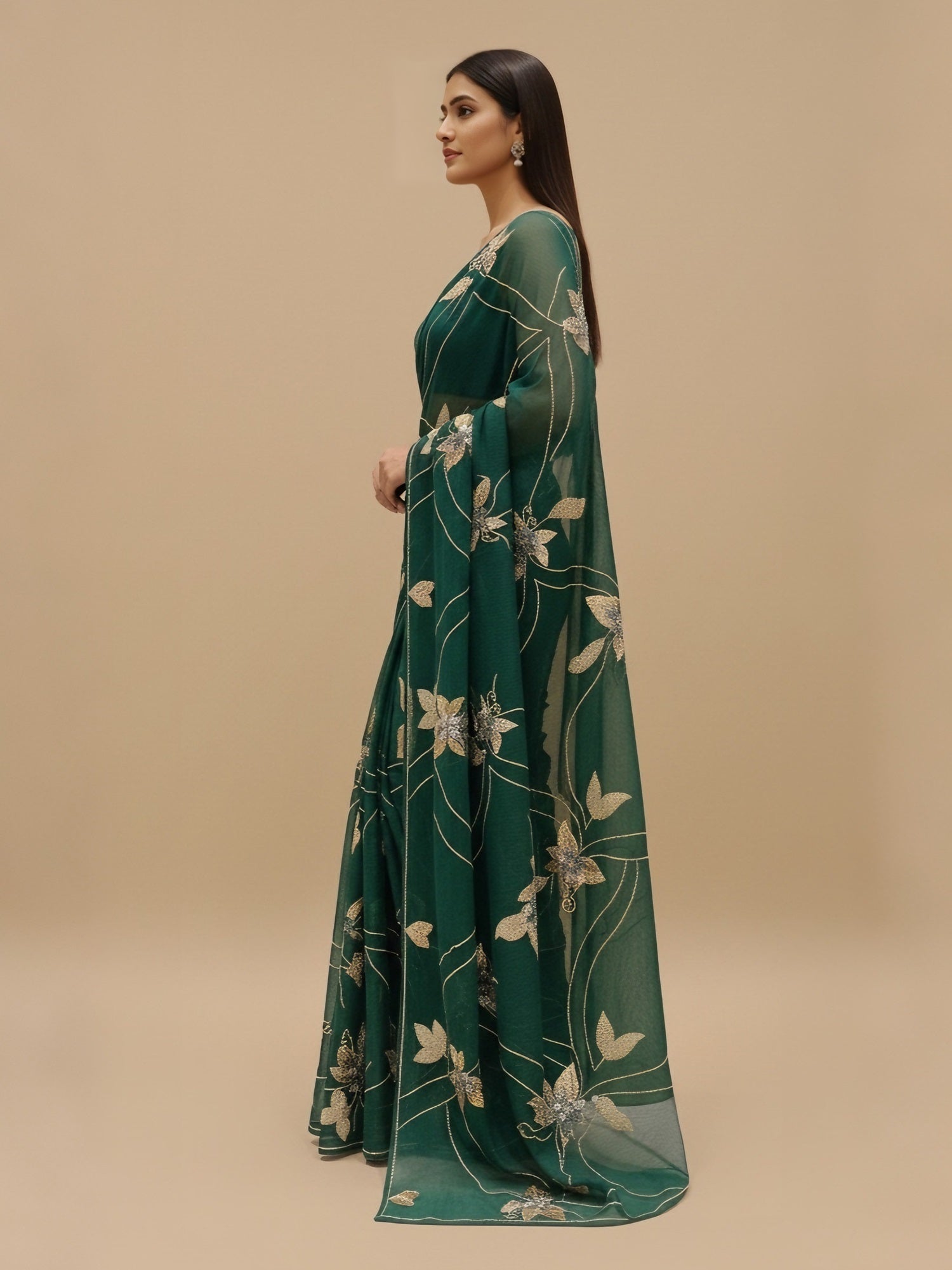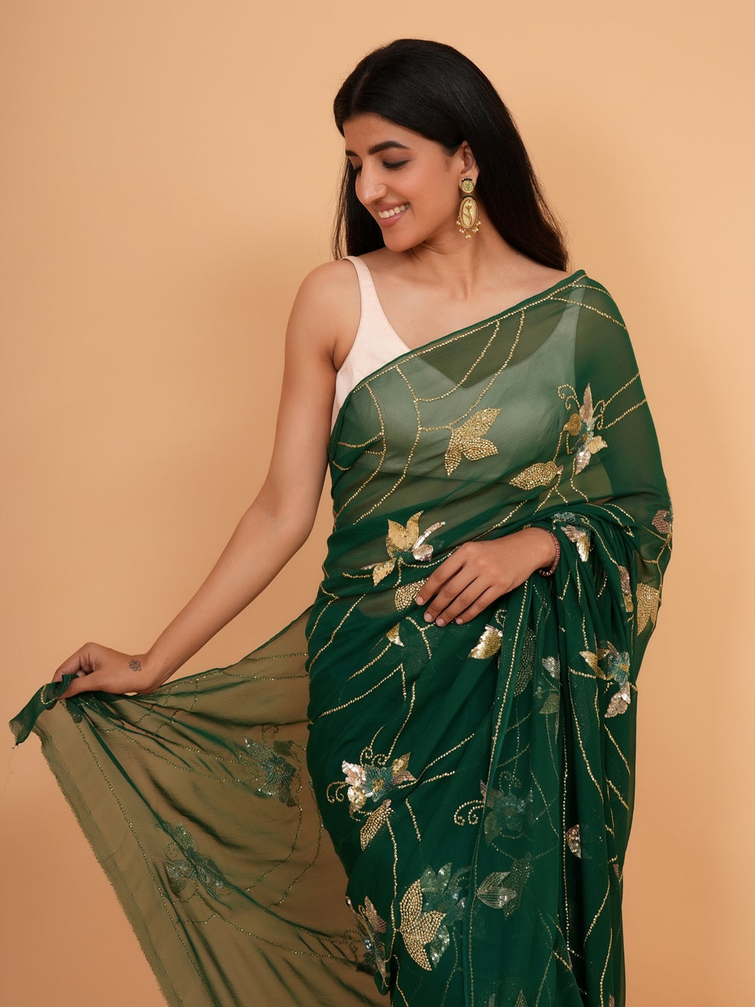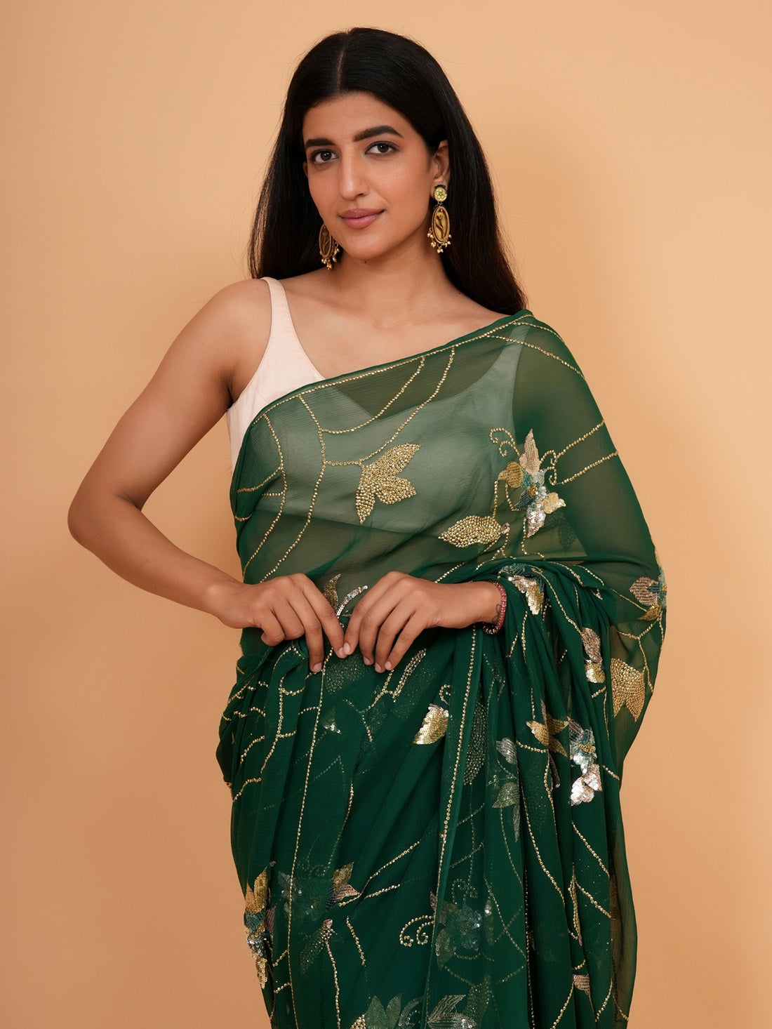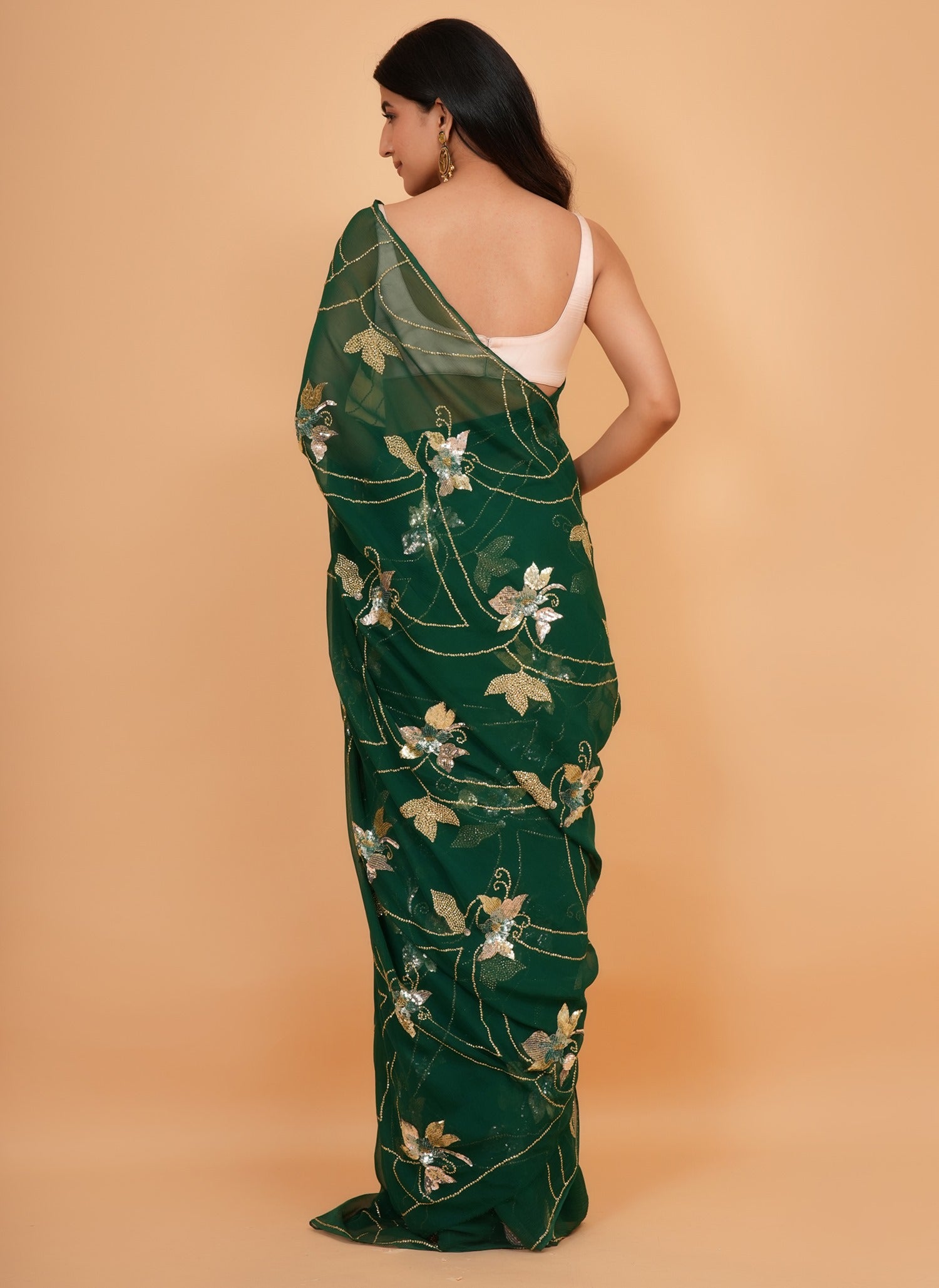 Elevate your wardrobe with the Ranas Bottle Green Sequine Work Saree, crafted from pure chiffon for a graceful drape. Featuring intricate aari taari and sequined embellishments, this saree exudes elegance and contemporary charm. It comes with a matching blouse fabric adorned with the same detailed work, ensuring a coordinated and fashionable look perfect for any special occasion.