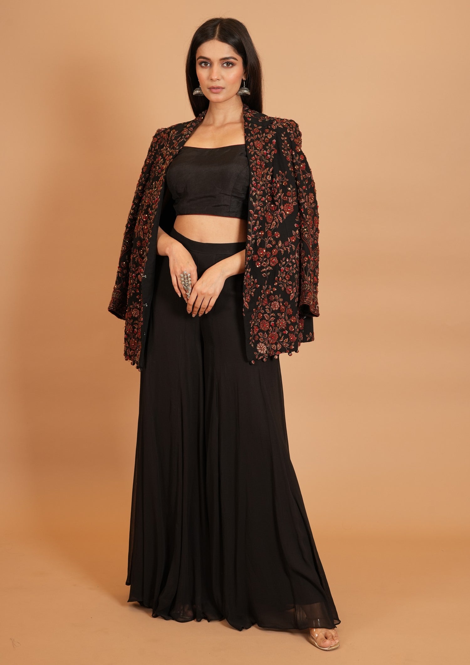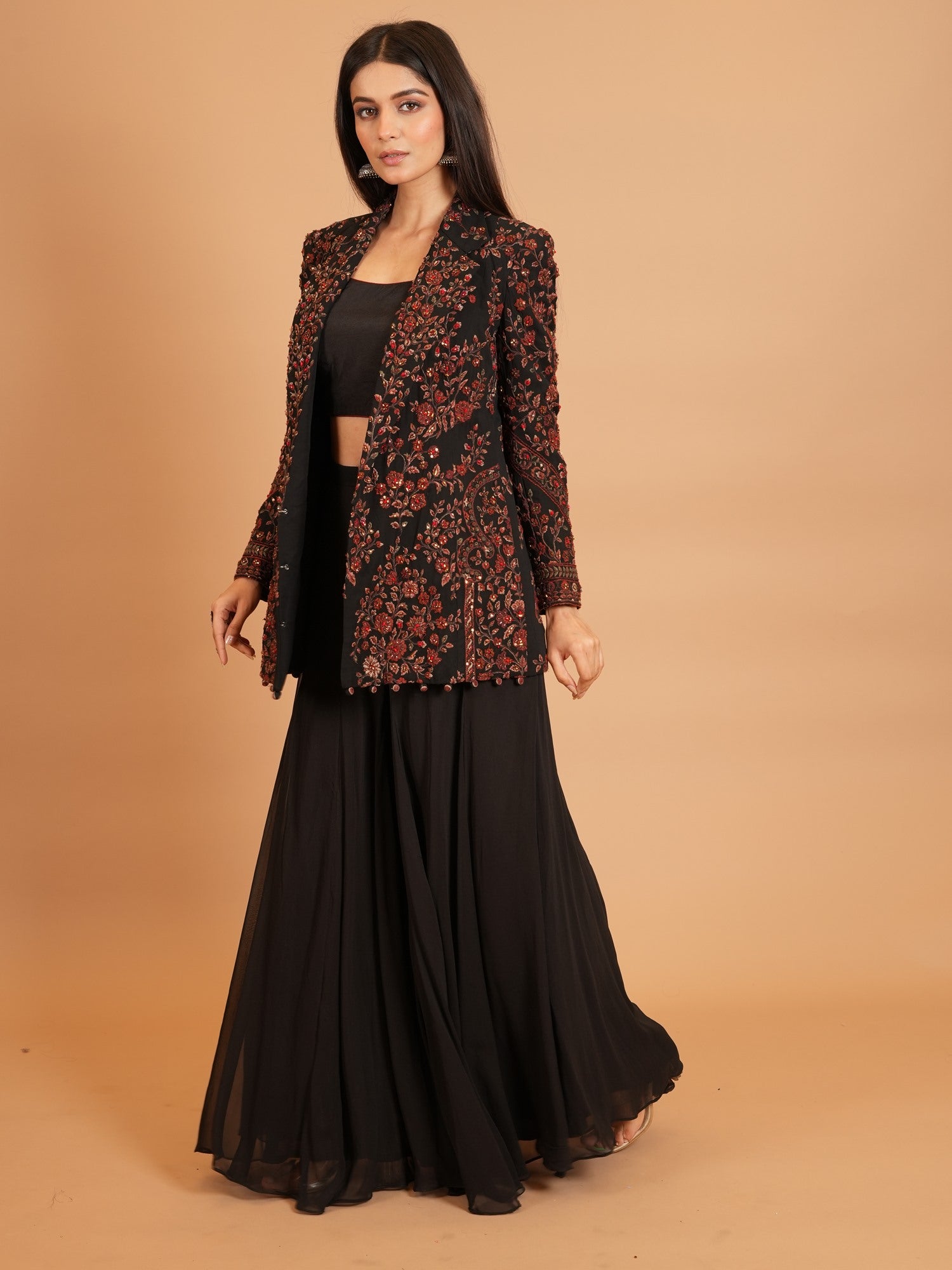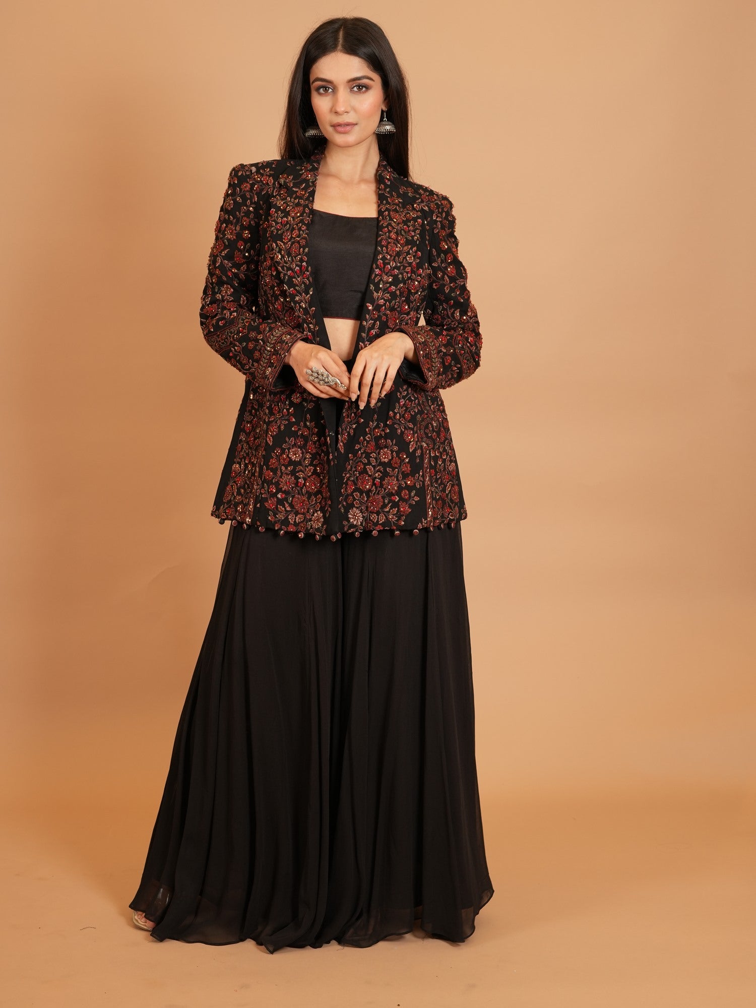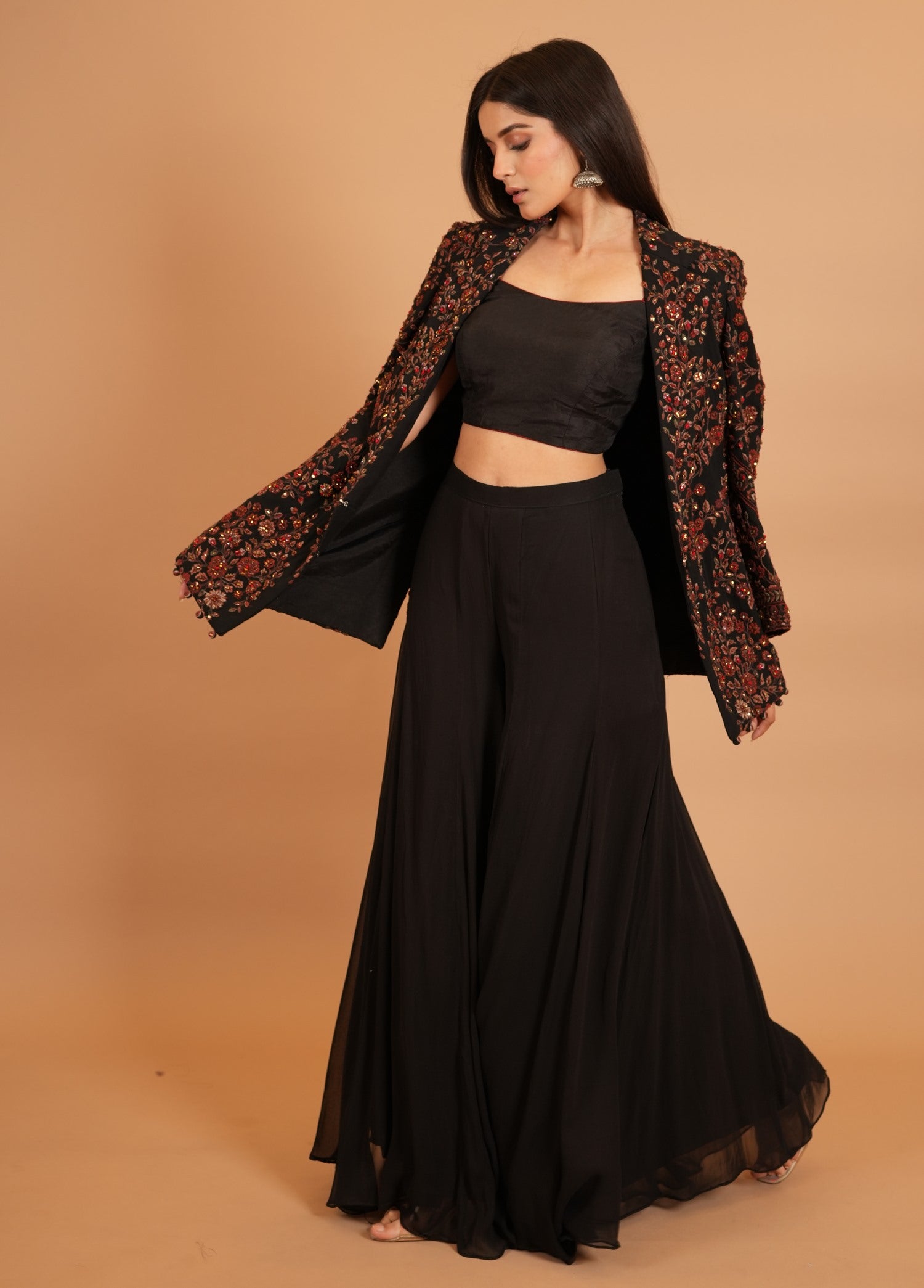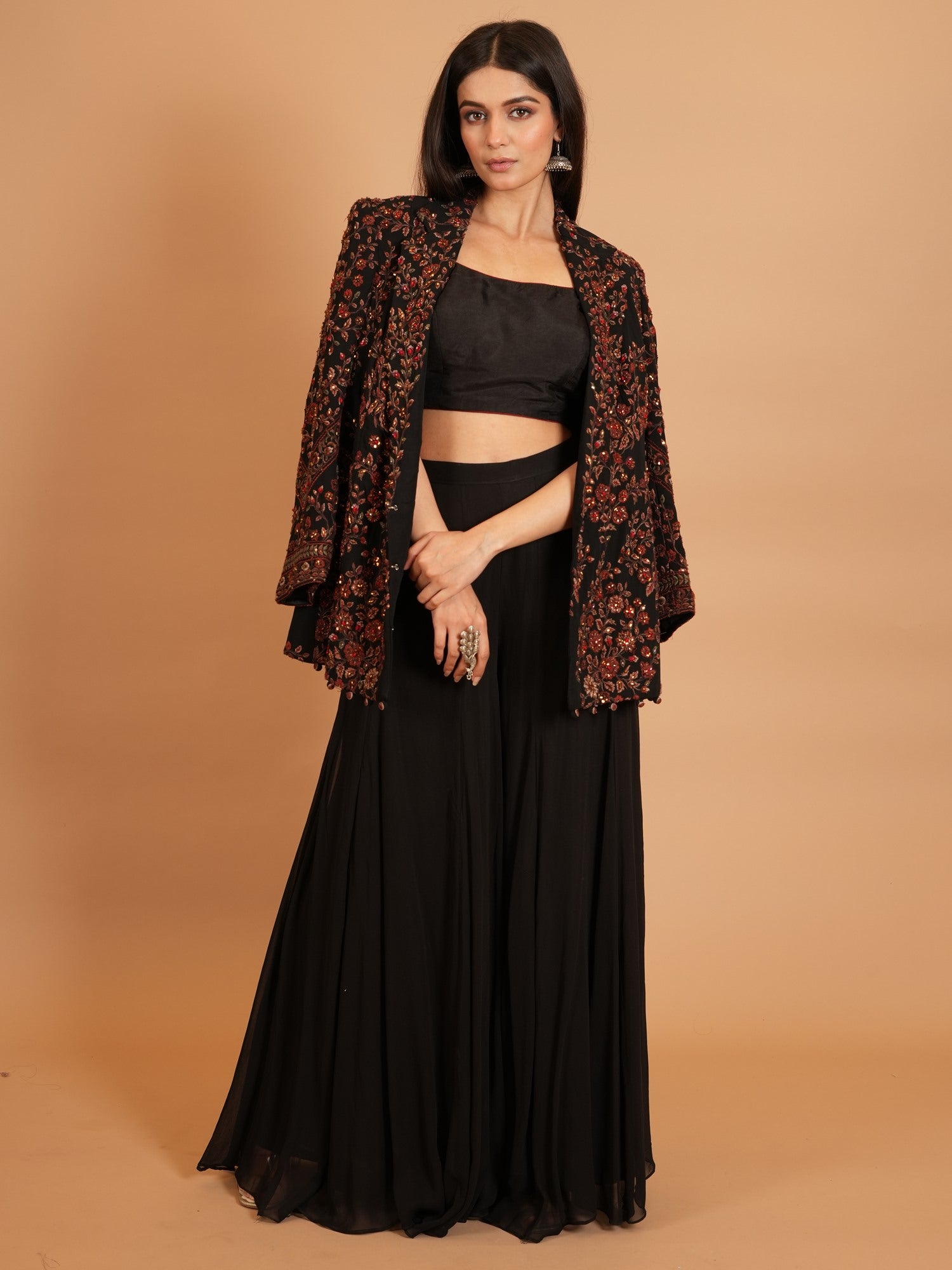 Jacket Color : Black Jacket Fabric : Georgette Jacket Work : Resham , Cutdana Blouse Color : BlackΒ Blouse Fabric : Art Silk Blouse Work : Resham , Cutdana Bottom Type : Plazo Plazo Color : BlackΒ Plazo Fabric : Art Georgette |