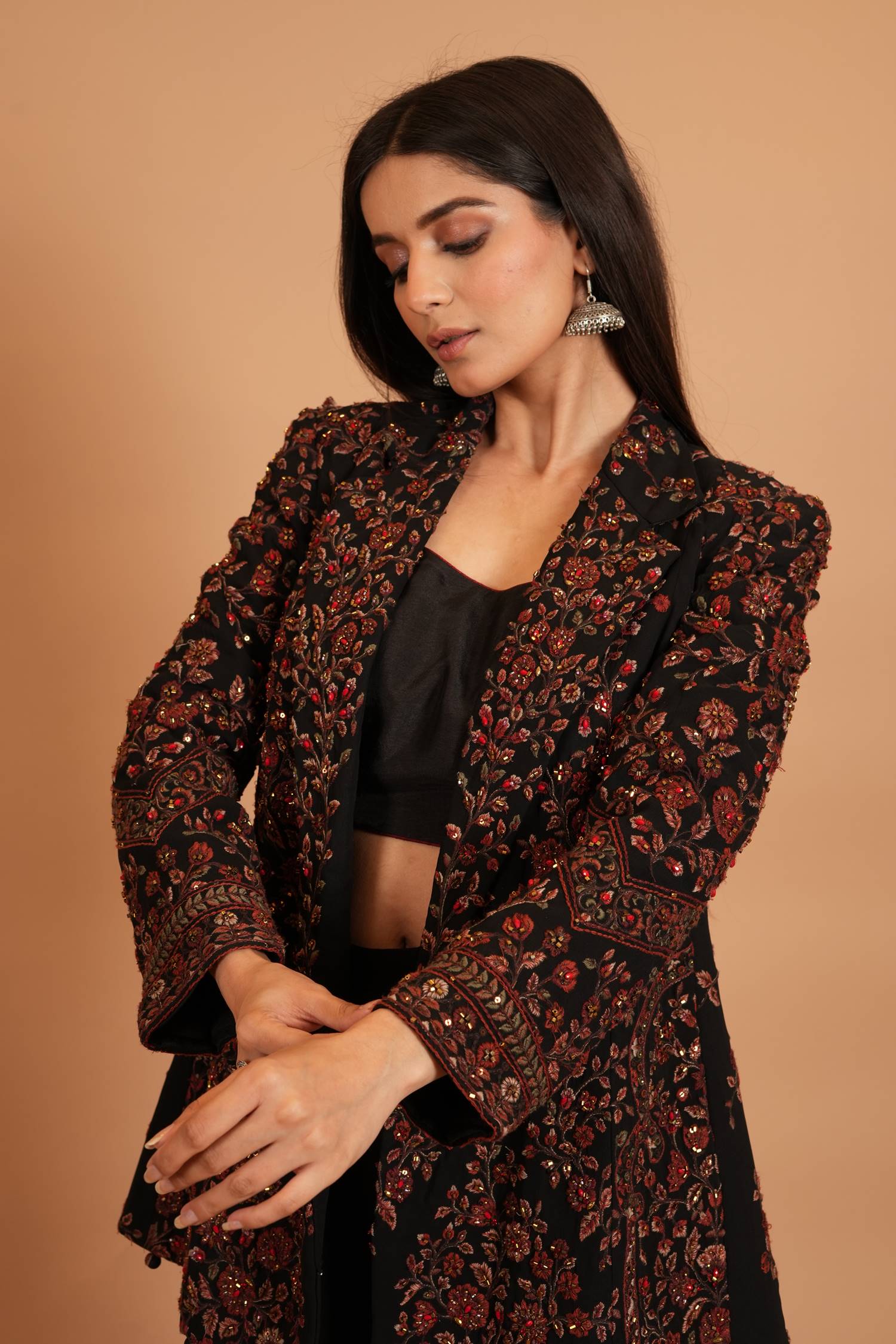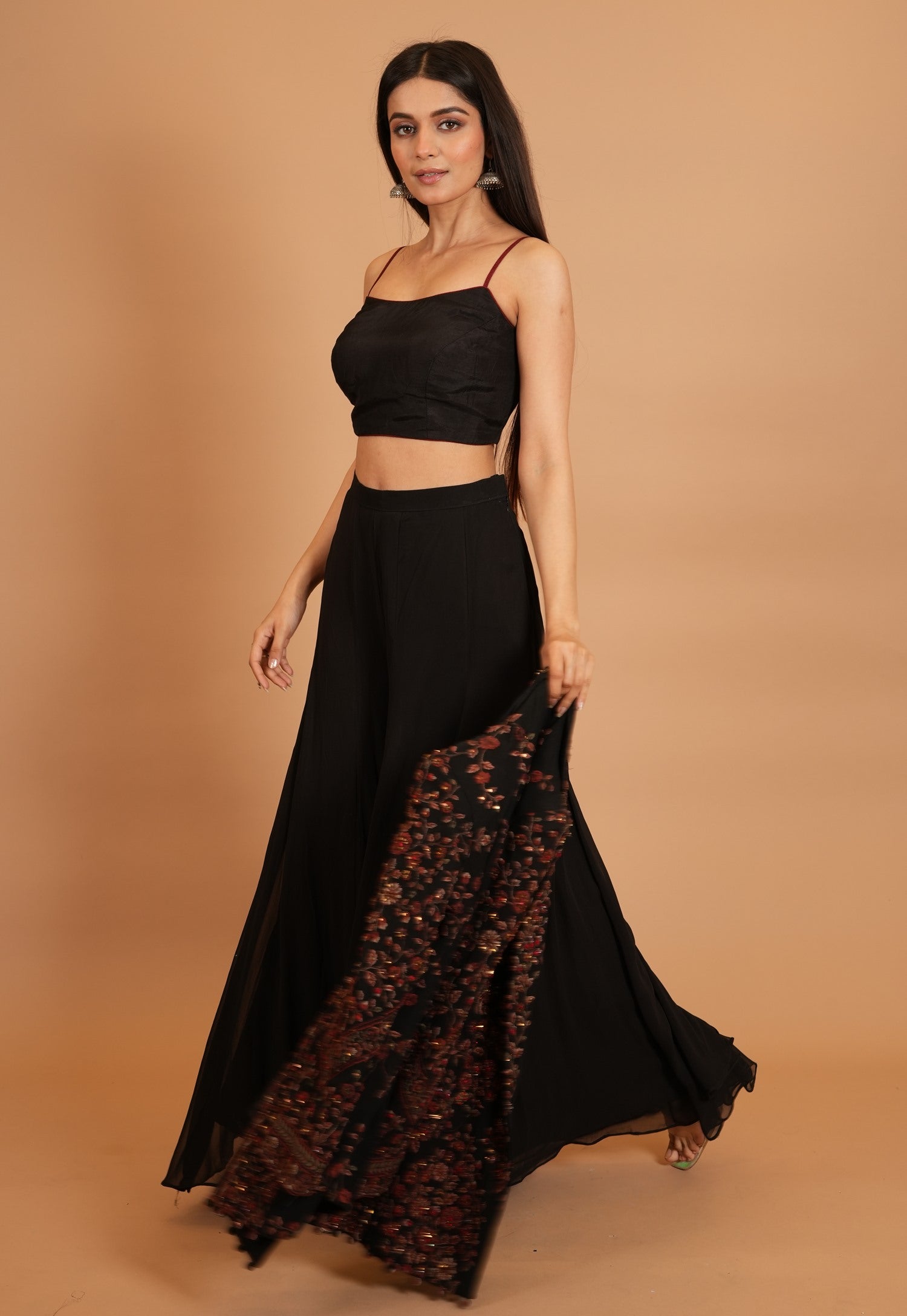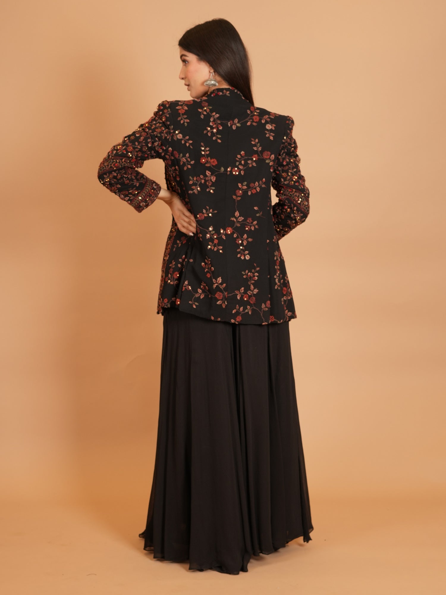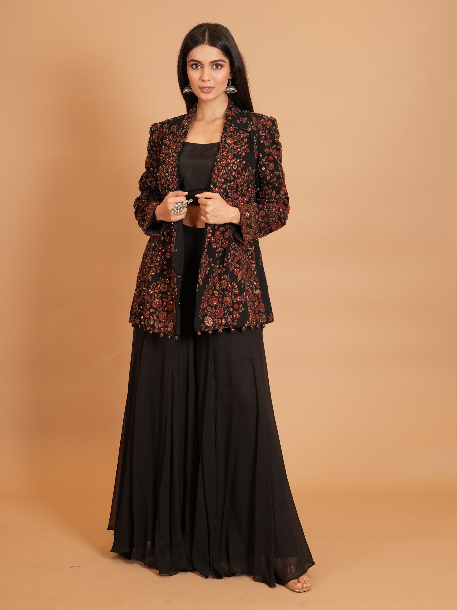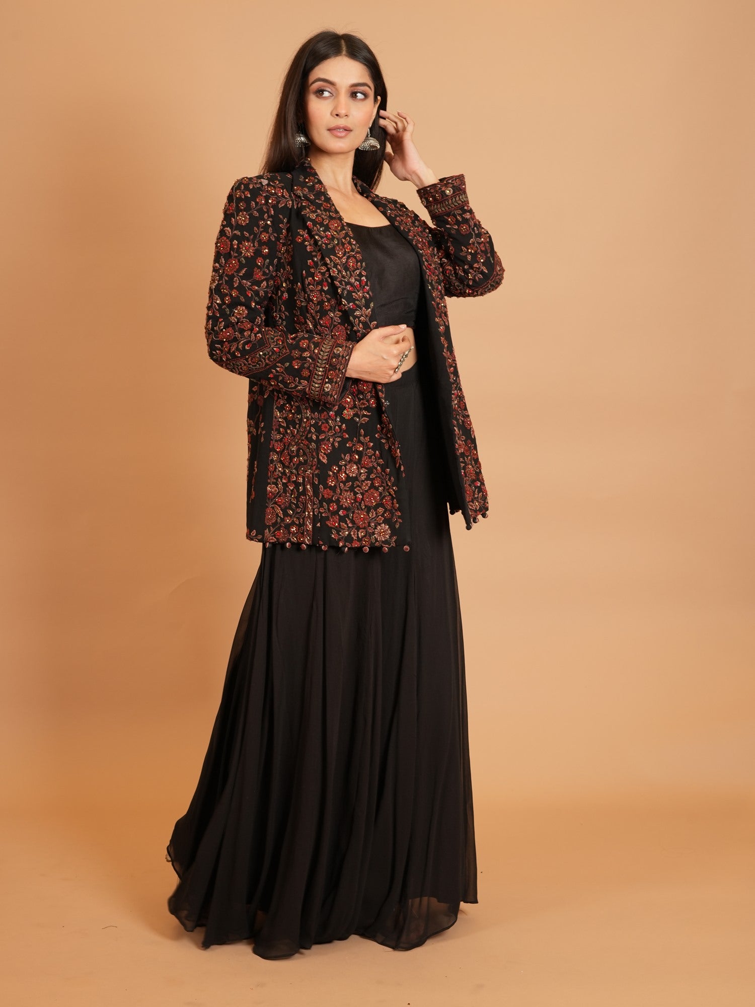 Jacket Color : Black Jacket Fabric : Georgette Jacket Work : Resham , Cutdana Blouse Color : BlackΒ Blouse Fabric : Art Silk Blouse Work : Resham , Cutdana Bottom Type : Plazo Plazo Color : BlackΒ Plazo Fabric : Art Georgette |
