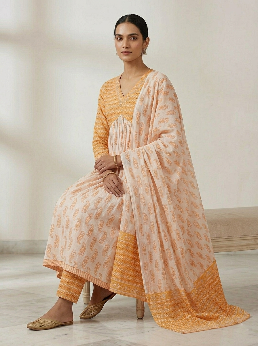 Kurta Color : White & Peach Kurta Fabric : Cotton Kurta Work : Block Print & Sequine Dupatta Color : White & Peach Dupatta Fabric : Cotton Dupatta Work : Printed Bottom Type : Pant Pant Color : Peach Pant Fabric : Cotton |