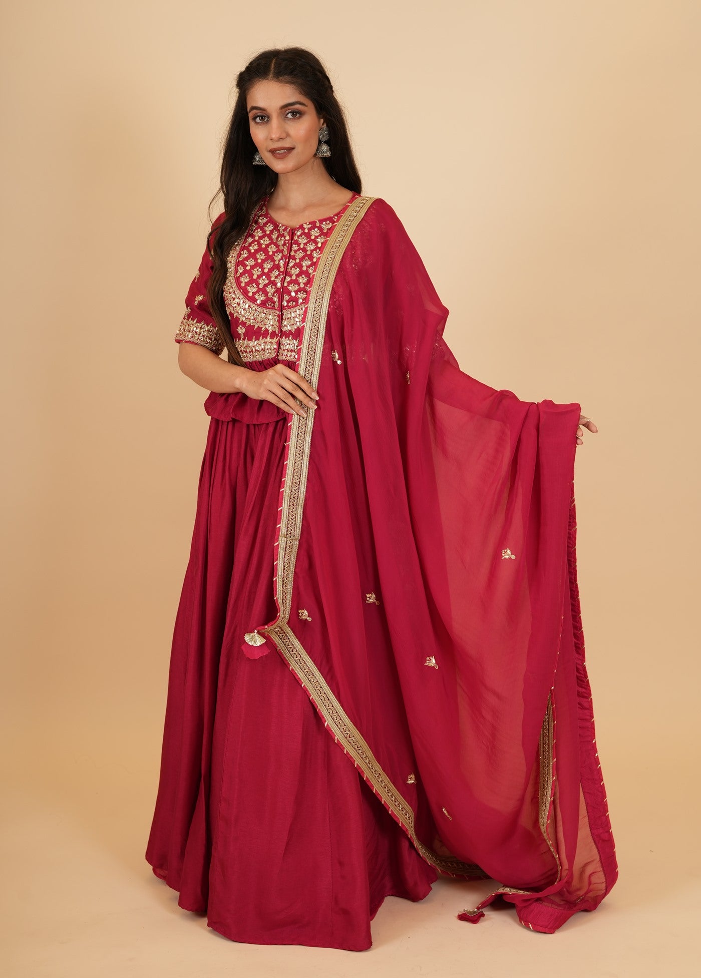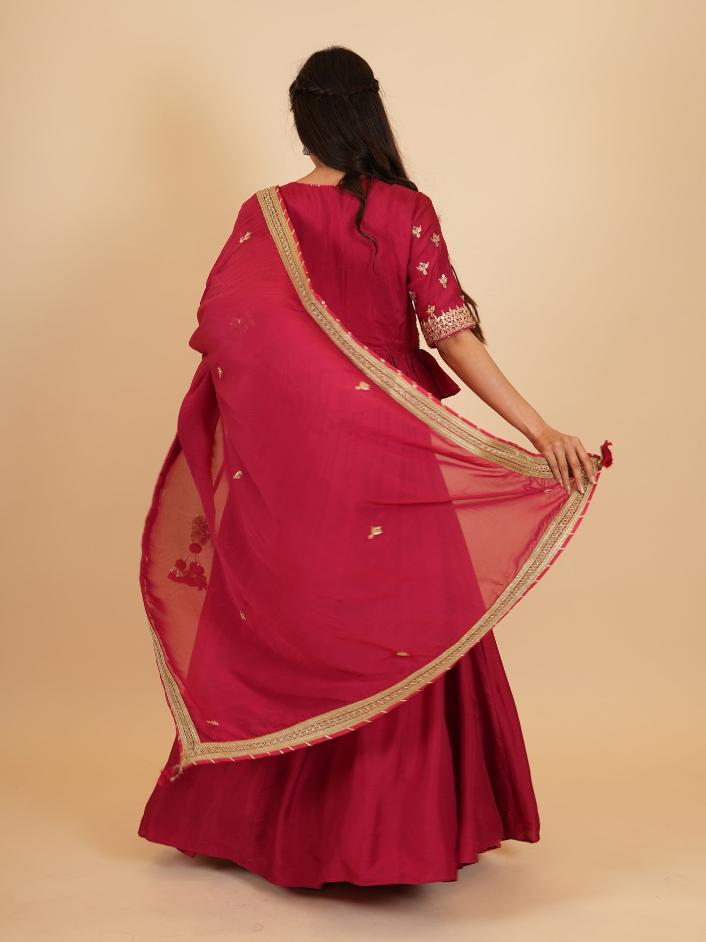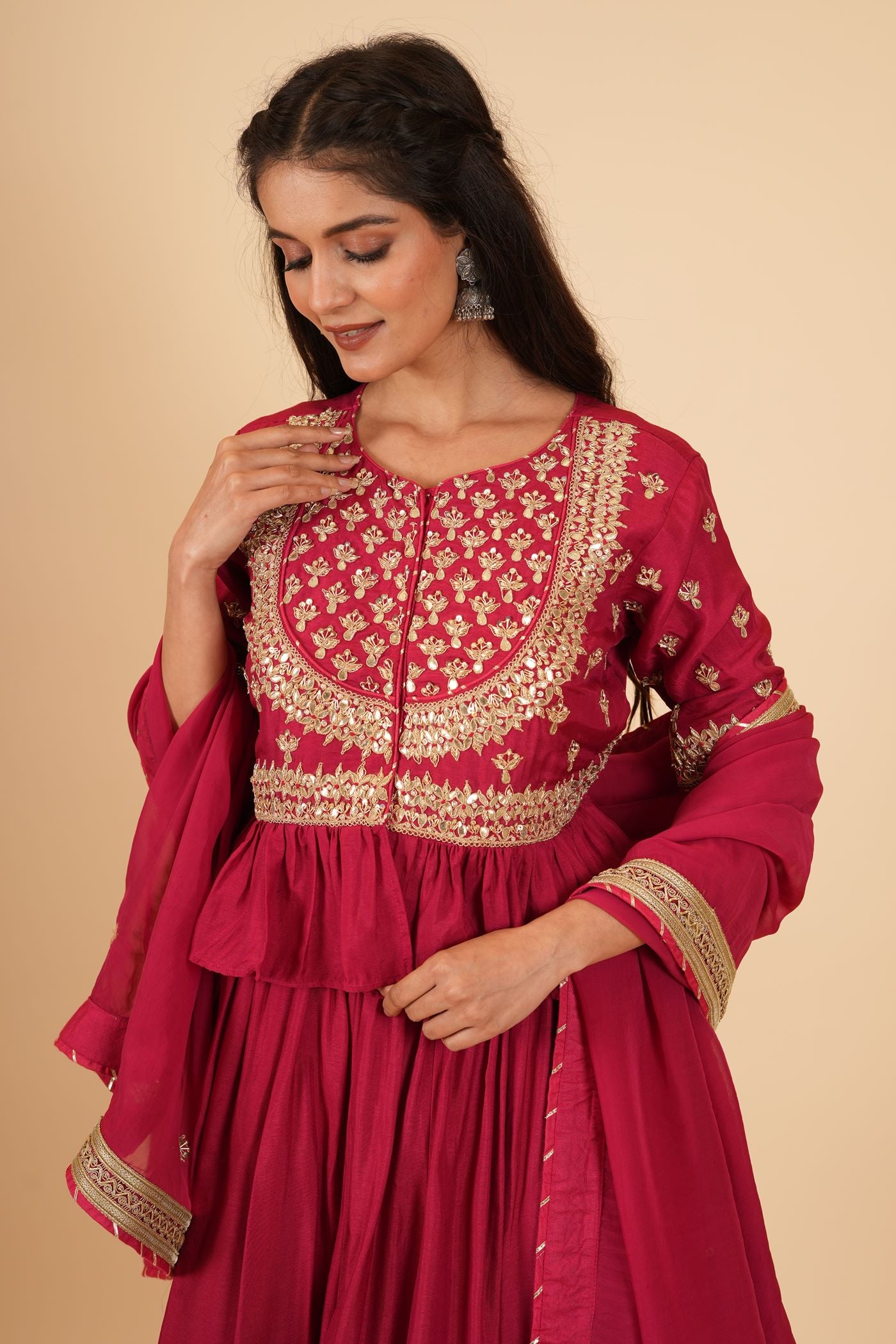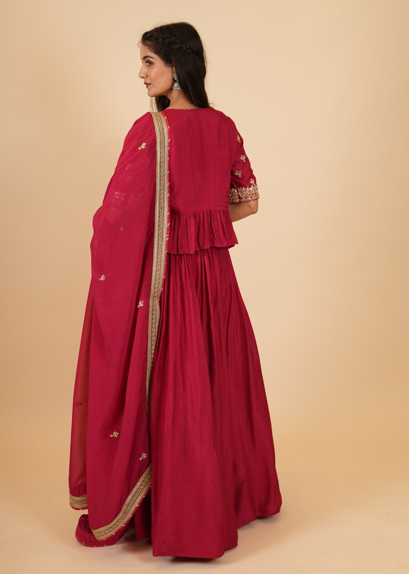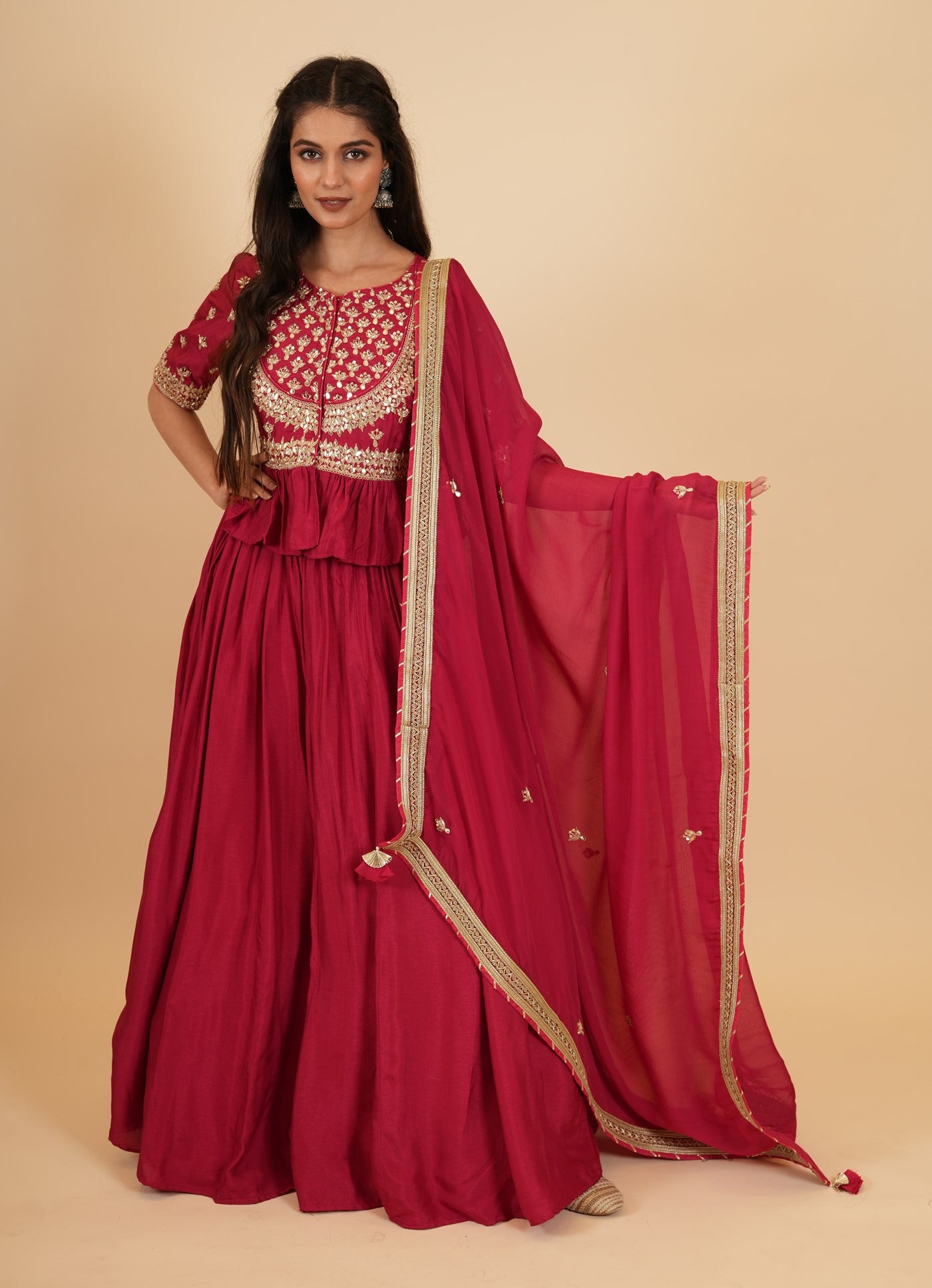 Add an elegant touch to your wardrobe with Ranas Designer Lehenga. Its maroon color, paired with gota, zardosi, & sequine work, creates a stunning party wear look. The peplum top enhances the silhouette, while the organza dupatta adds a luxurious finishing touch. Elevate your style with this exquisite piece.