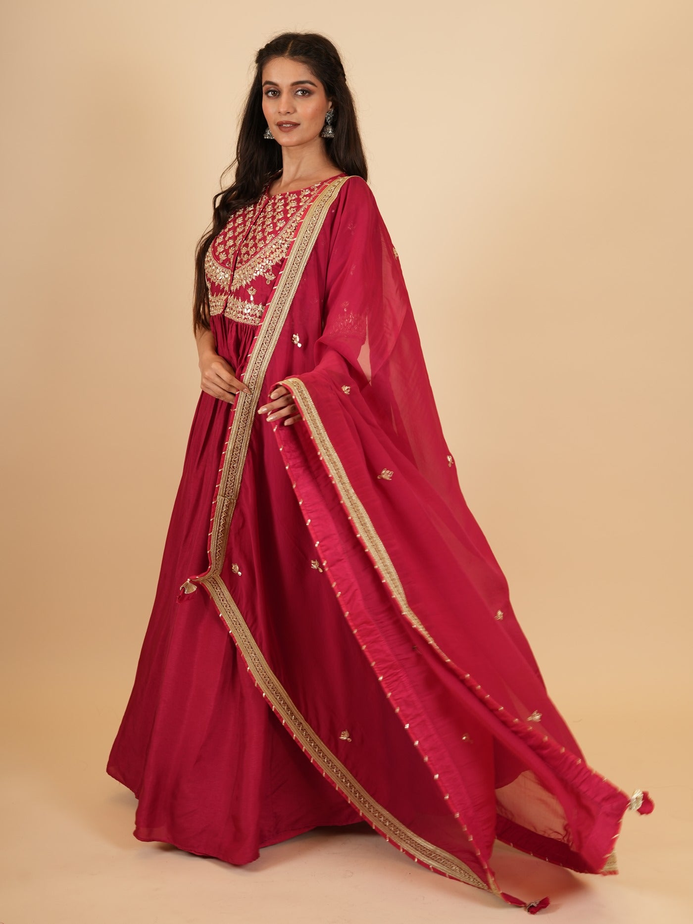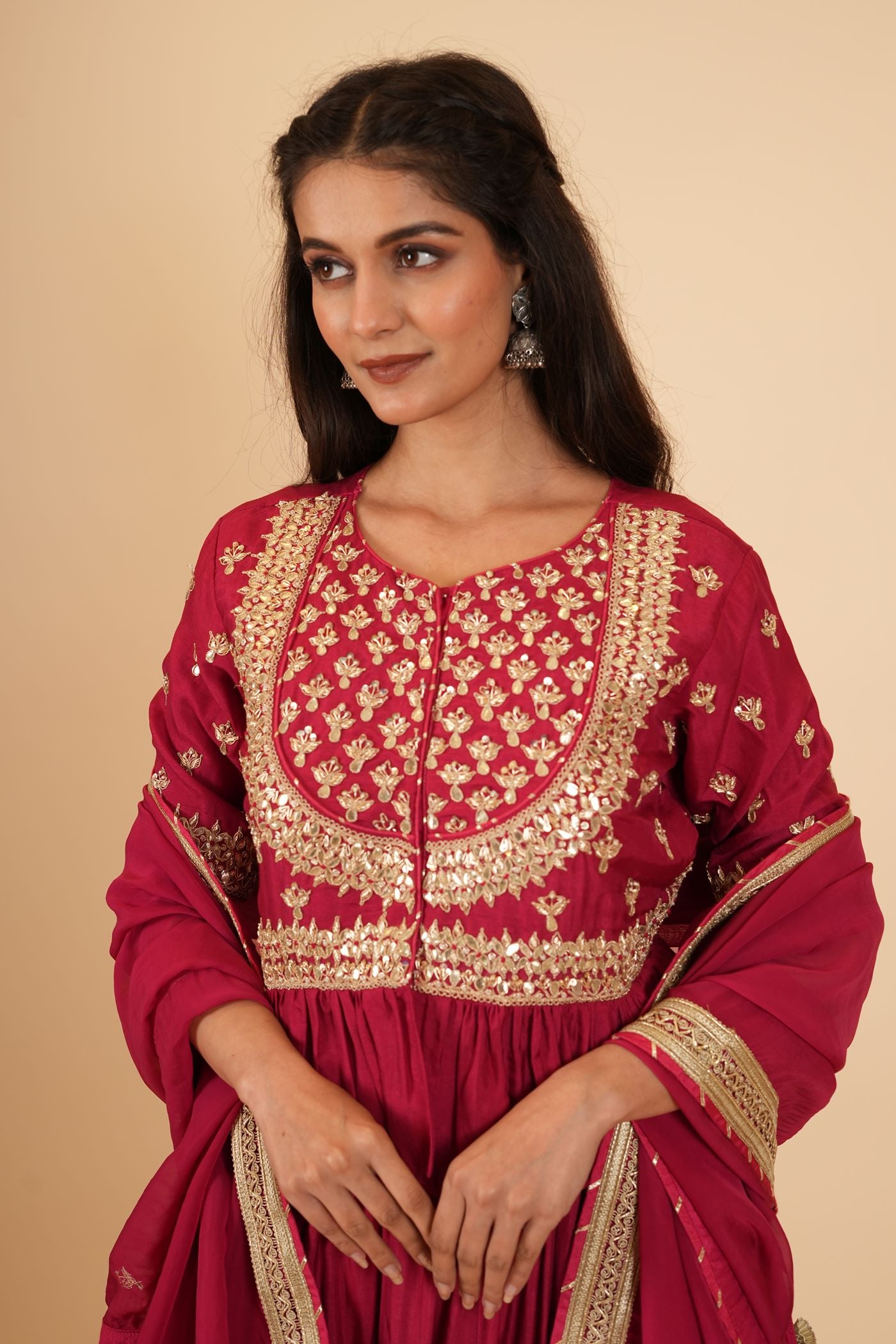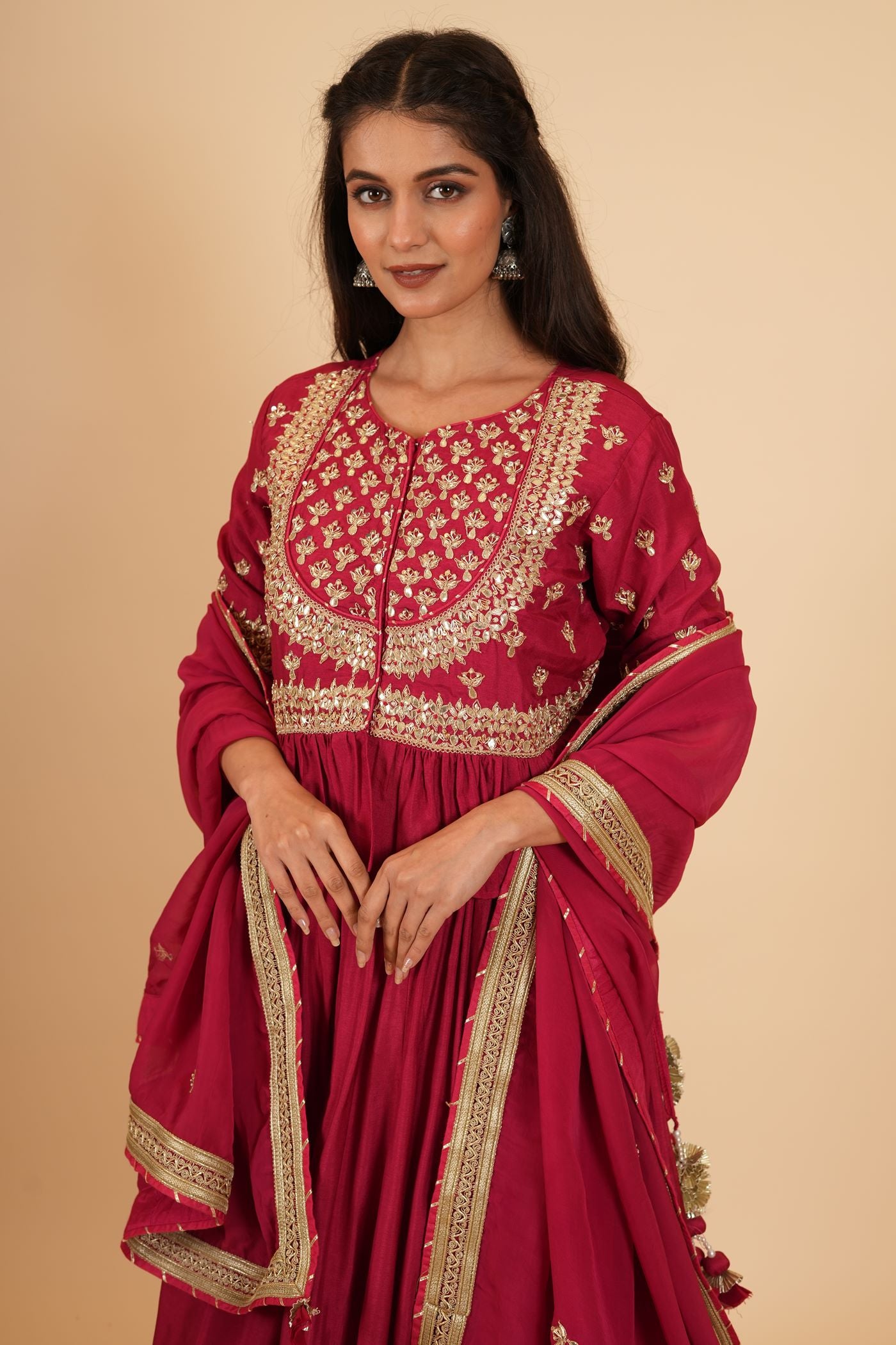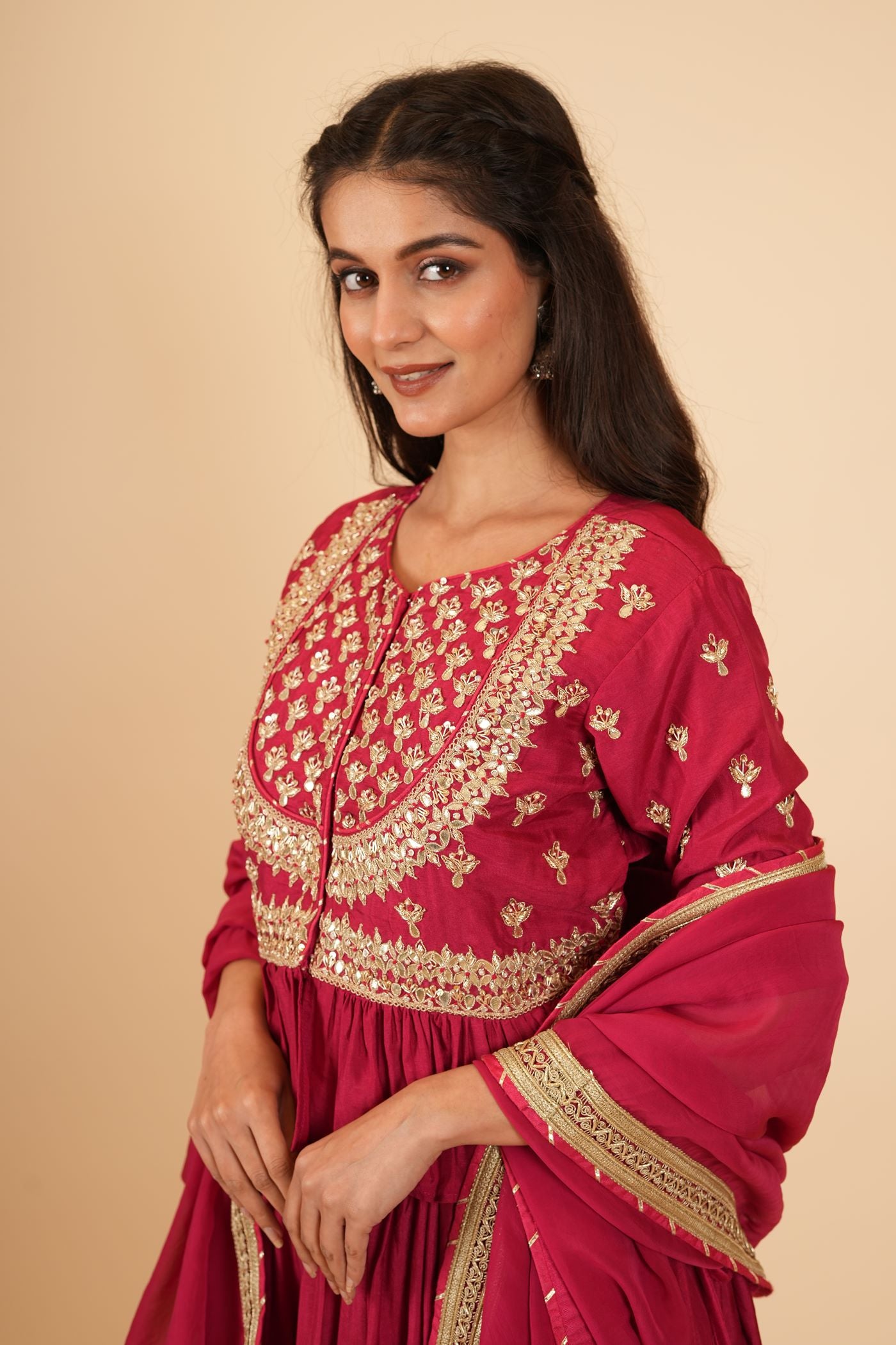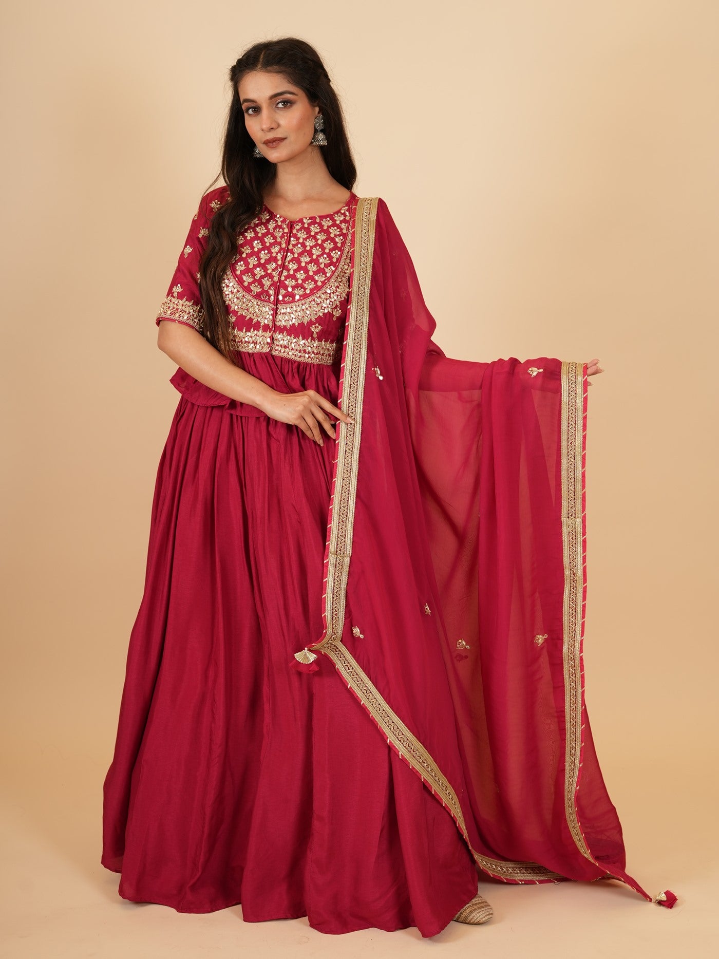 Add an elegant touch to your wardrobe with Ranas Designer Lehenga. Its maroon color, paired with gota, zardosi, & sequine work, creates a stunning party wear look. The peplum top enhances the silhouette, while the organza dupatta adds a luxurious finishing touch. Elevate your style with this exquisite piece.