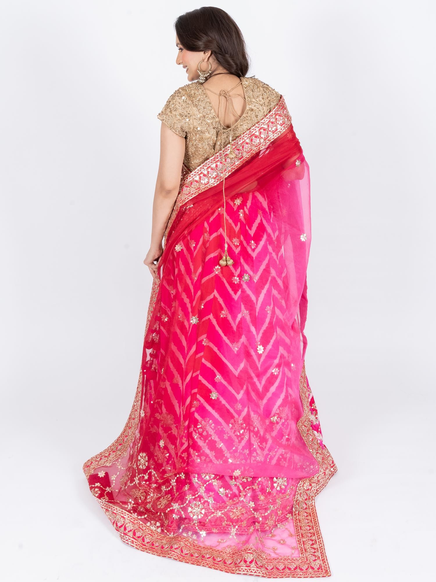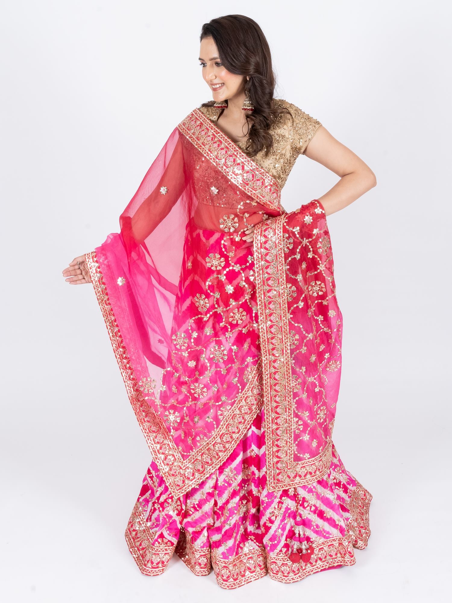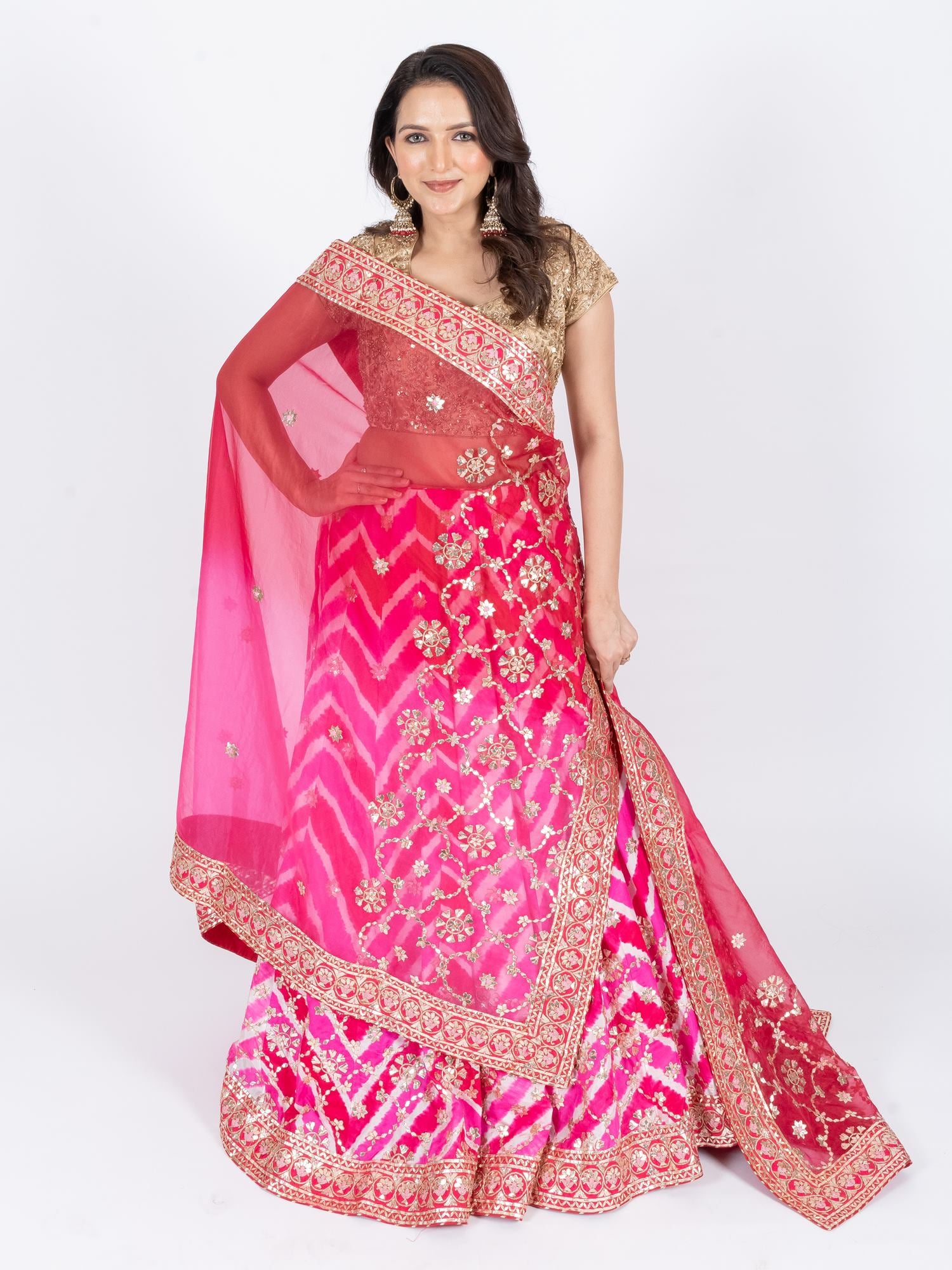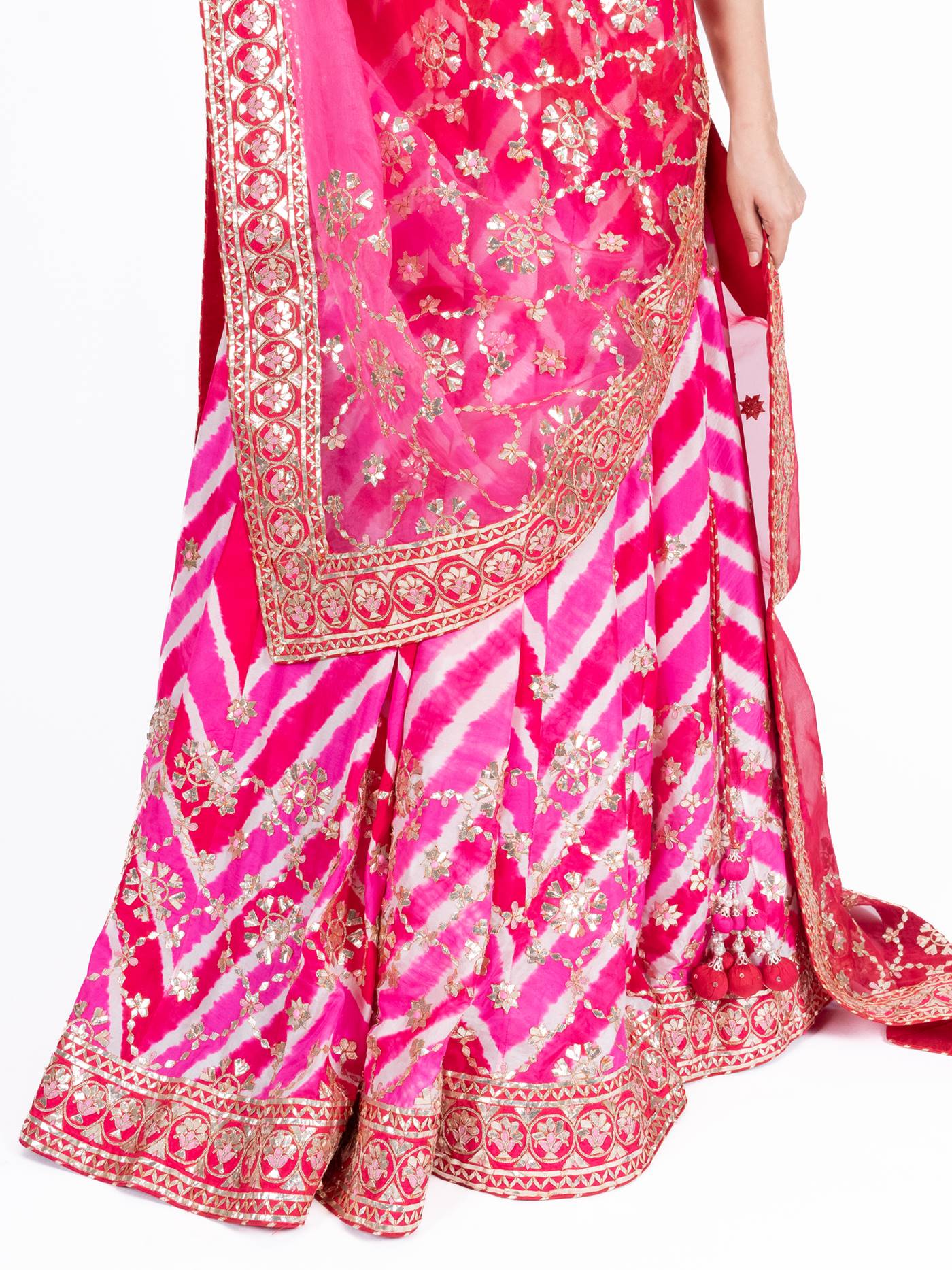 | Lehenga Color : Rani & Pink Leheriya Lehenga Fabric : Silk Lehenga Work : Kacchi Patti & Bud Work Dupatta Color : Shaded Rani & PinkΒ Dupatta Fabric : Organza Dupatta Work : Kacchi Patti & Bud Work Blouse Color : Rani Blouse Fabric : Silk Blouse Work : Kacchi Patti & Bud Work |