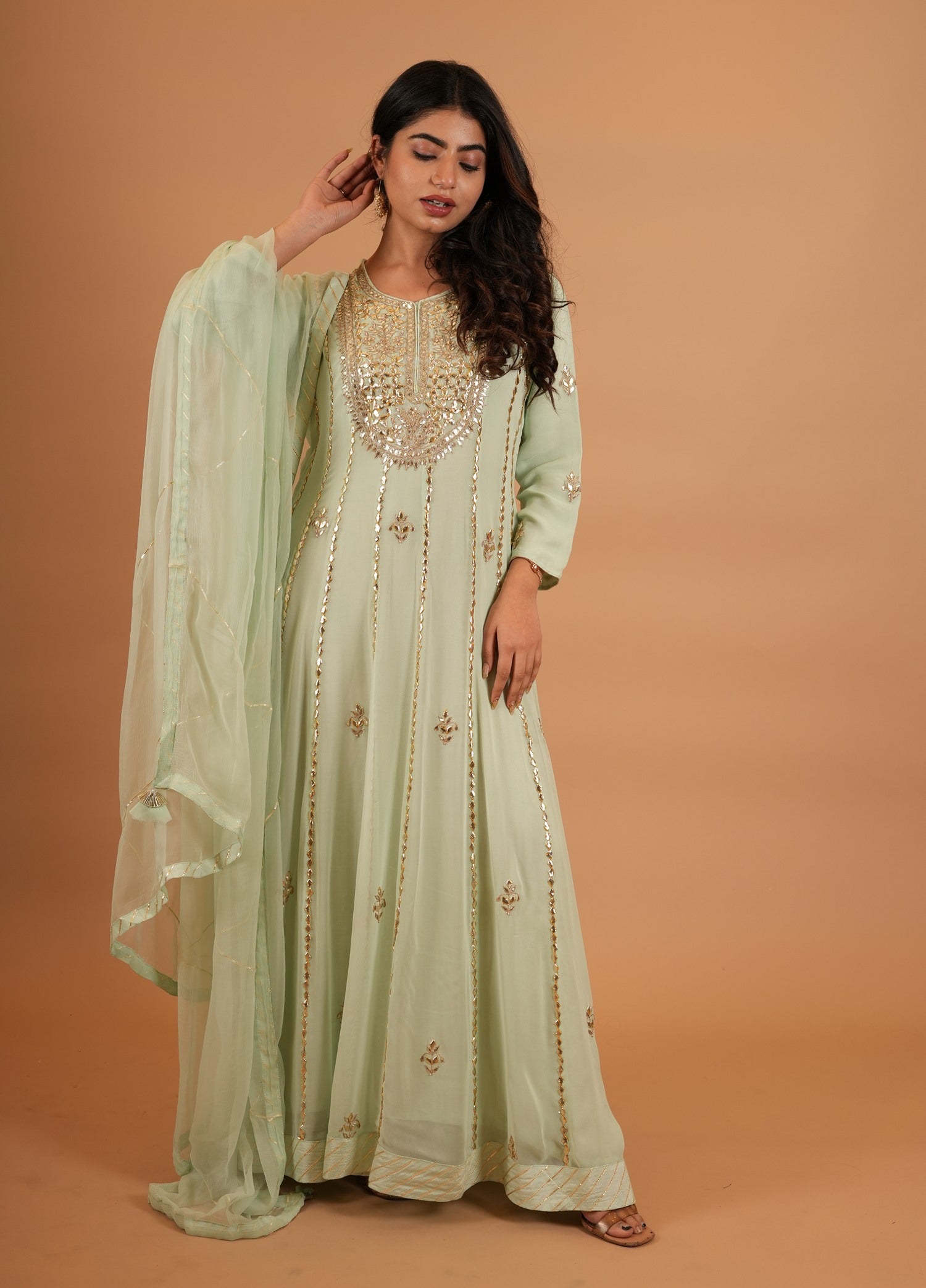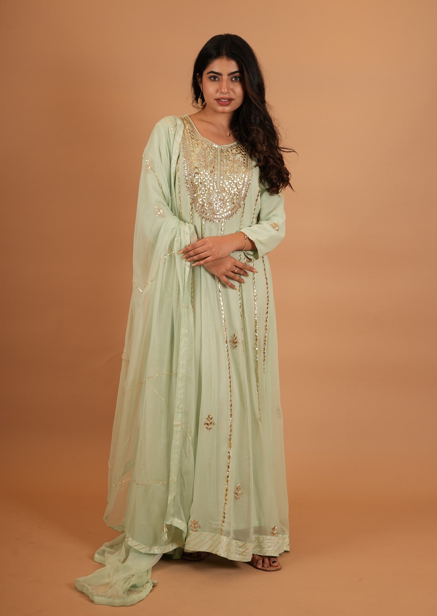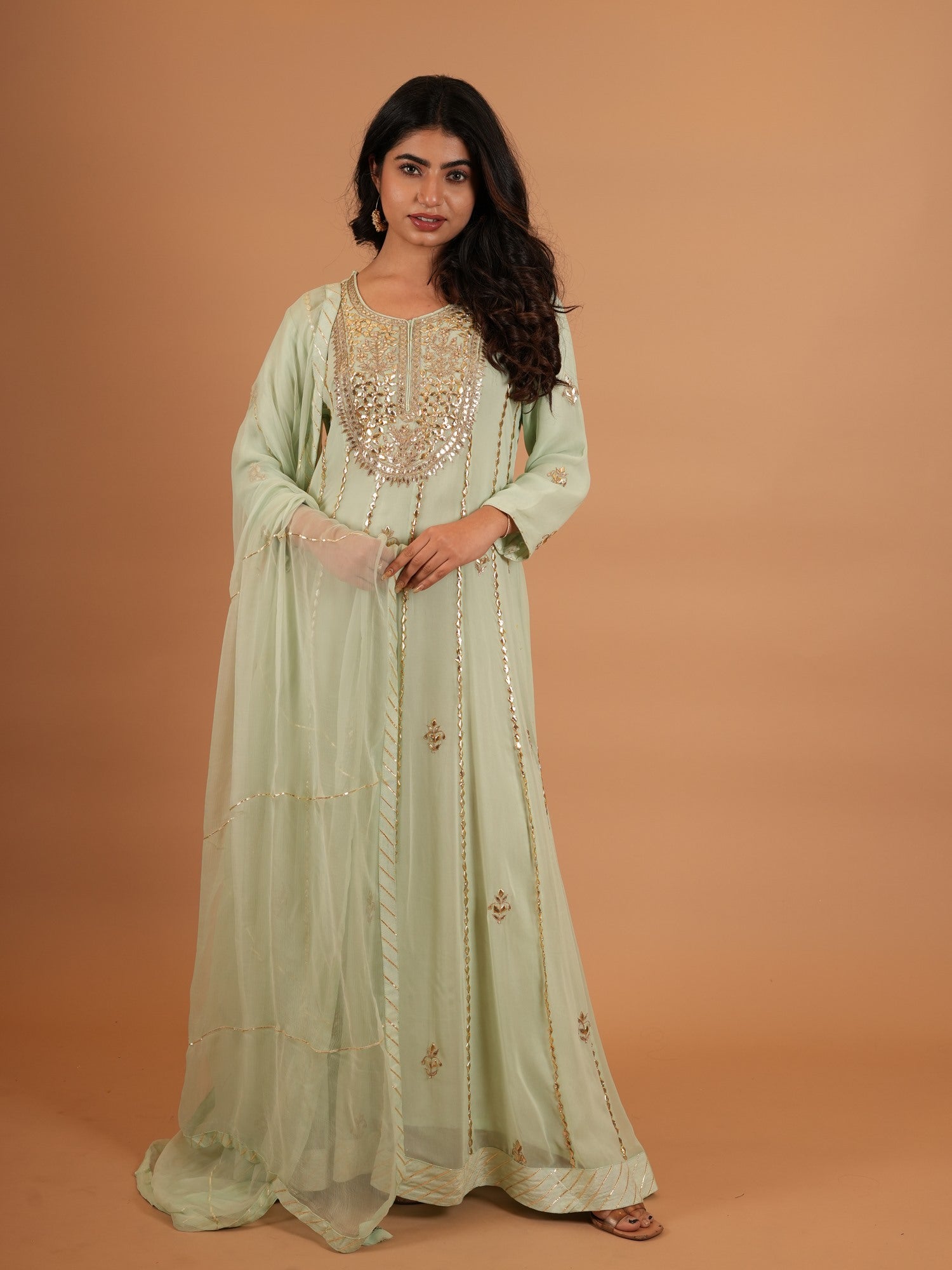 Kurta Color : Sea Green Kurta Fabric : Art Georgette Kurta Work : Gota Dupatta Color : Sea Green Dupatta Fabric : Chiffon Dupatta Work : Sikiya Gota |