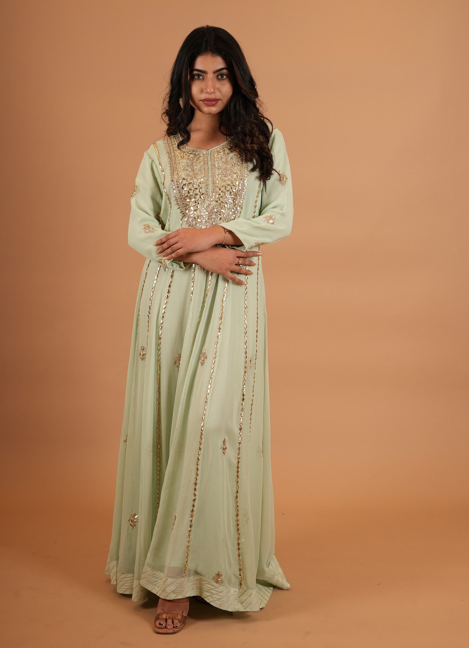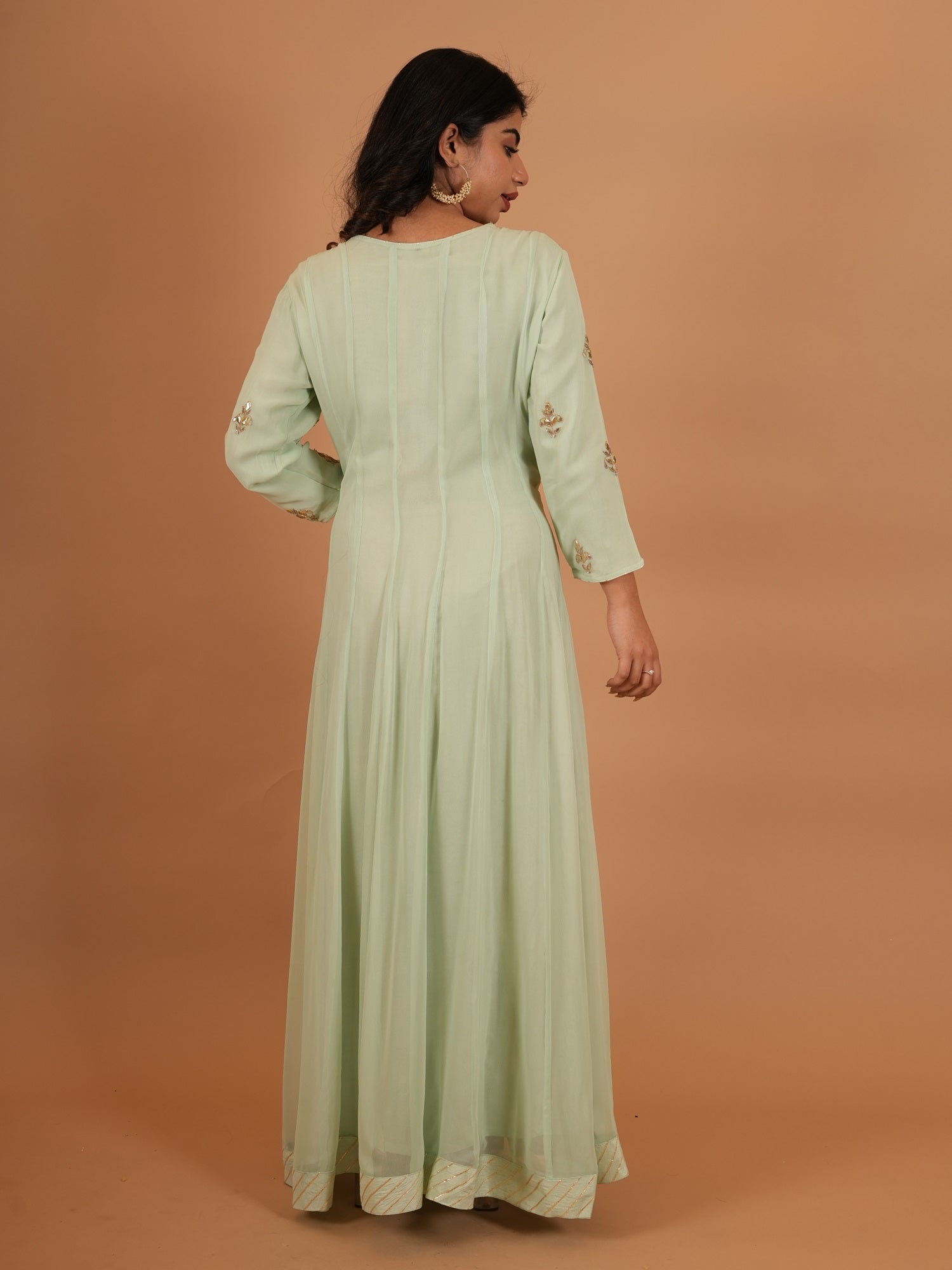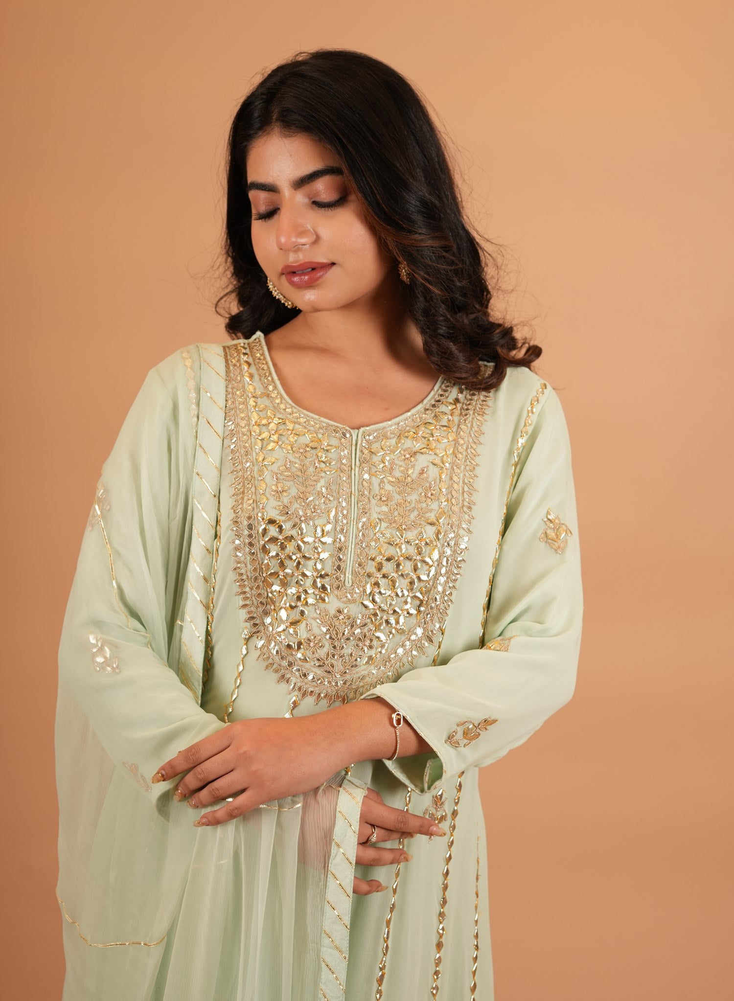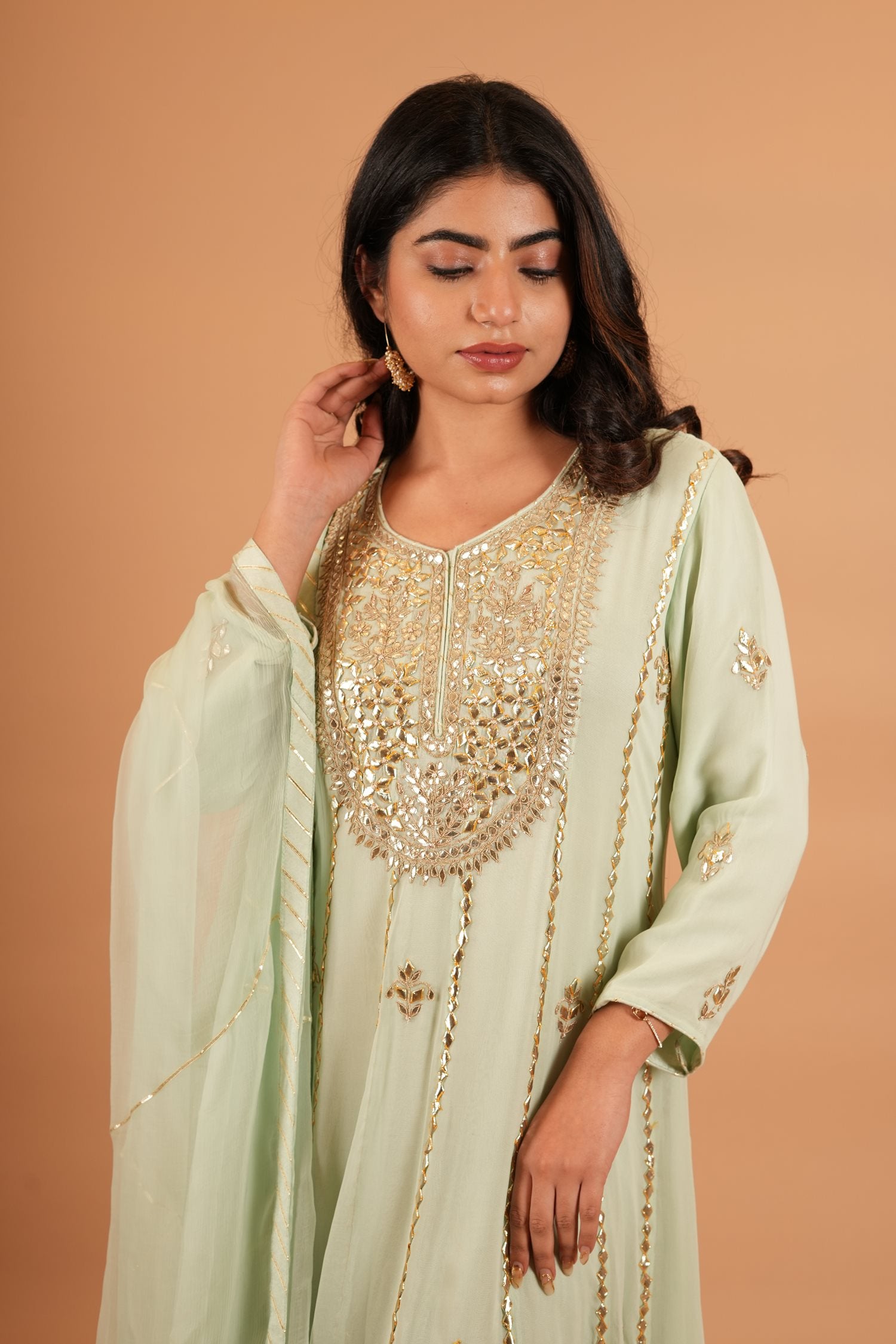 Kurta Color : Sea Green Kurta Fabric : Art Georgette Kurta Work : Gota Dupatta Color : Sea Green Dupatta Fabric : Chiffon Dupatta Work : Sikiya Gota |