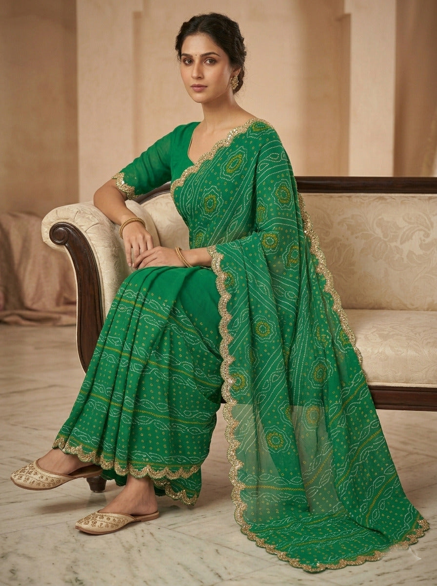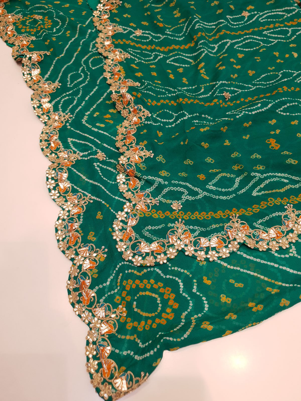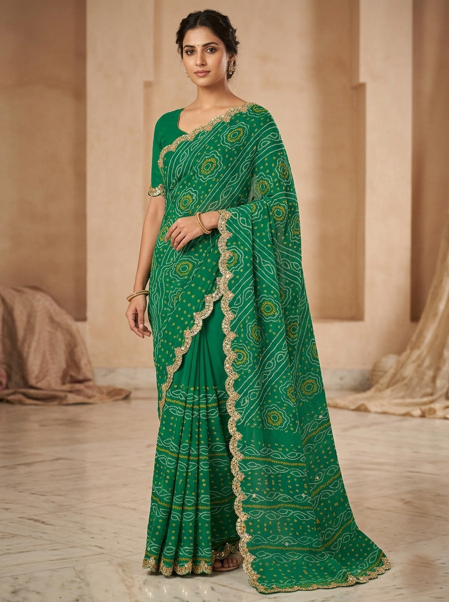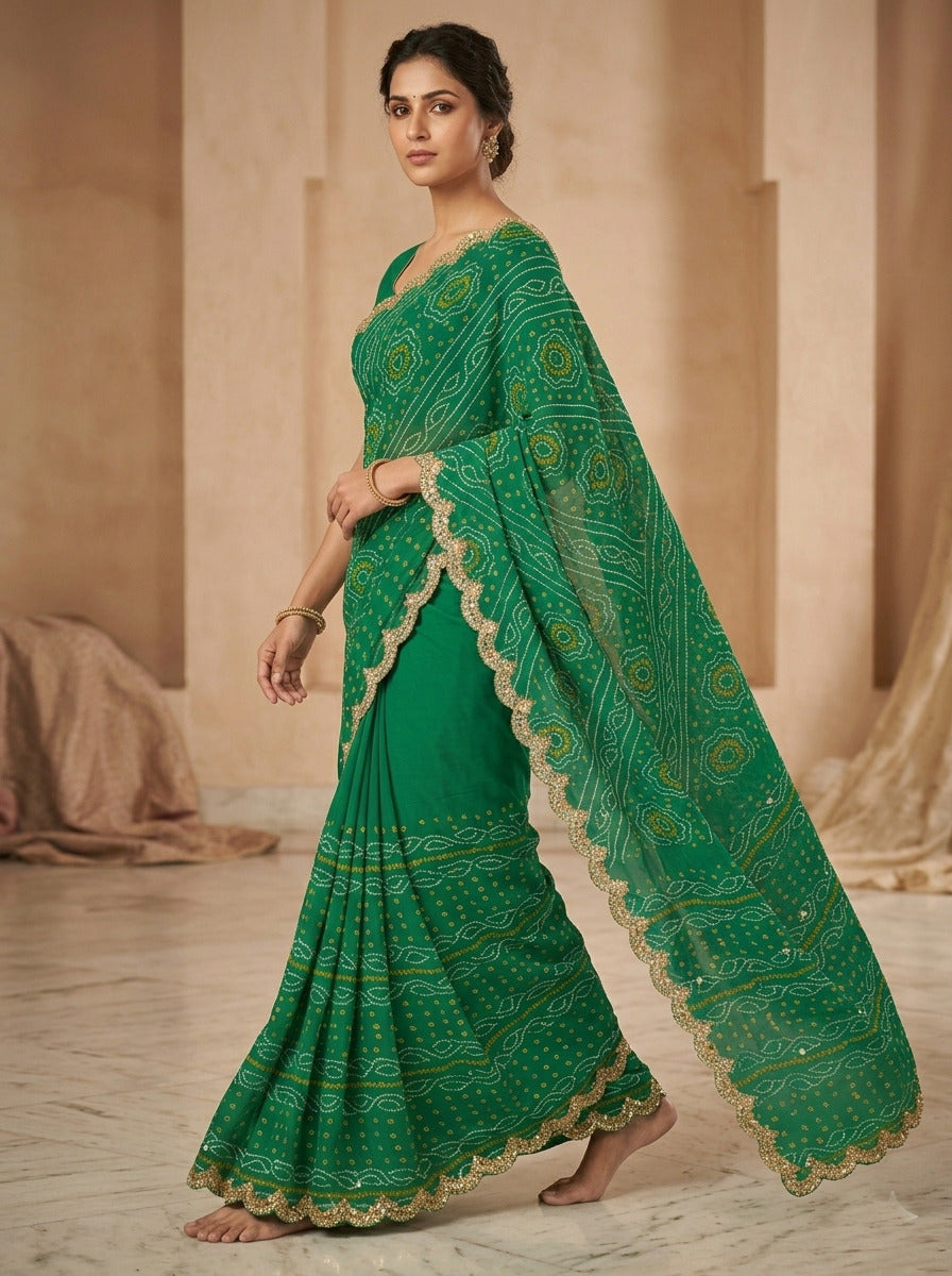 Embrace timeless elegance with this stunning Emerald Green Bandhej Saree from Ranas. Crafted from pure chinon fabric, this saree features exquisite gota patti and kachhi patti work that adds a touch of traditional artistry to your wardrobe. The rich emerald green hue is perfect for festive occasions, weddings, and celebrations. The intricate bandhej pattern combined with detailed embellishments creates a sophisticated look that's both classic and contemporary. Ideal for those who appreciate authentic craftsmanship and premium quality, this saree drapes beautifully and offers comfort throughout the day. A versatile piece that transitions seamlessly from traditional gatherings to modern celebrations.