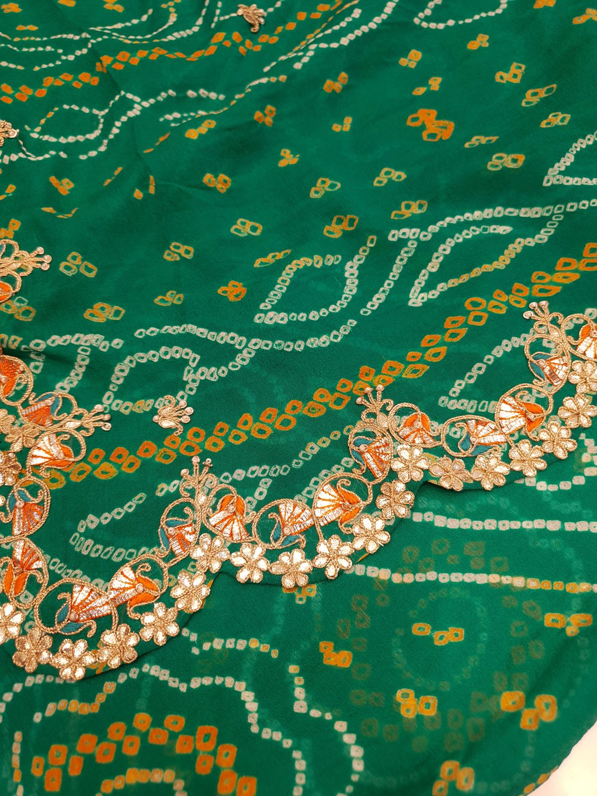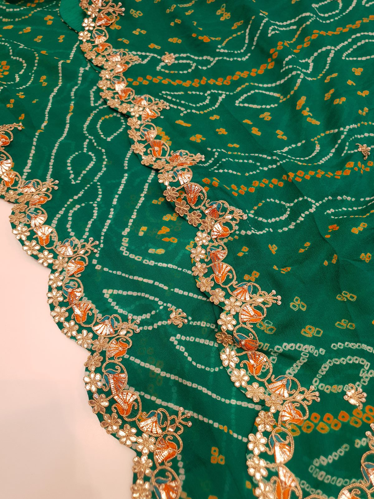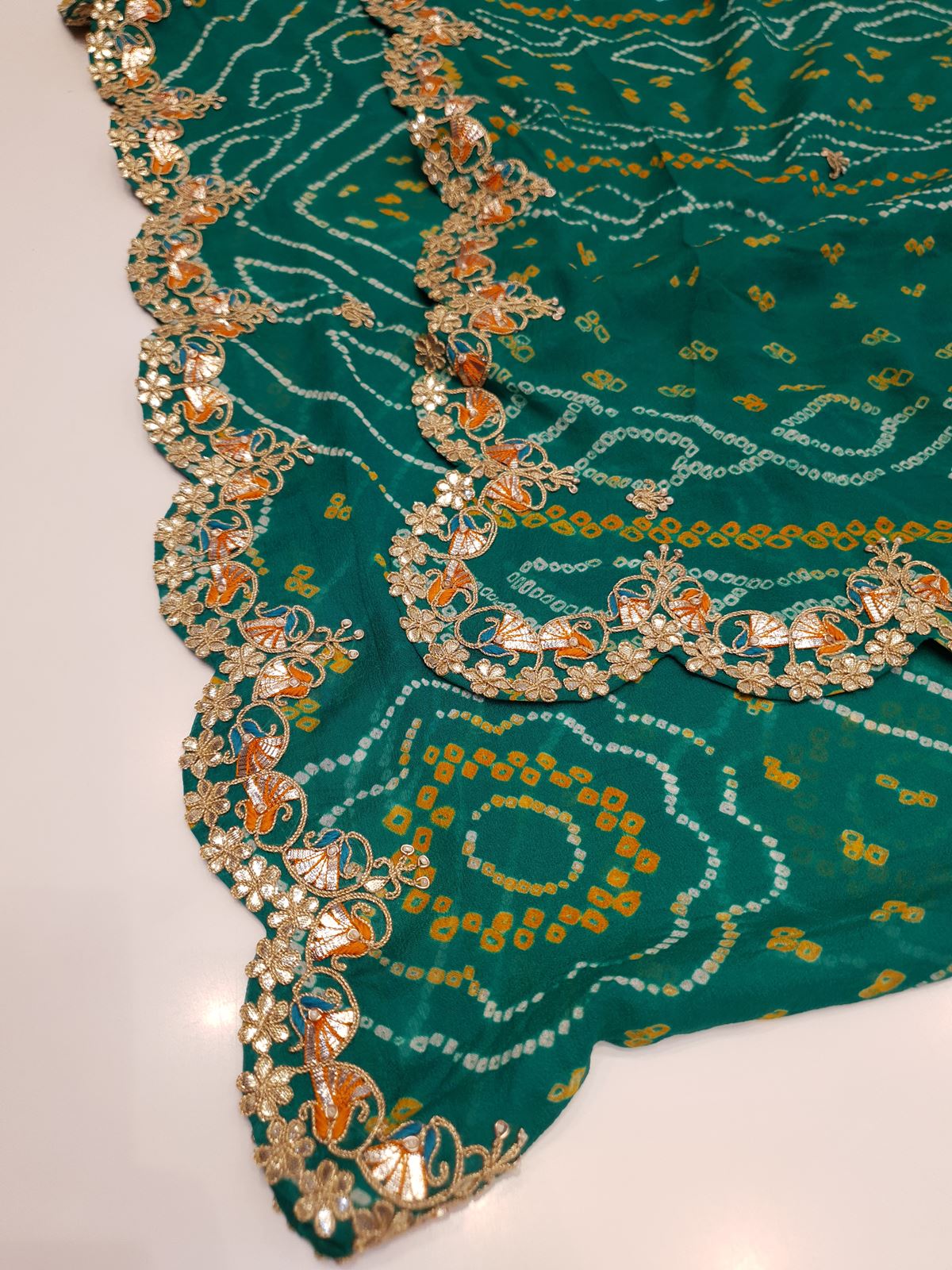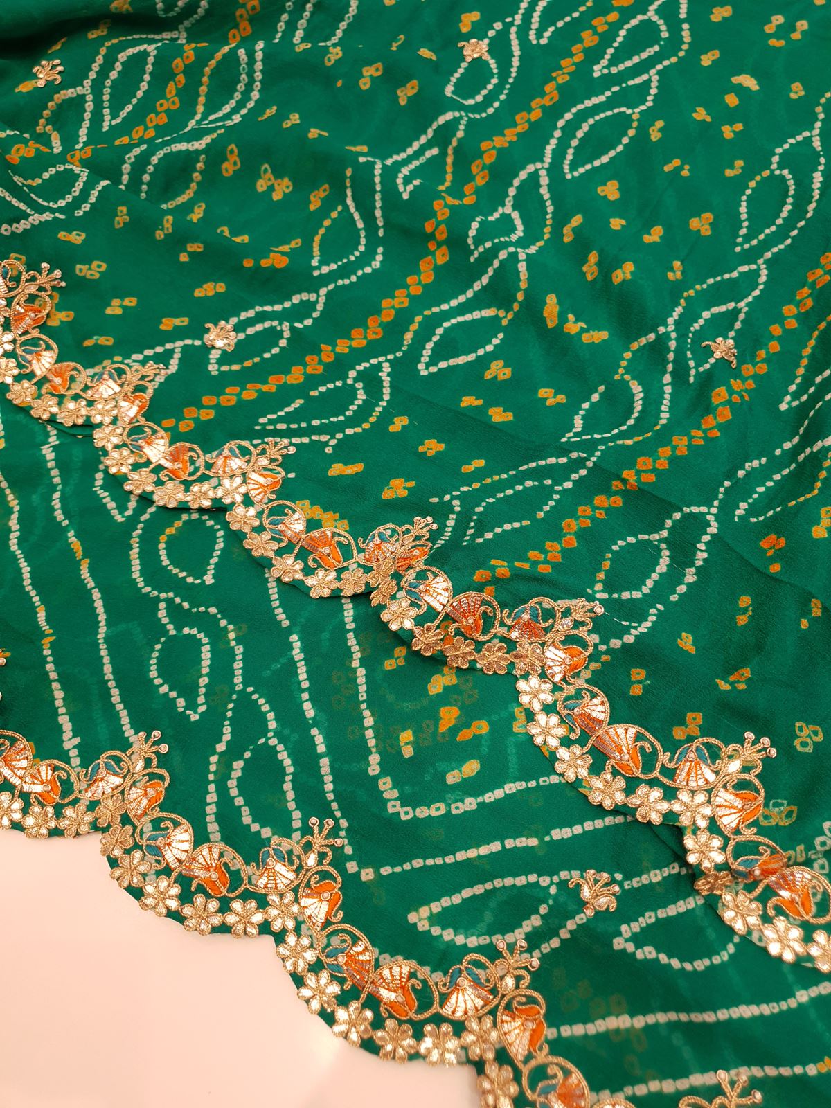 Embrace timeless elegance with this stunning Emerald Green Bandhej Saree from Ranas. Crafted from pure chinon fabric, this saree features exquisite gota patti and kachhi patti work that adds a touch of traditional artistry to your wardrobe. The rich emerald green hue is perfect for festive occasions, weddings, and celebrations. The intricate bandhej pattern combined with detailed embellishments creates a sophisticated look that's both classic and contemporary. Ideal for those who appreciate authentic craftsmanship and premium quality, this saree drapes beautifully and offers comfort throughout the day. A versatile piece that transitions seamlessly from traditional gatherings to modern celebrations.
