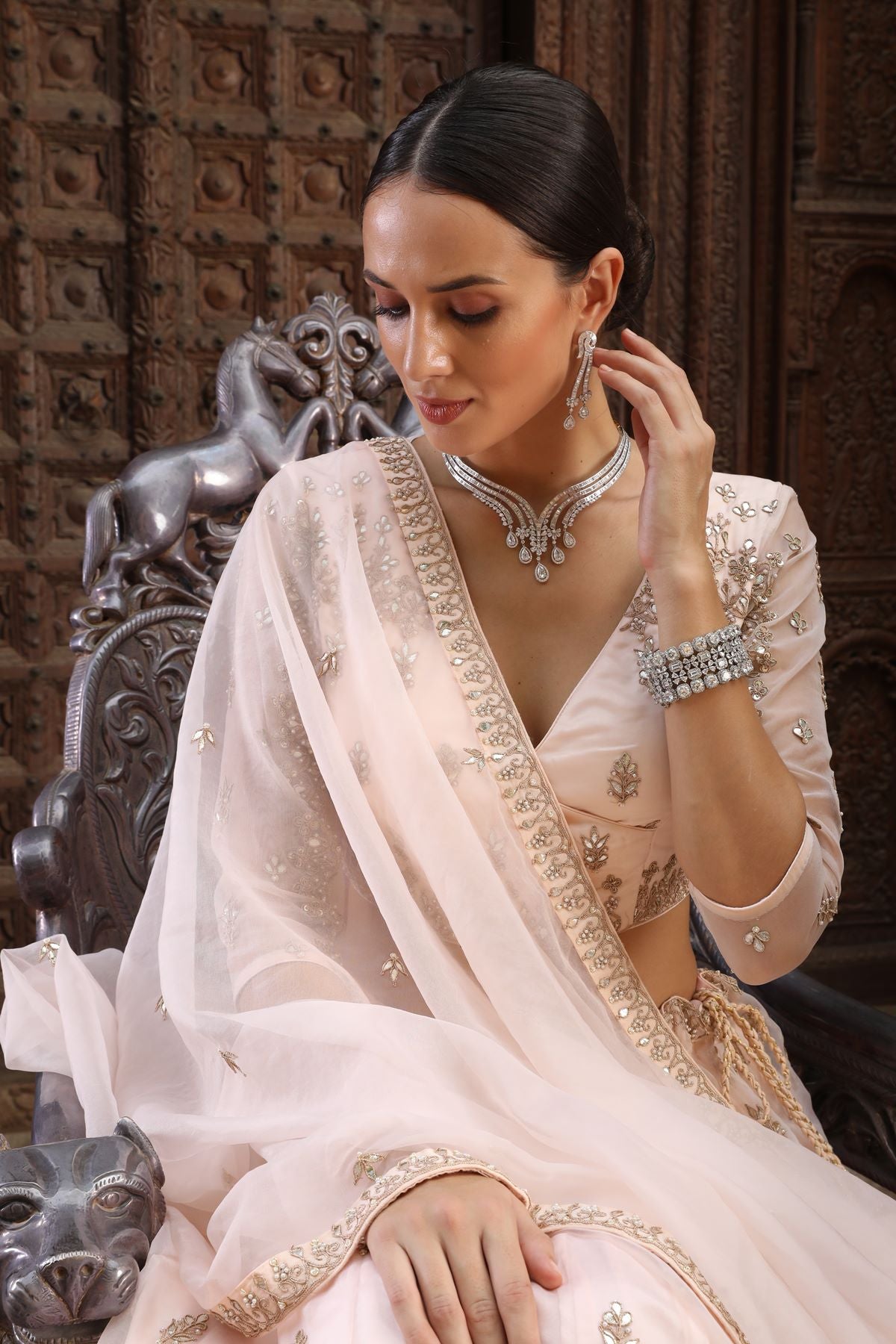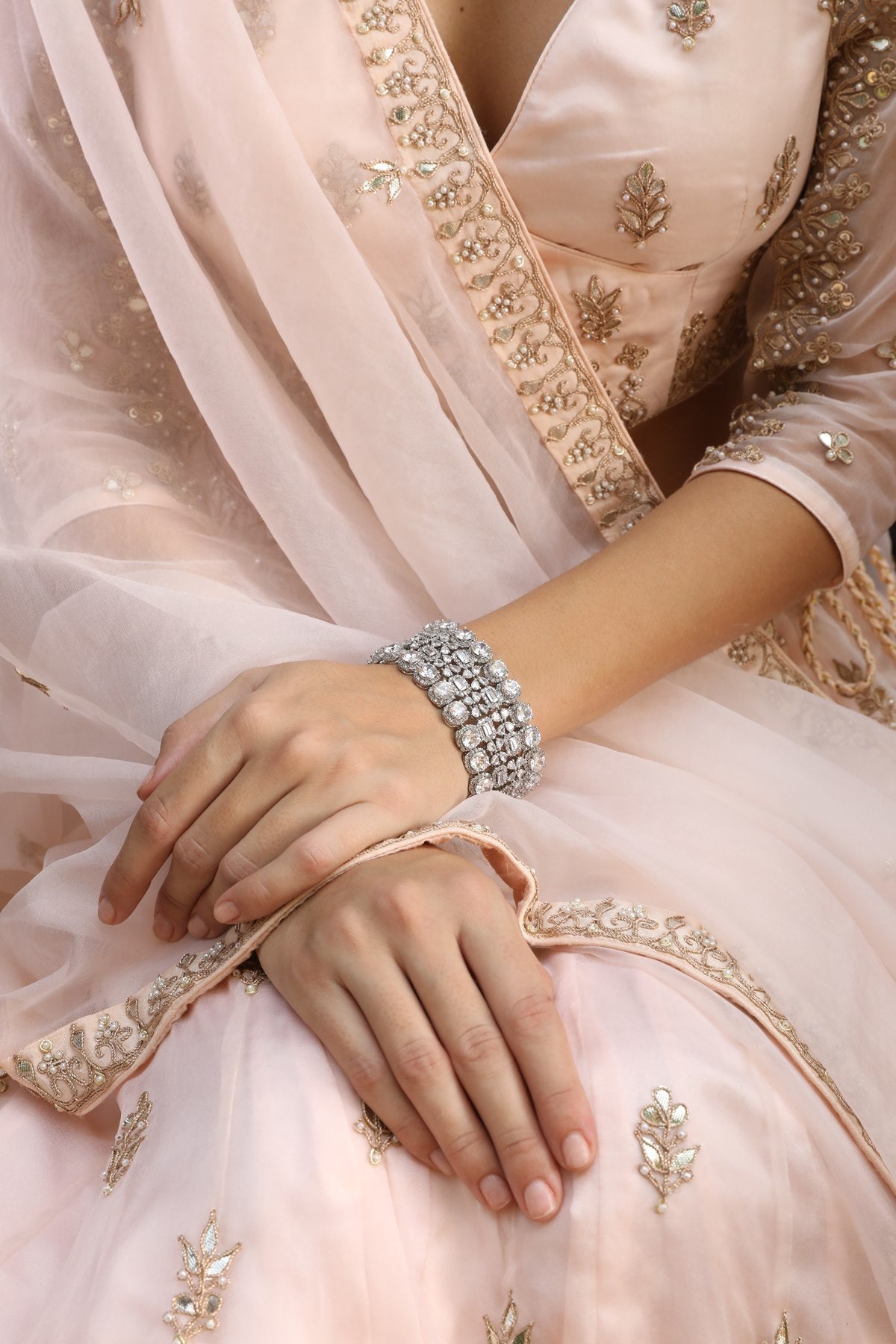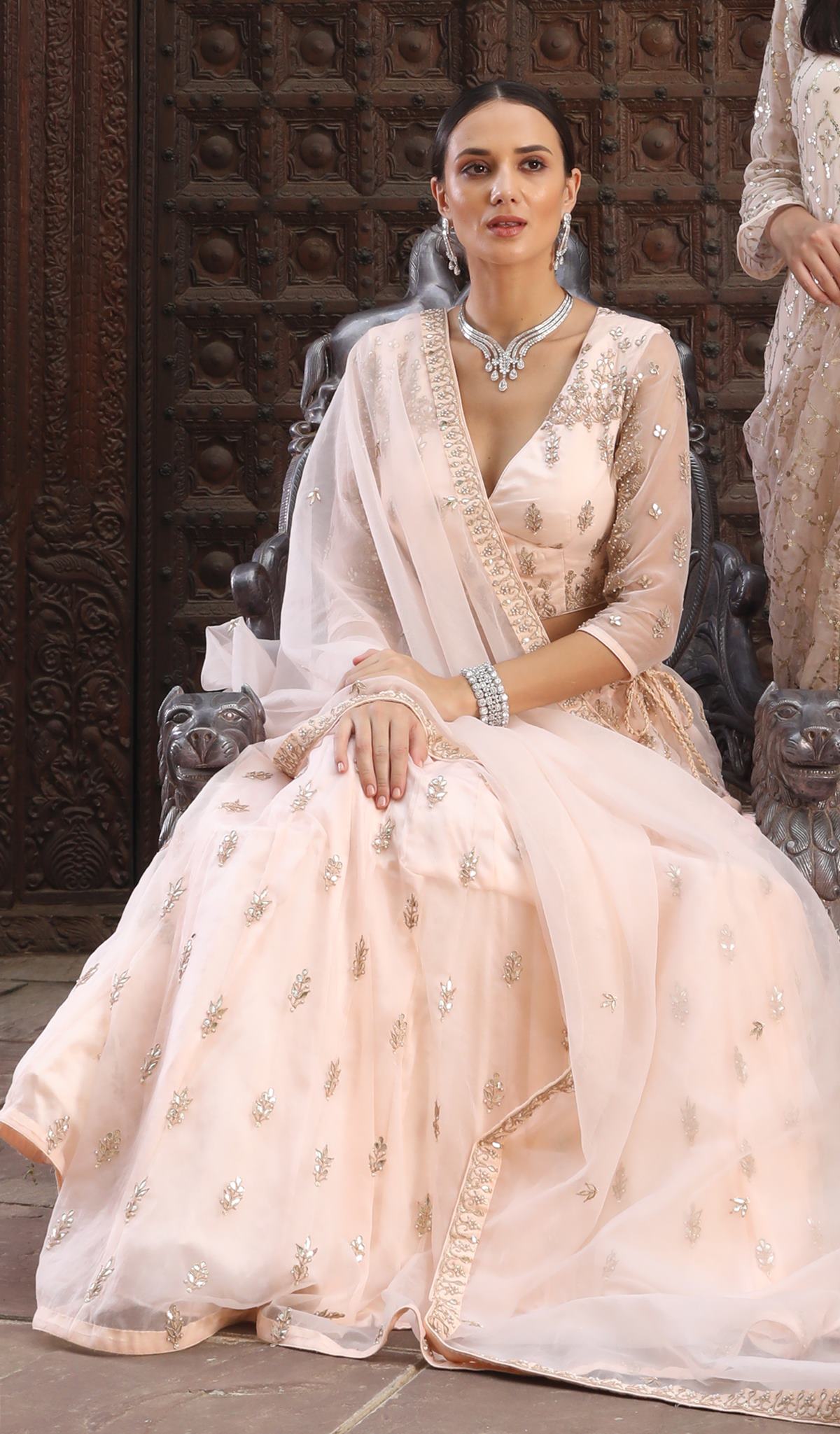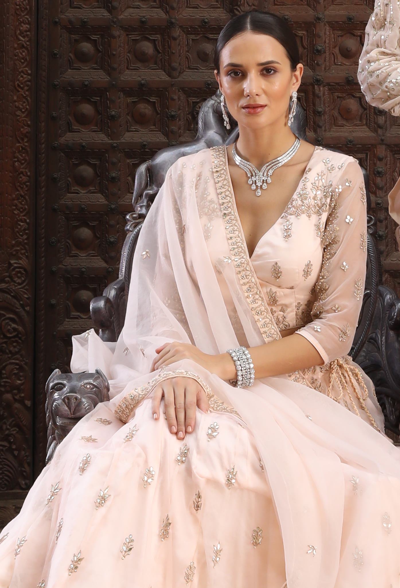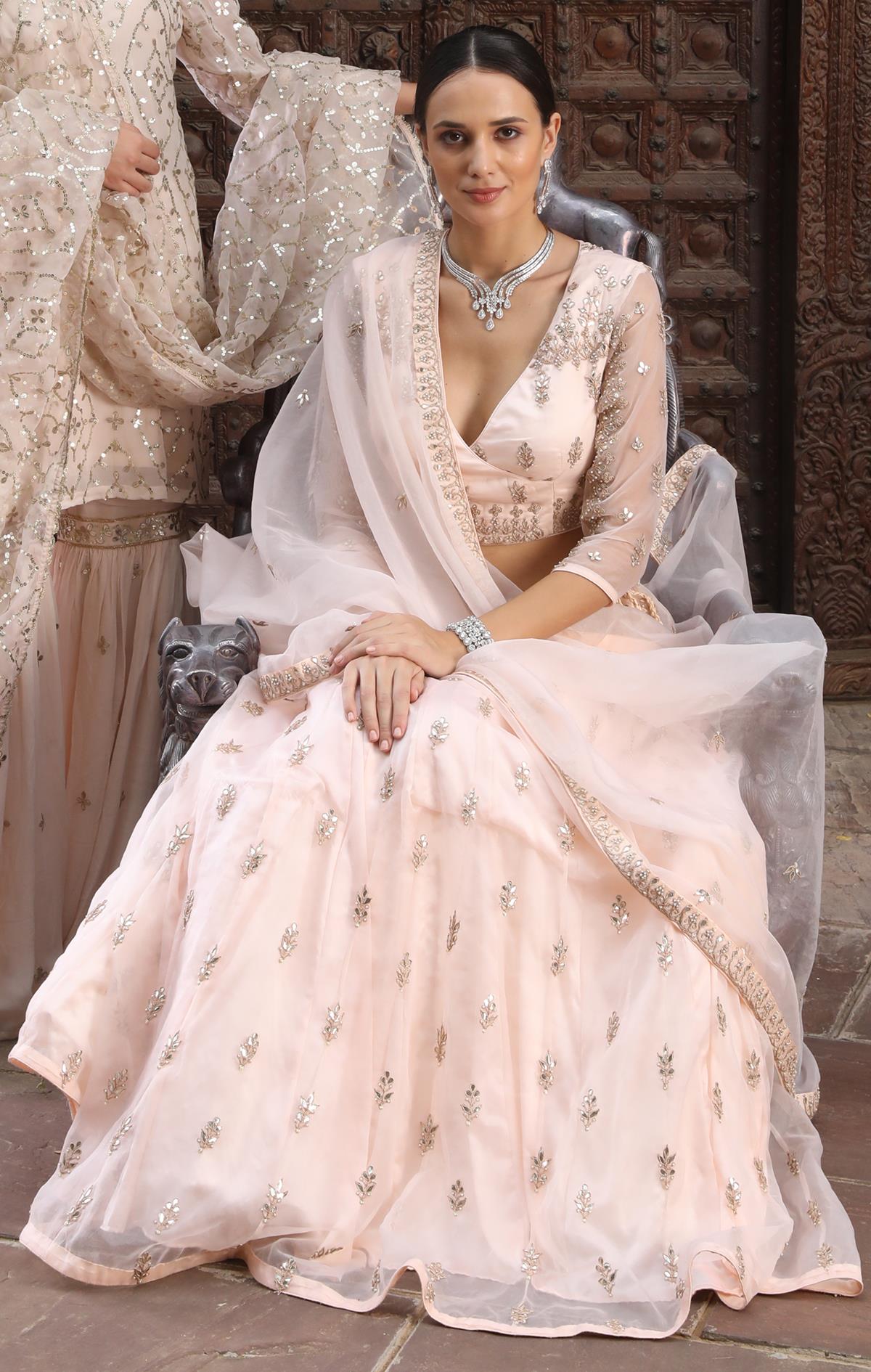 Step into the world of designer fashion with the Ranas Gota Patti Lehenga. Made from organza fabric, this exquisite lehenga features intricate gota patti work and a stunning powder pink color. Elevate your style with this latest design lehenga that is perfect for any special occasion.