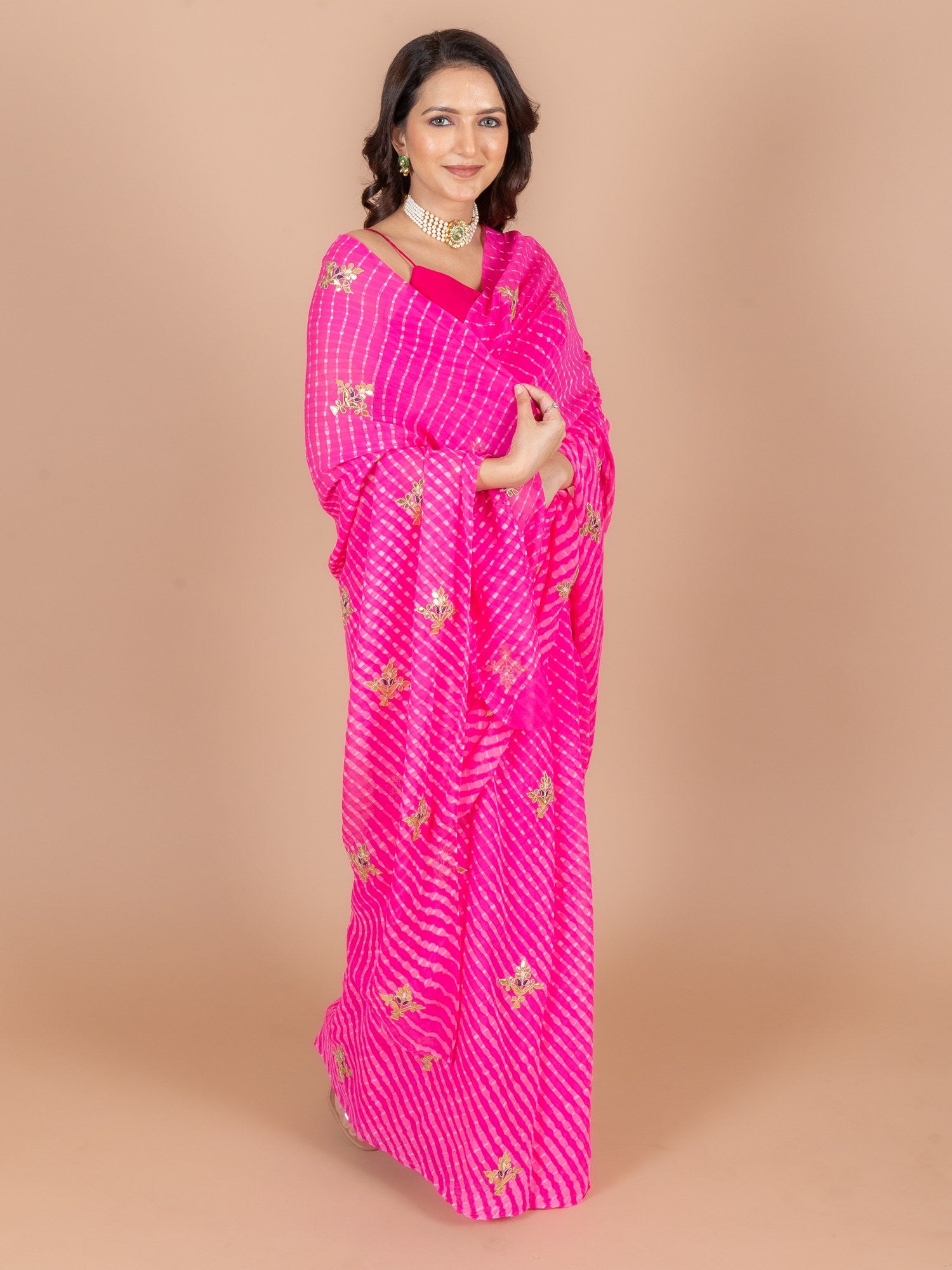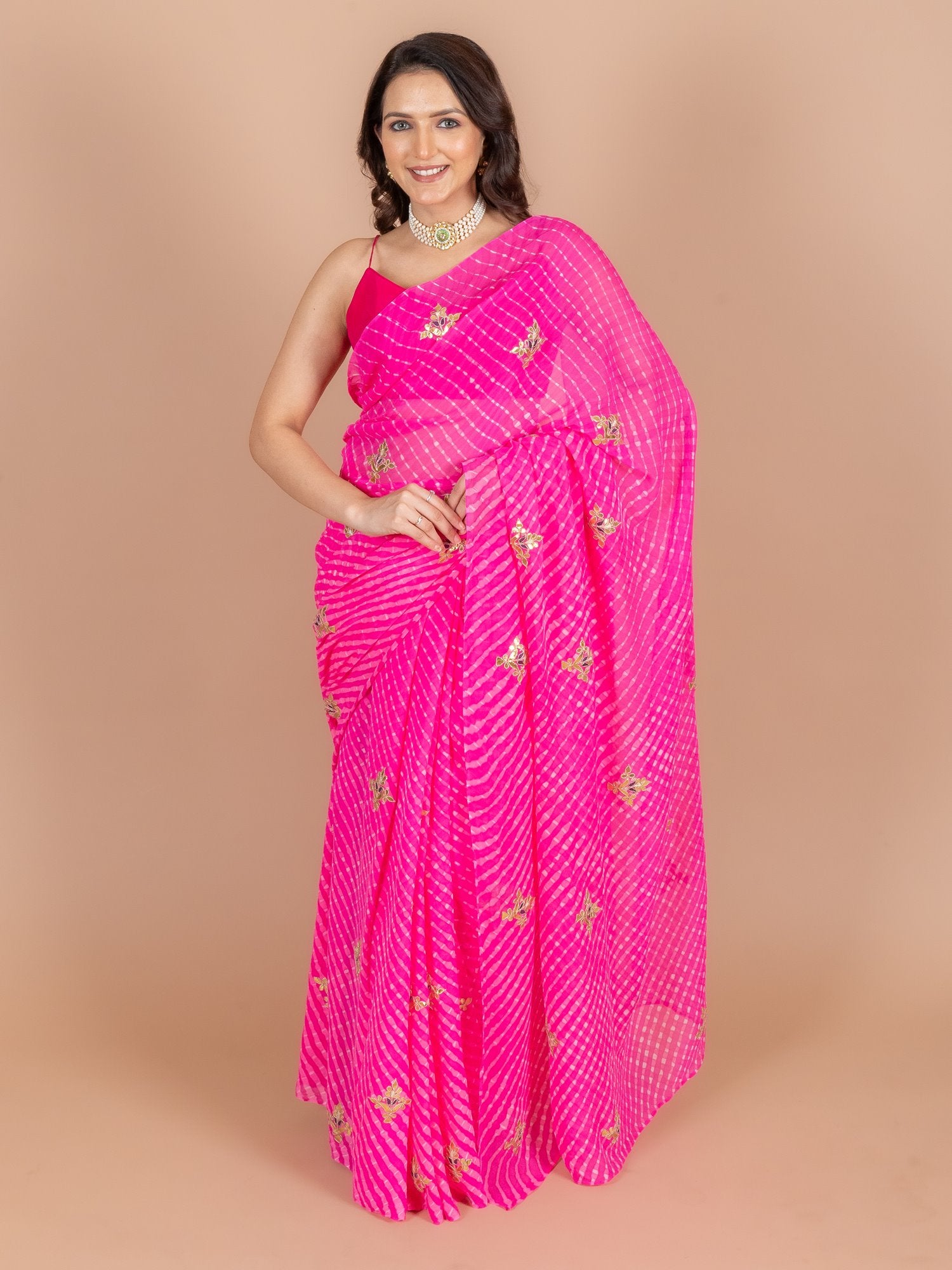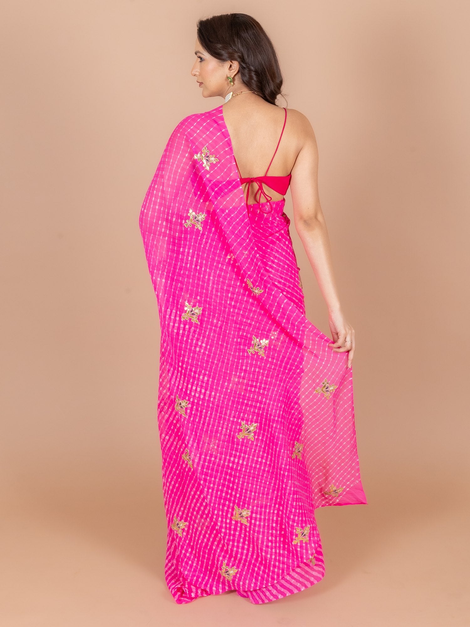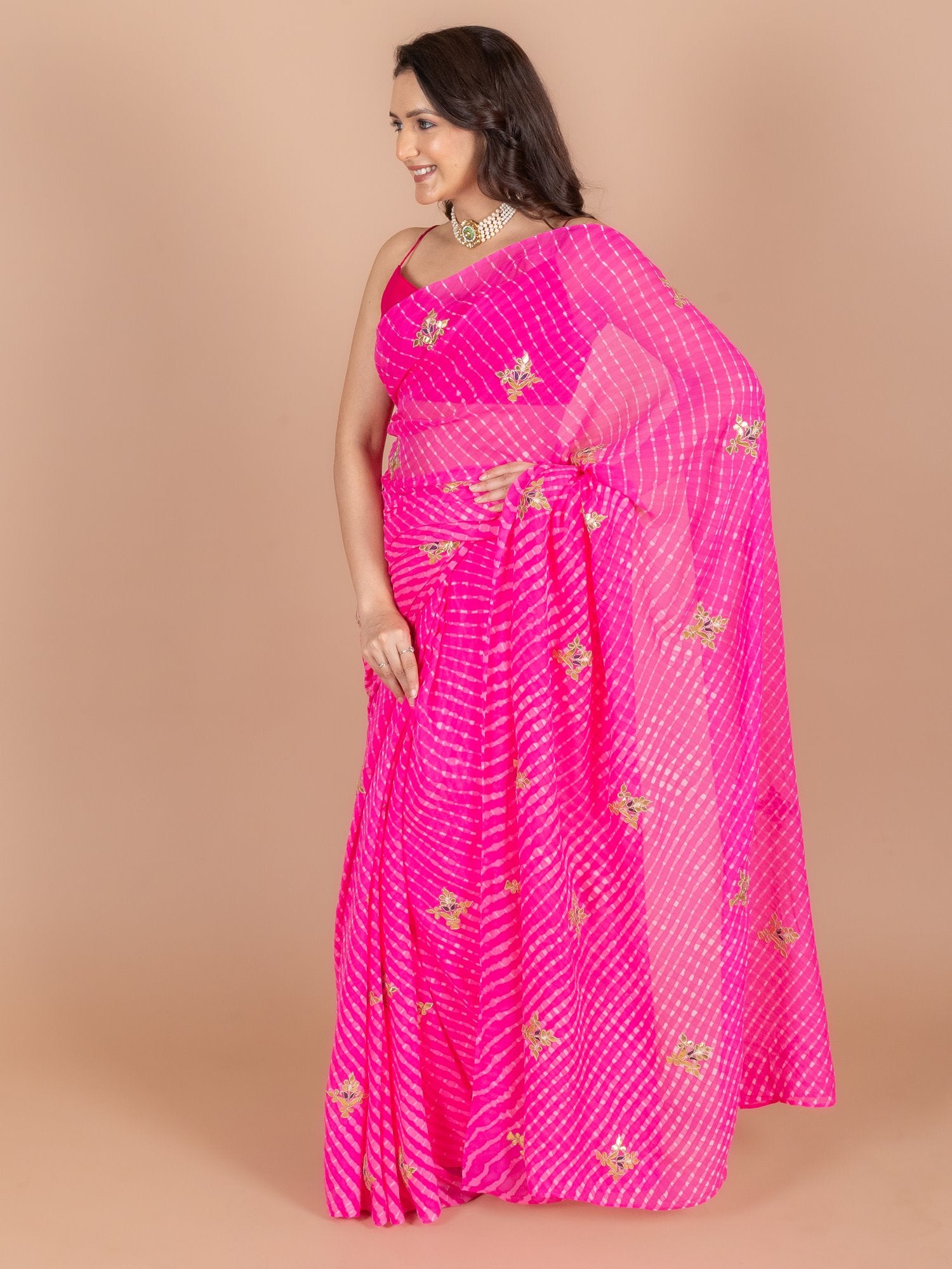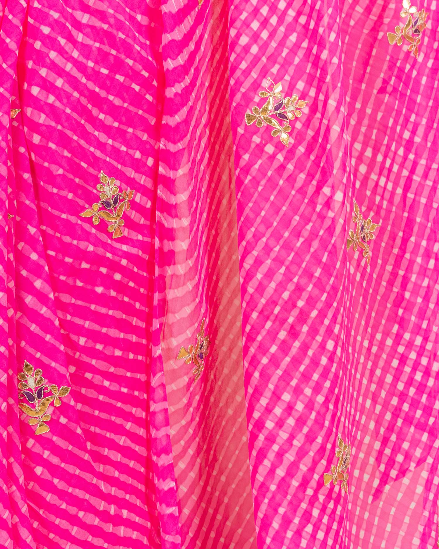 Saree Color : Pink Mothda Saree Fabric : Pure Georgette Saree Work : Gota Patti & Dori Blouse Color : Pink Blouse Fabric : Crepe Blouse Work : Gota Patti & Dori |
