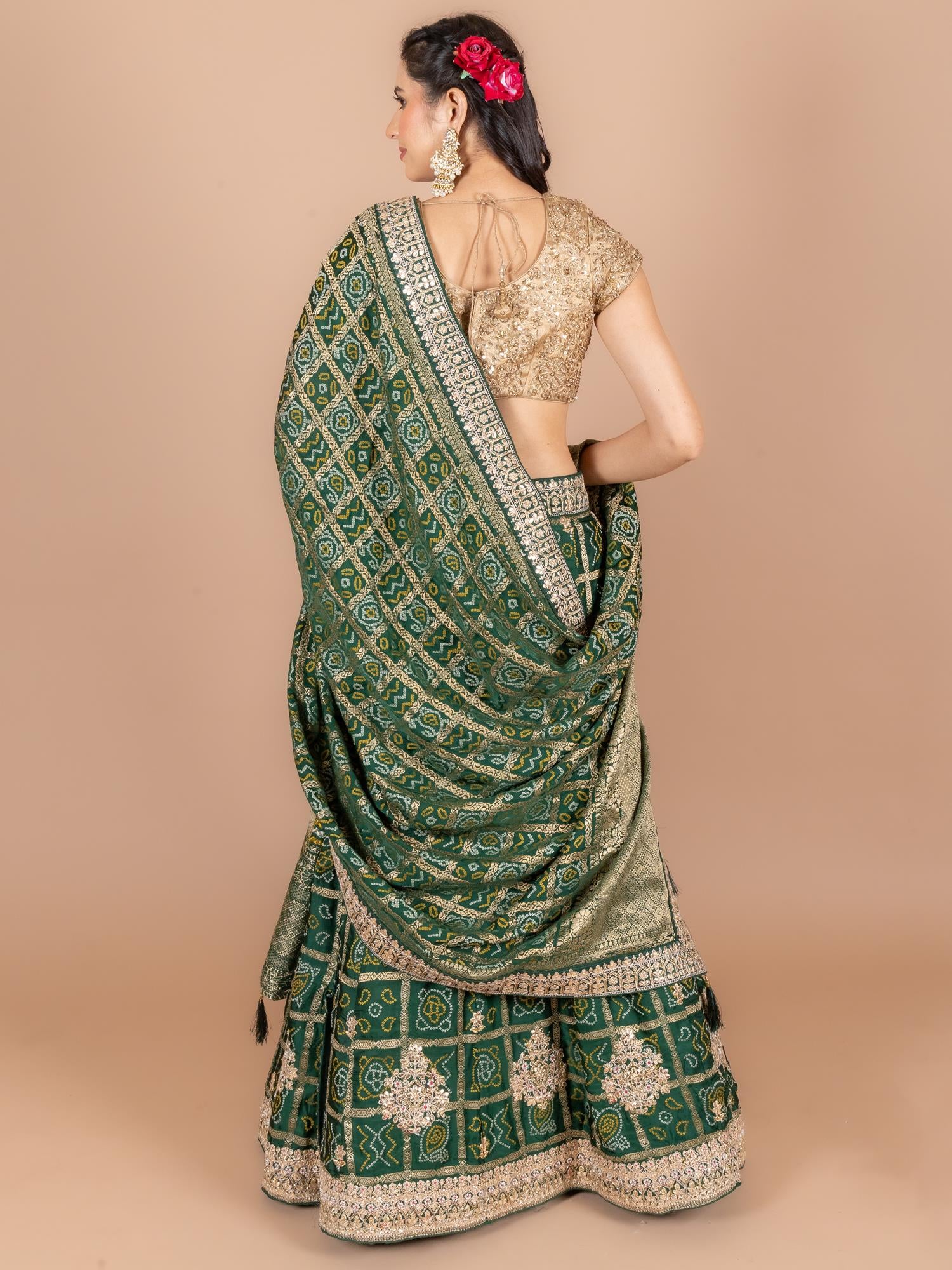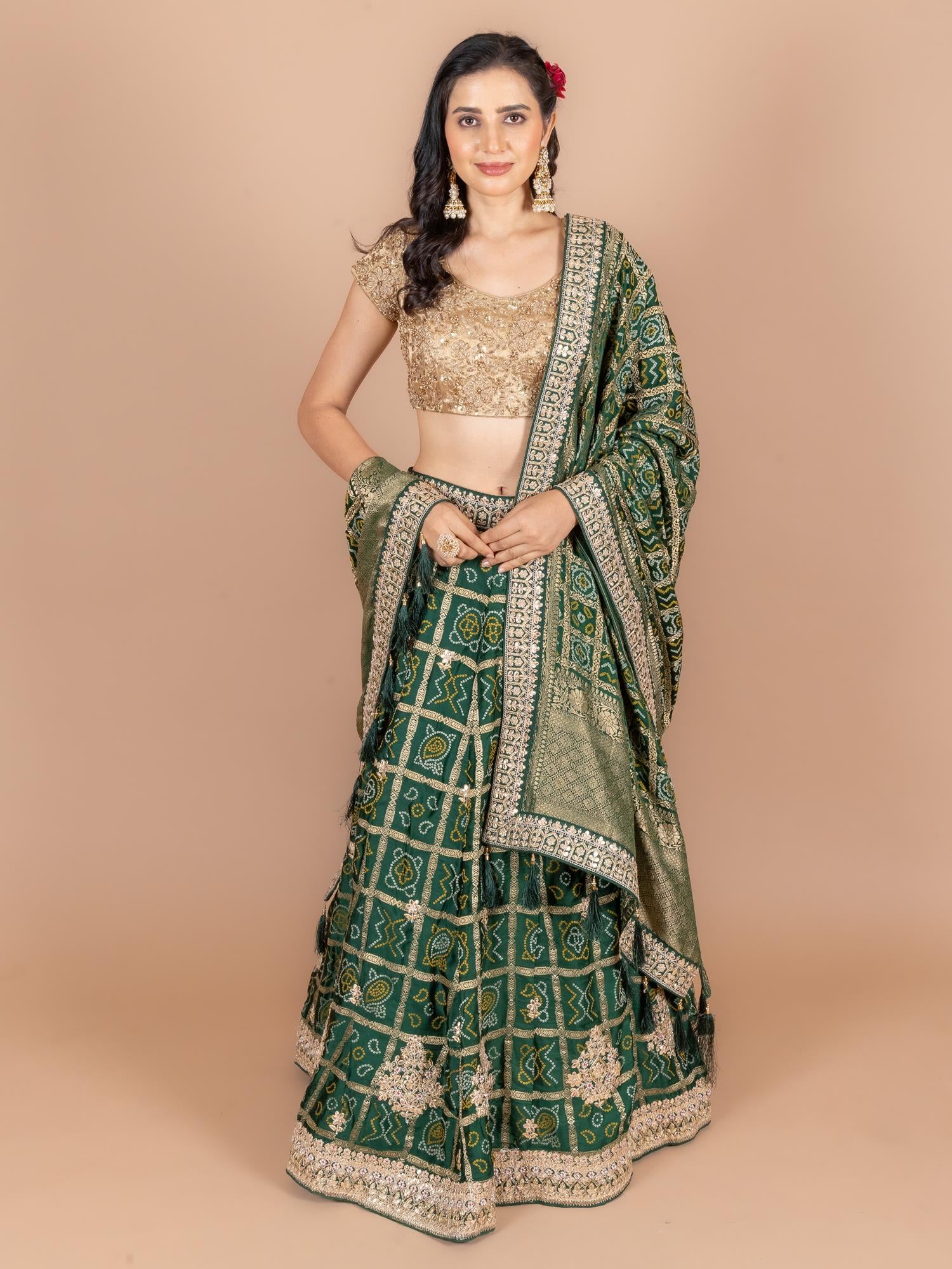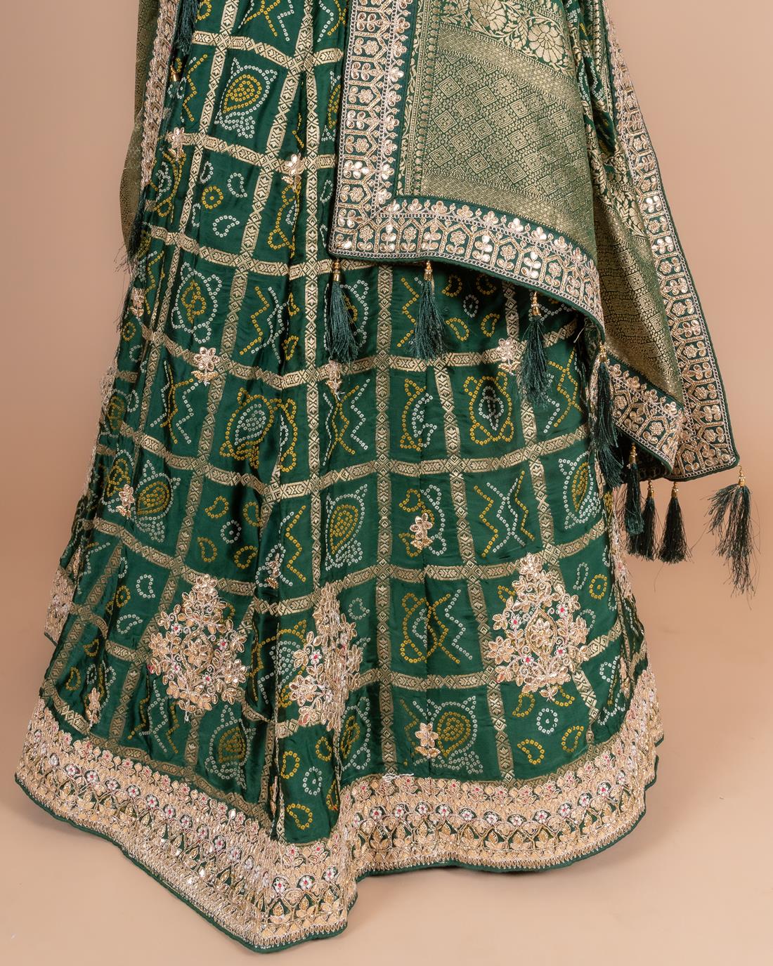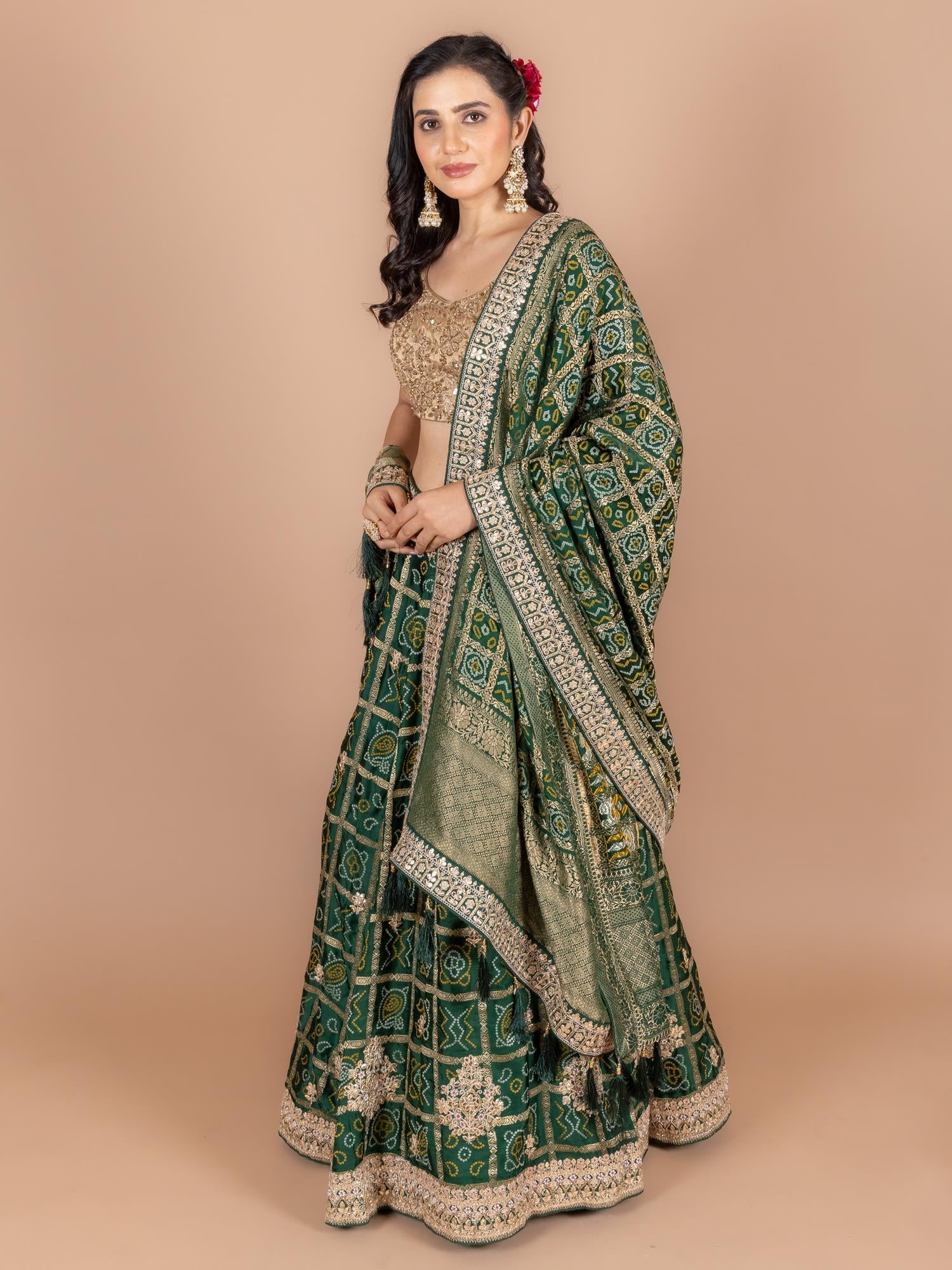 Lehenga Color : Bottle Green Lehenga Fabric : Art Satin Lehenga Work : Gota , Moti , dori ,resham Dupatta Color : Bottle Green Dupatta Fabric : Art Satin Dupatta Work : Gota , Moti , dori ,resham Blouse Color : Bottle Green Blouse Fabric : Art Satin Blouse Work : Gota , Moti , dori ,resham |