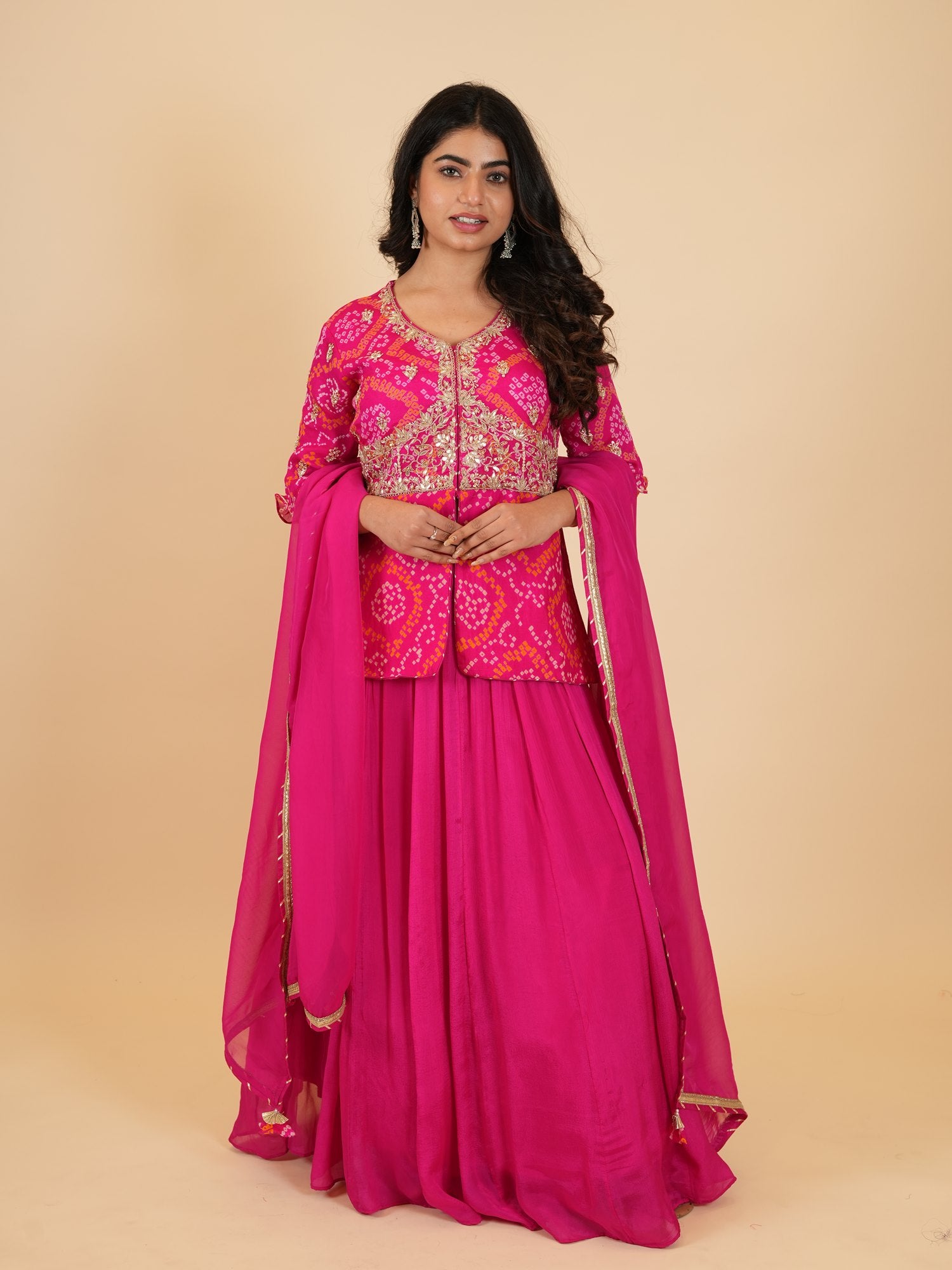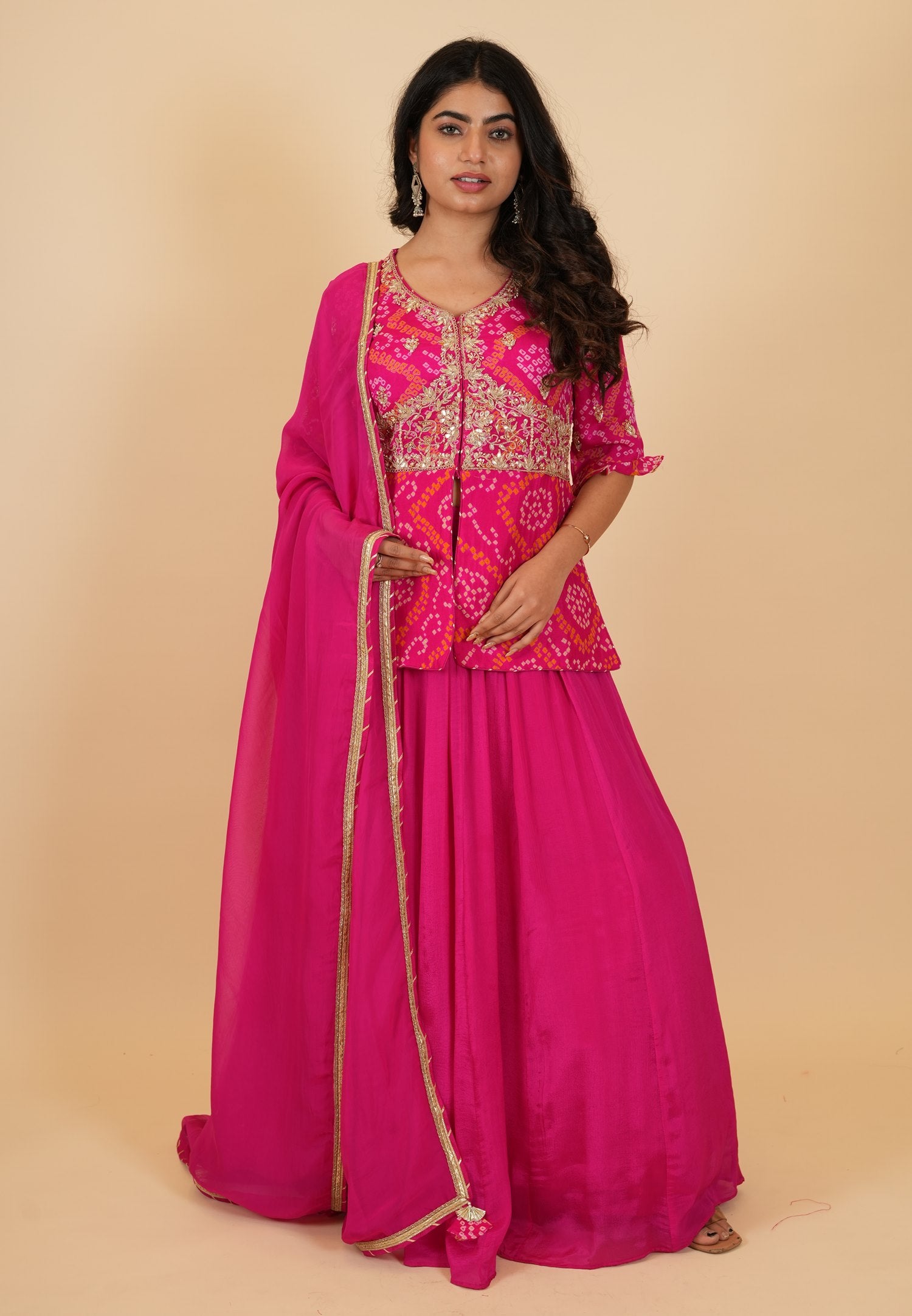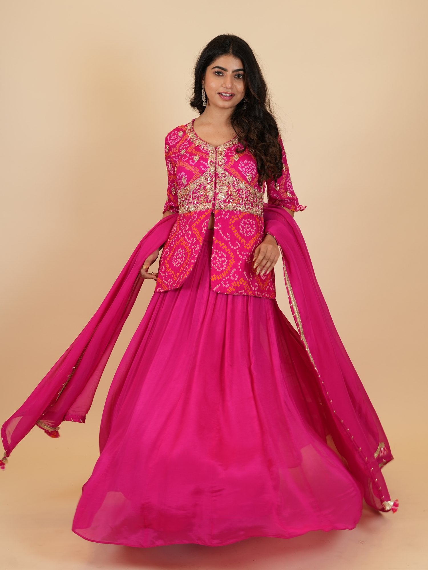 | Jacket Color : Rani Jacket Fabric : Chinon Bandhej Jacket Work : Zardosi, Moti , Sequine, Dori, Gota Patti Dupatta Color : Rani Dupatta Fabric : Art Organza Dupatta Border : Lace Bottom Type : Skirt Skirt Color : Rani Skirt Fabric : Chinon Silk |