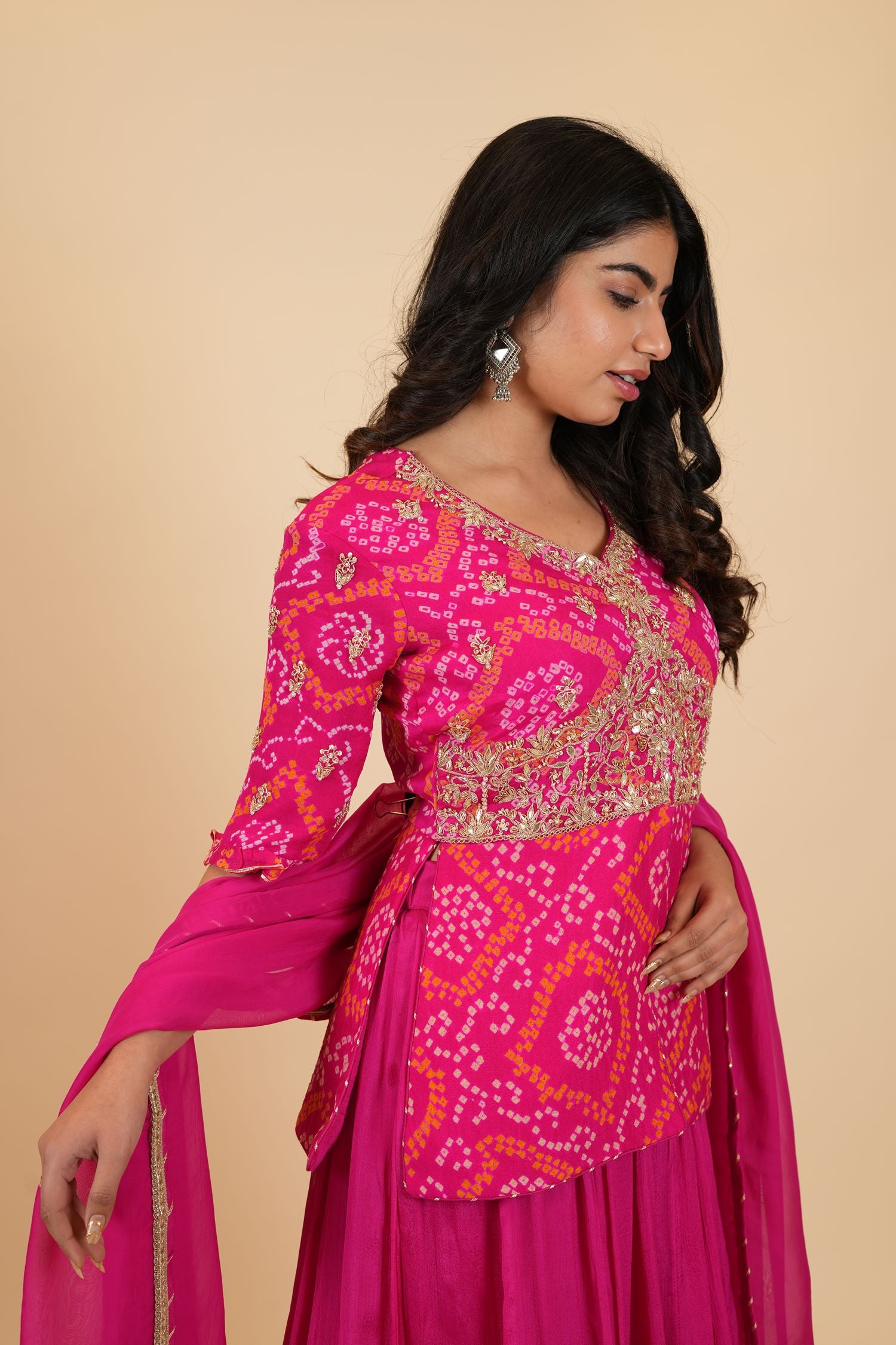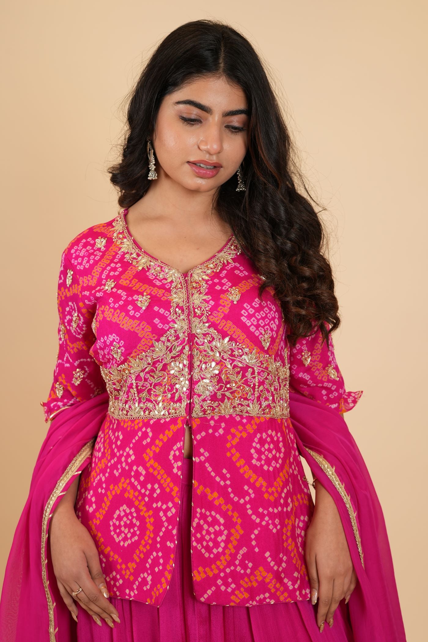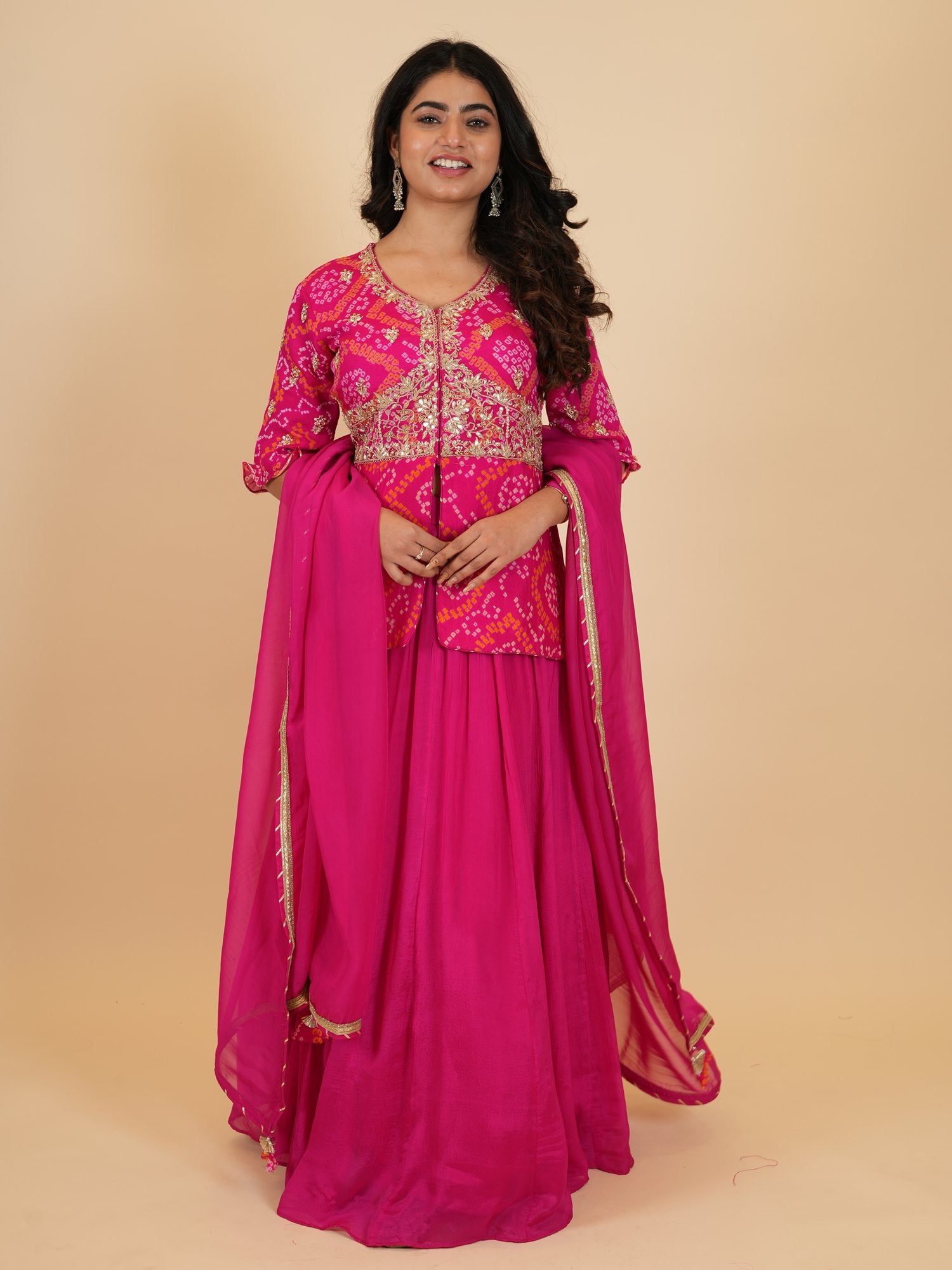 | Jacket Color : Rani Jacket Fabric : Chinon Bandhej Jacket Work : Zardosi, Moti , Sequine, Dori, Gota Patti Dupatta Color : Rani Dupatta Fabric : Art Organza Dupatta Border : Lace Bottom Type : Skirt Skirt Color : Rani Skirt Fabric : Chinon Silk |