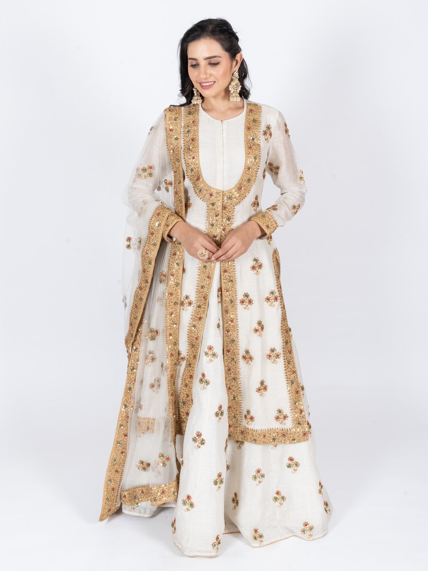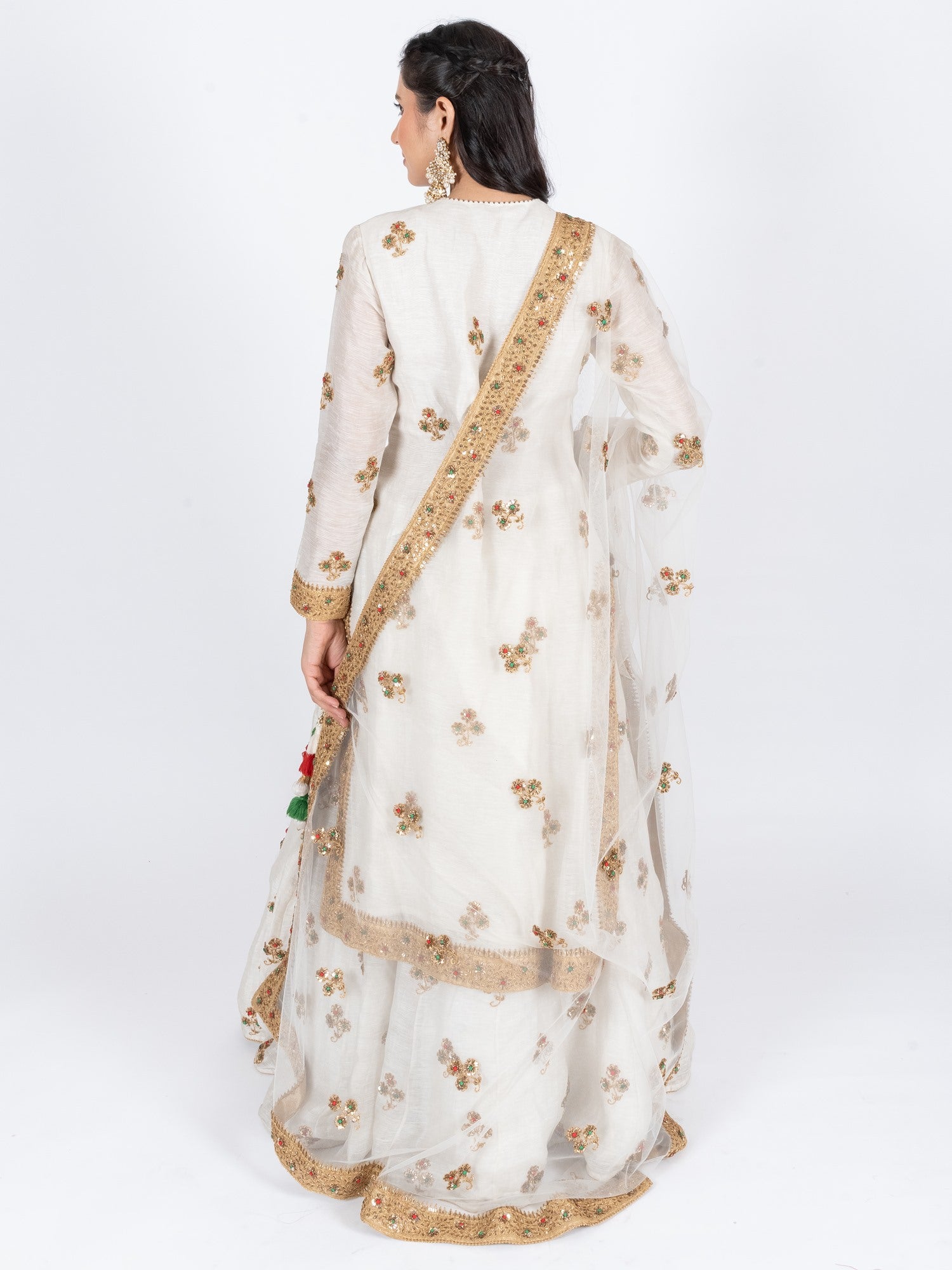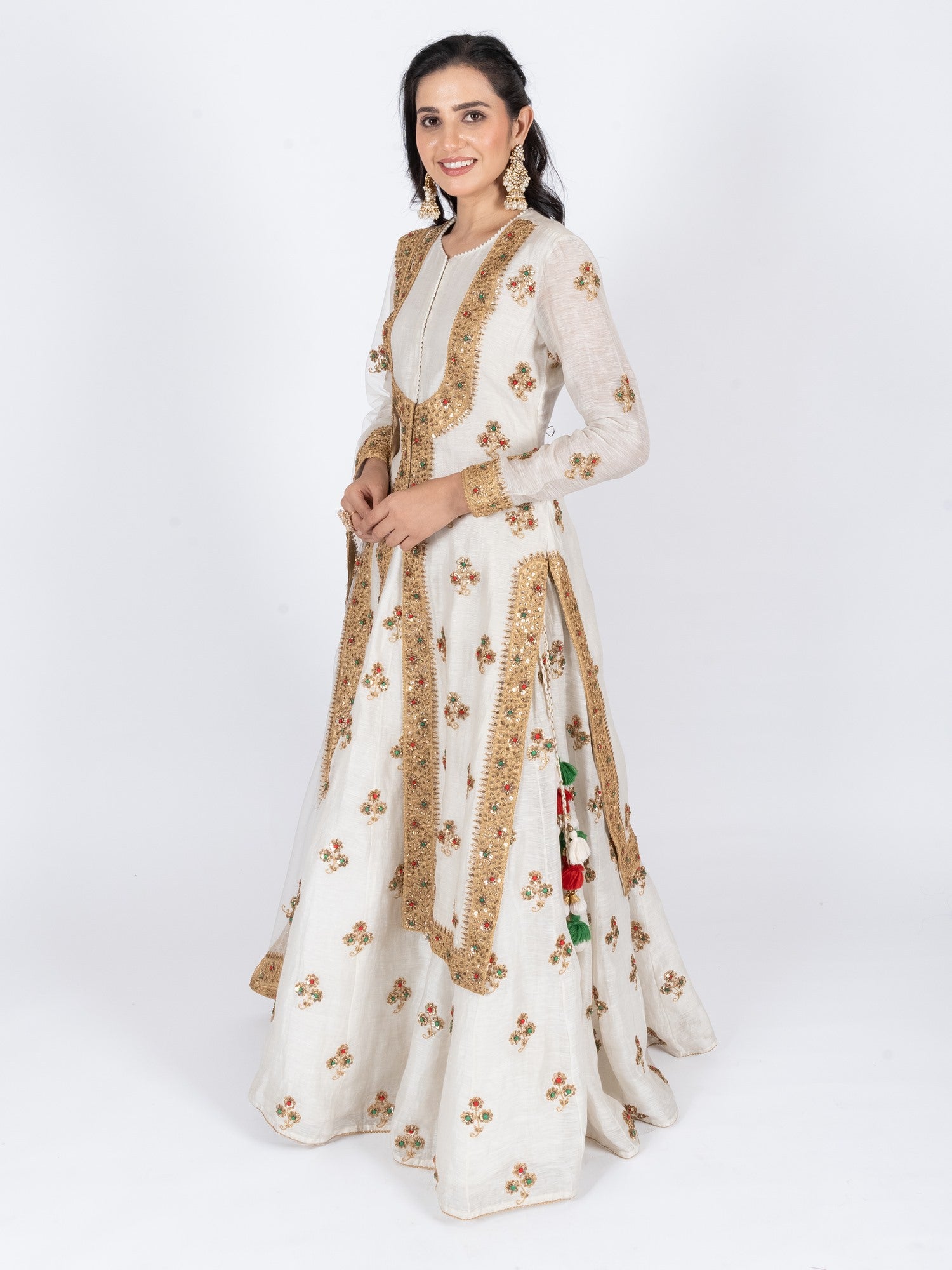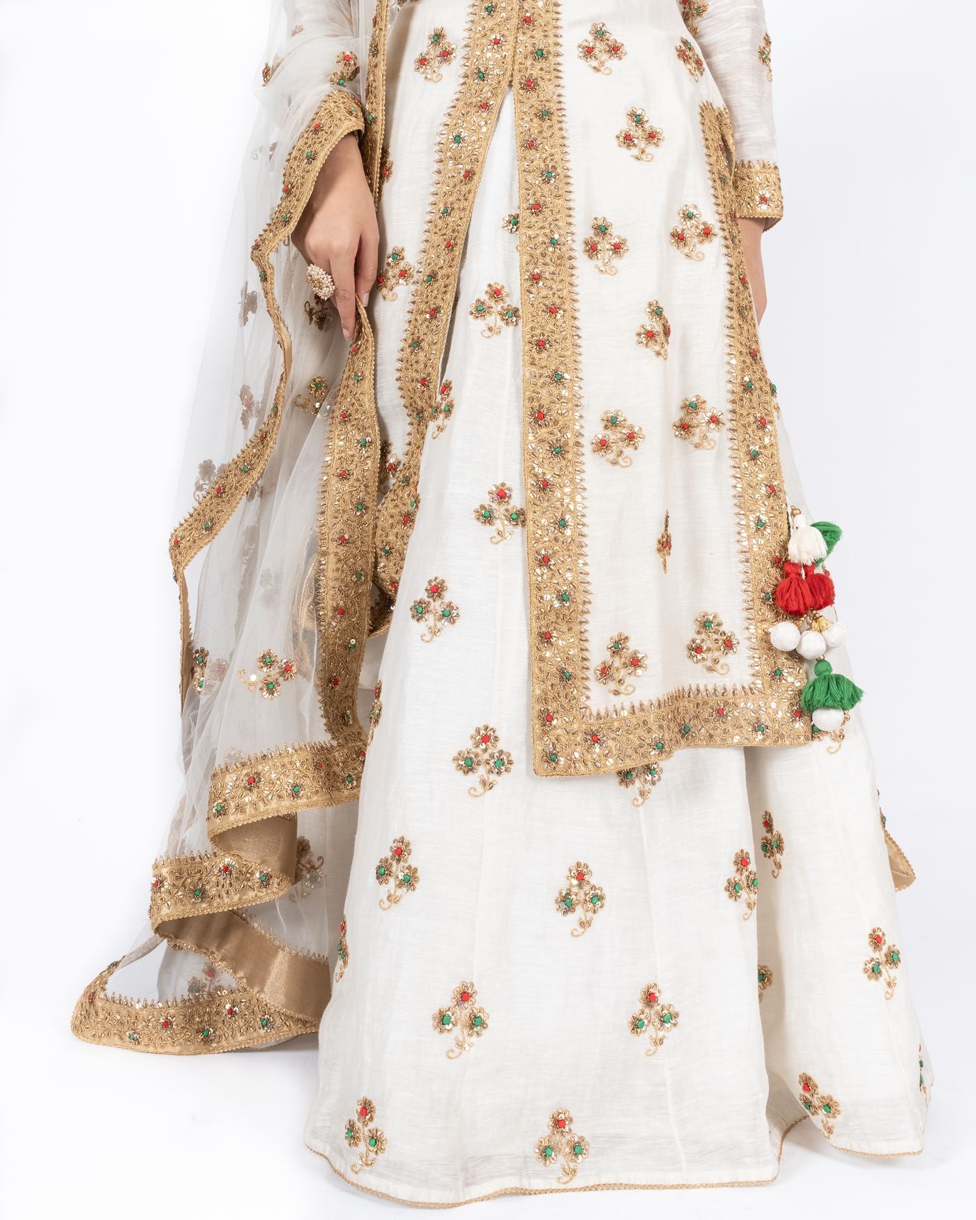 | Lehenga Color : Cream Lehenga Fabric : Linen Lehenga Work : Dori , sequins, salma, budwork Dupatta Color : Cream Dupatta Fabric : Net Dupatta Work : Dori , sequins, salma, budwork Long Jacket Color : Cream Long Jacket Fabric : Linen Long Jacket : Dori , sequins, salma, budwork |