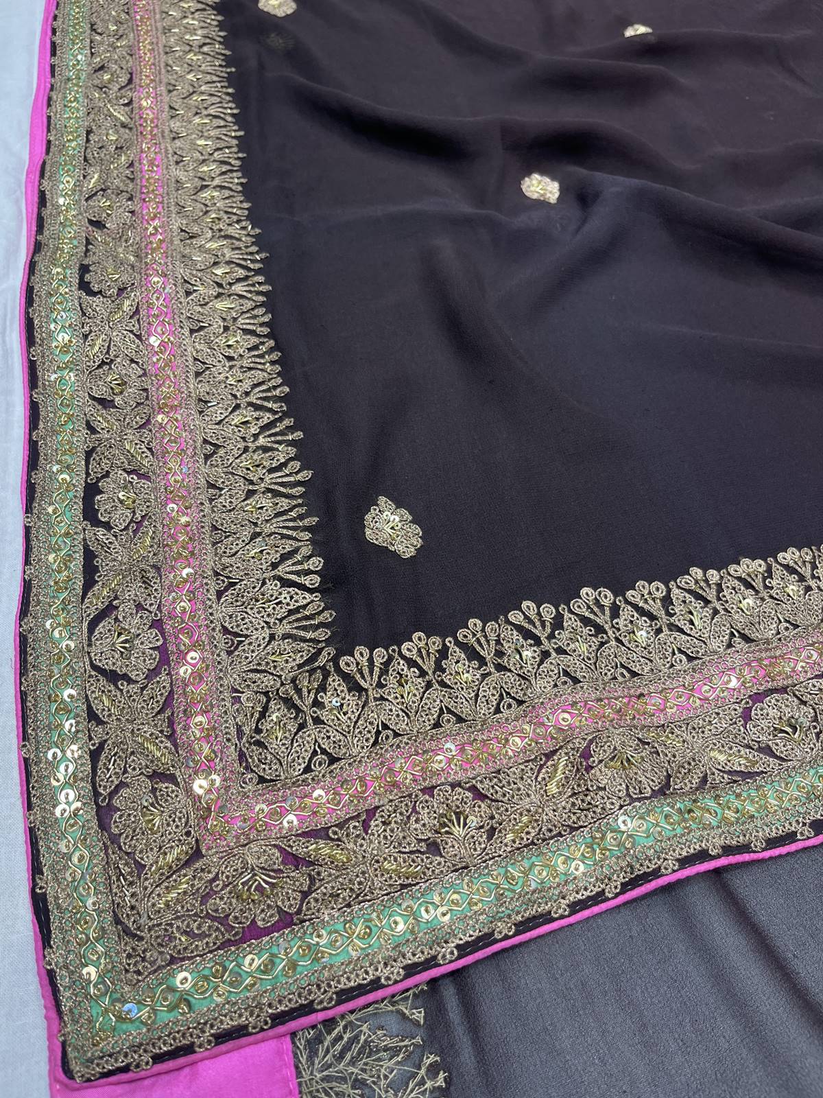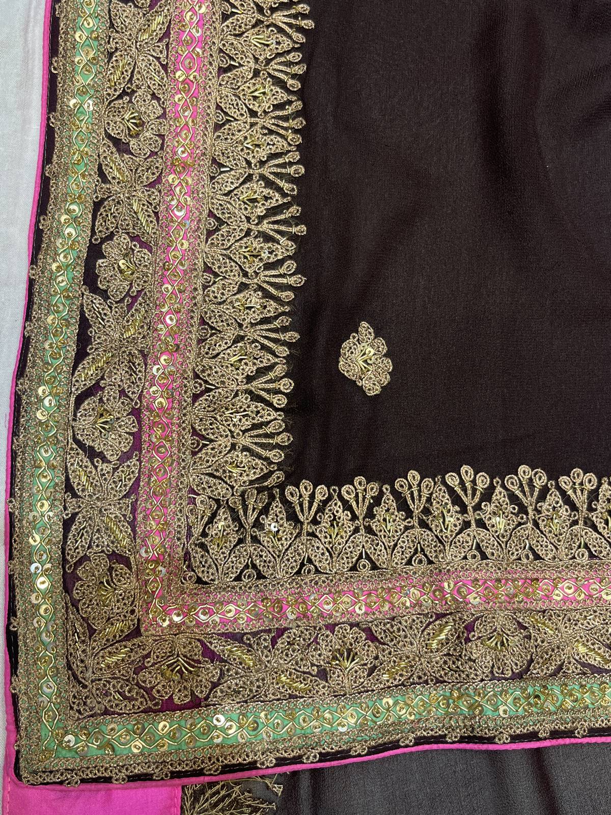 Saree Color : Brown Saree Fabric : Georgette Saree Work : Marori, Zardosi , Sequine Blouse Color : Pink Blouse Fabric : Silk Blouse Work : Marori, Zardosi , Sequine |