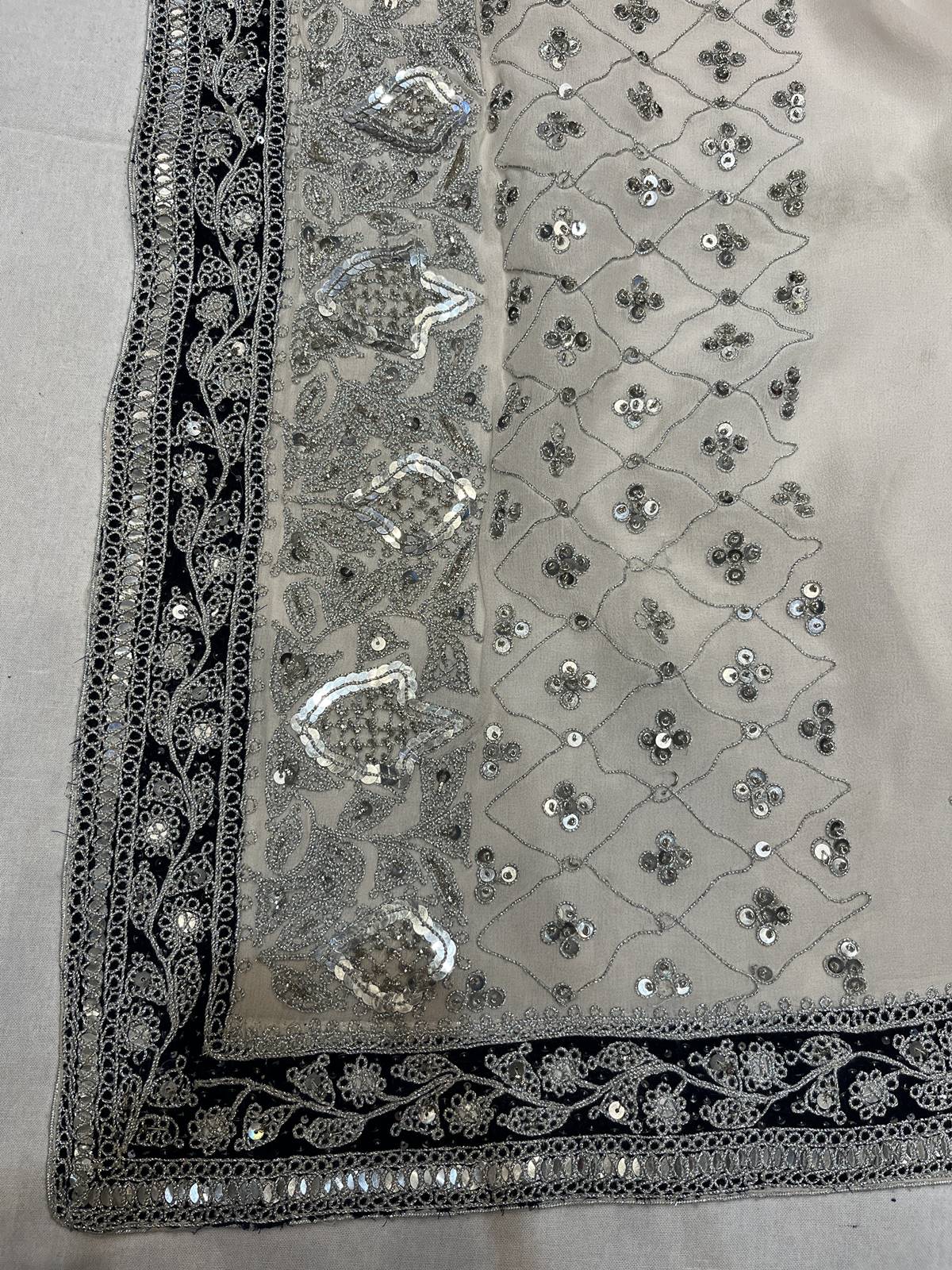 Saree Color : Beige Saree Fabric : Georgette Saree Work : Marori , Sequine Blouse Color : Blue Blouse Fabric : Art chinon Blouse Work : Marori , Sequine |