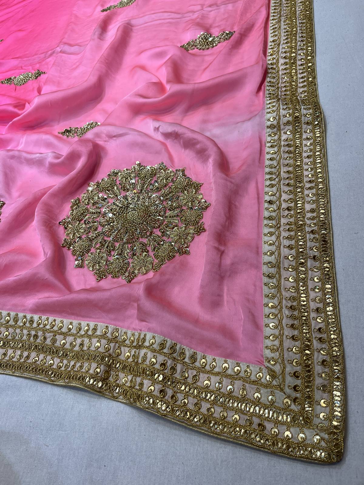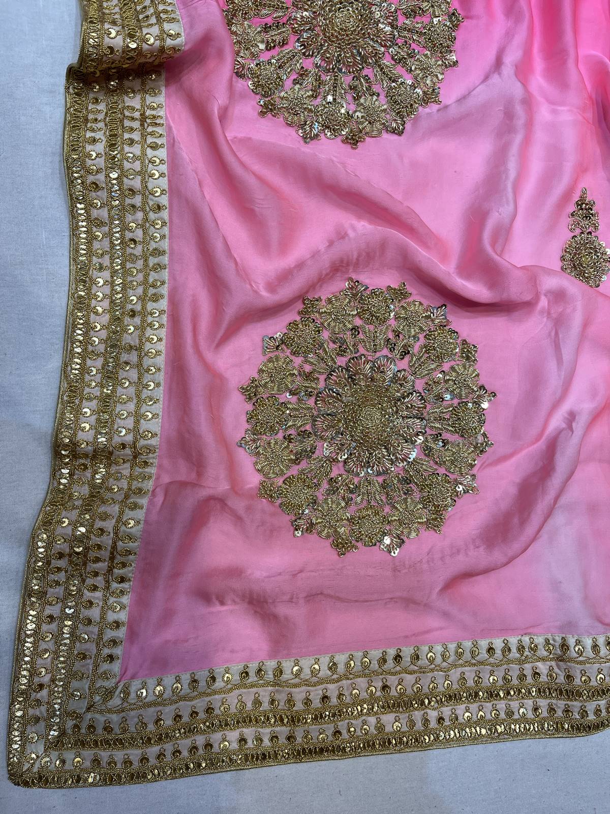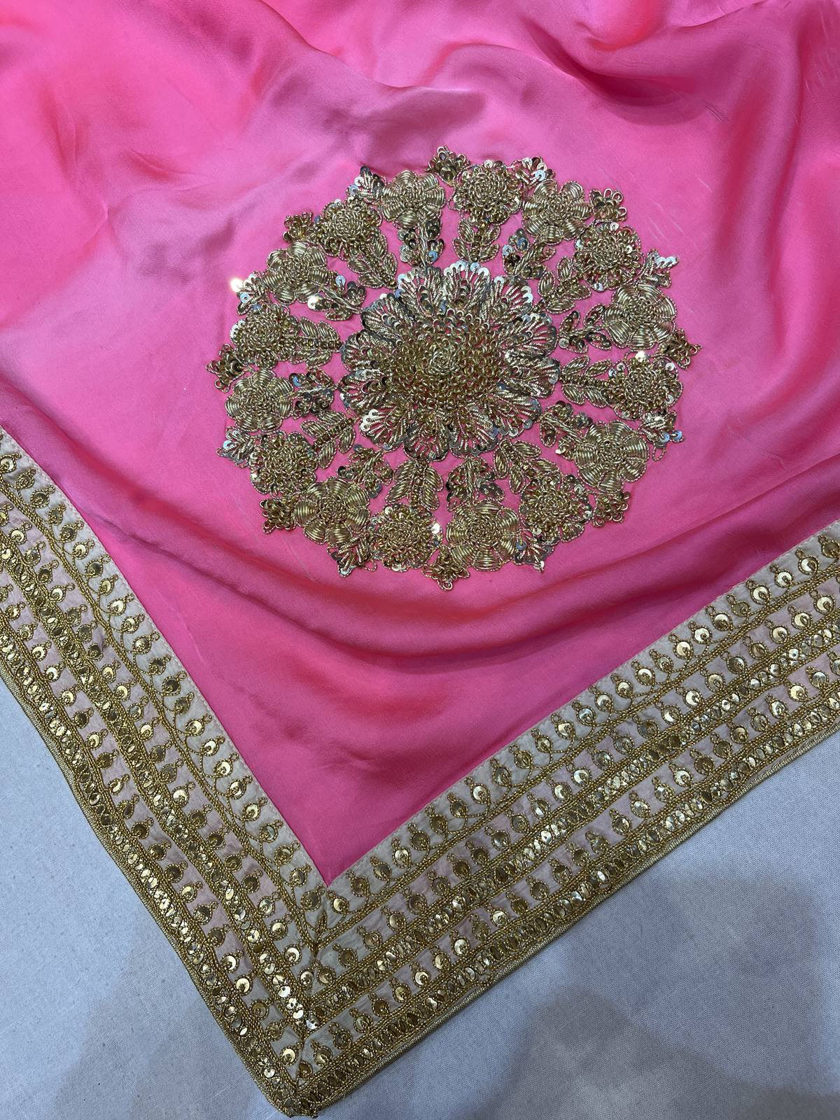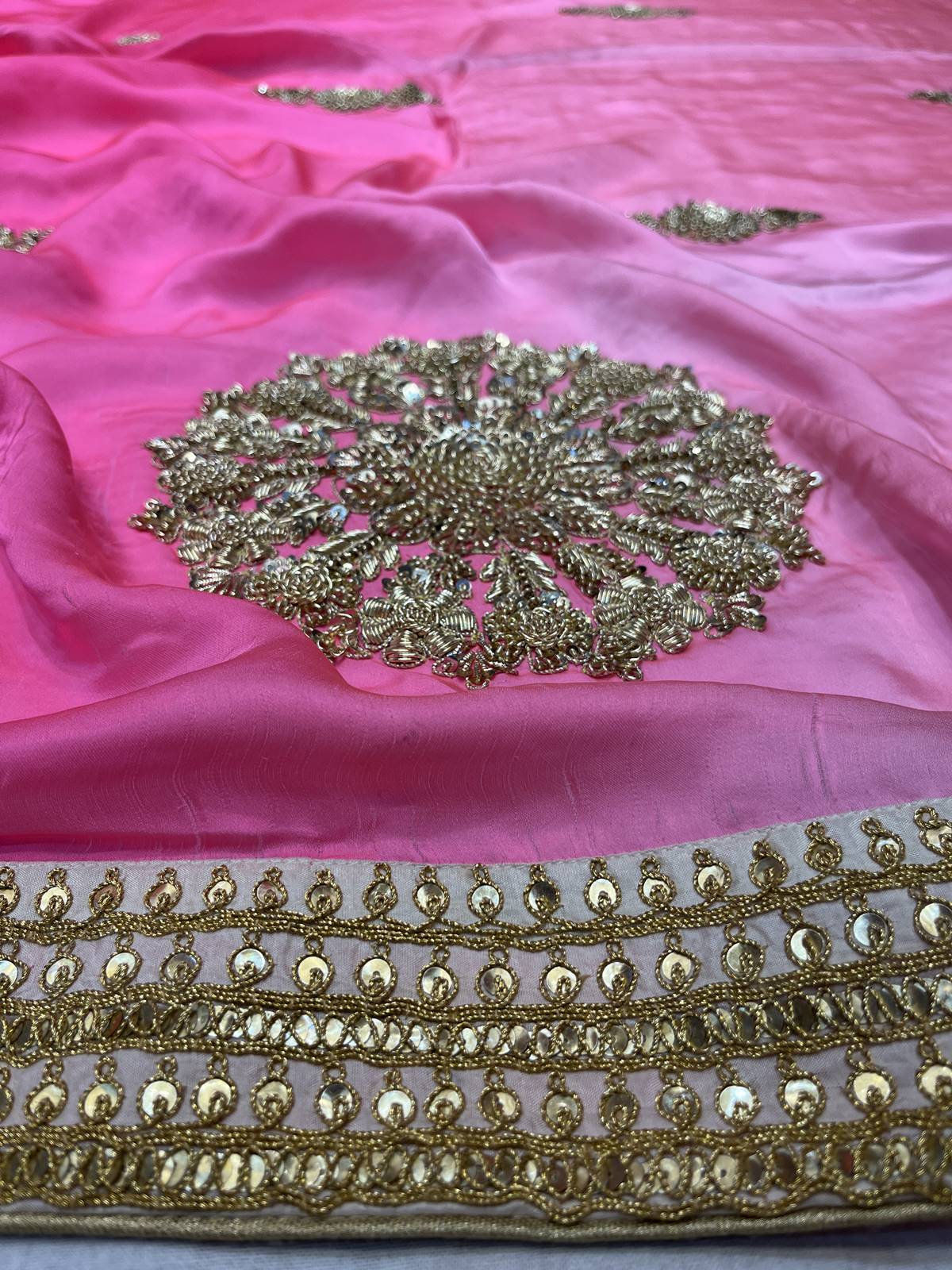 Saree Color : Pink Saree Fabric : Silk Saree Work : Marori , Sequins, Zardosi Blouse Color : Cream Blouse Fabric : Georgette Blouse Work : Marori , Sequins, Zardosi |