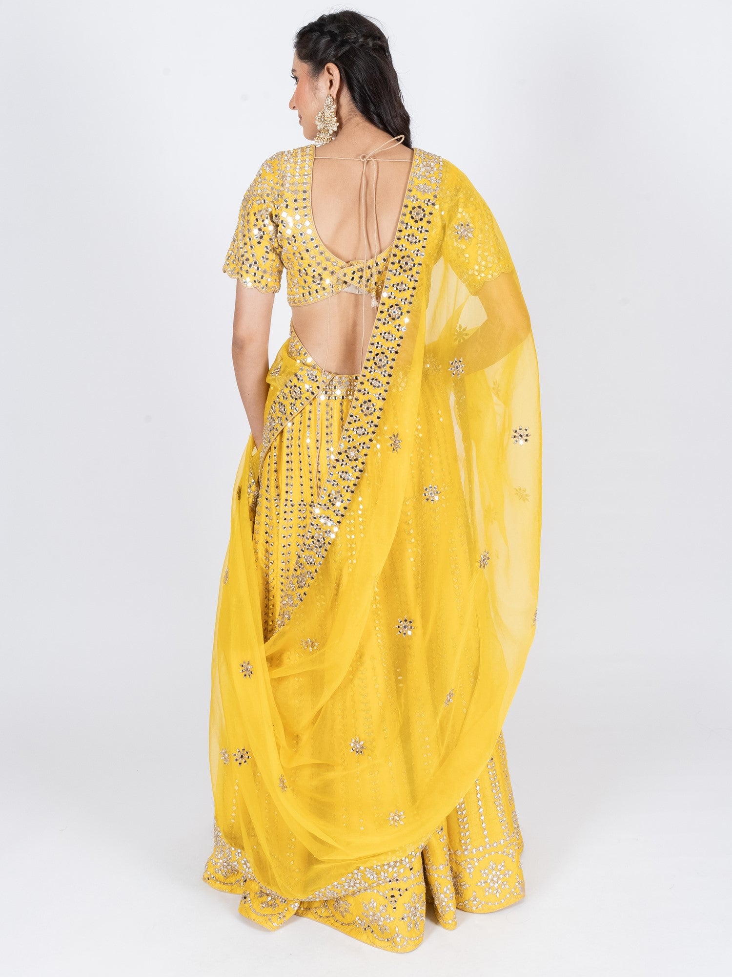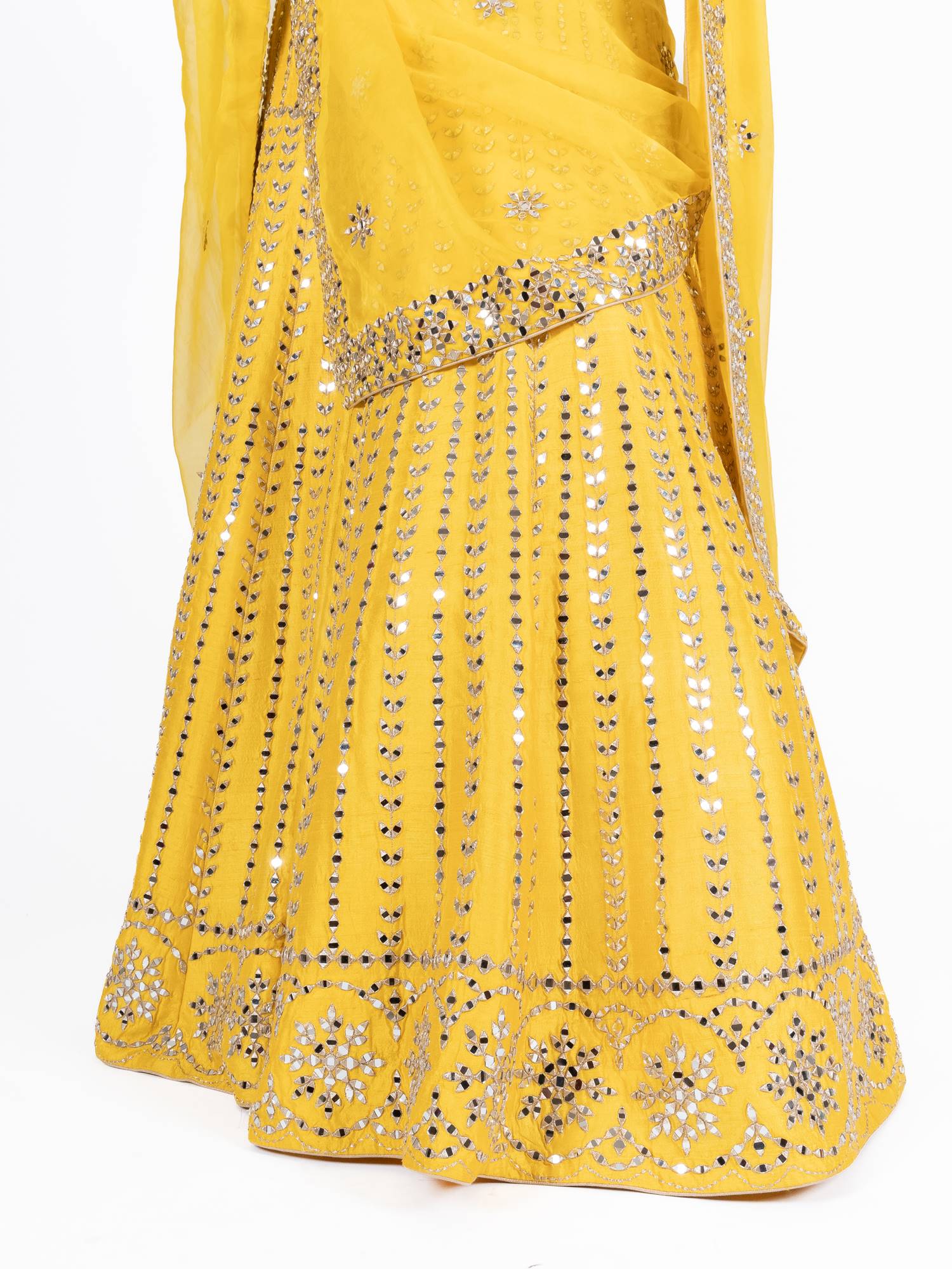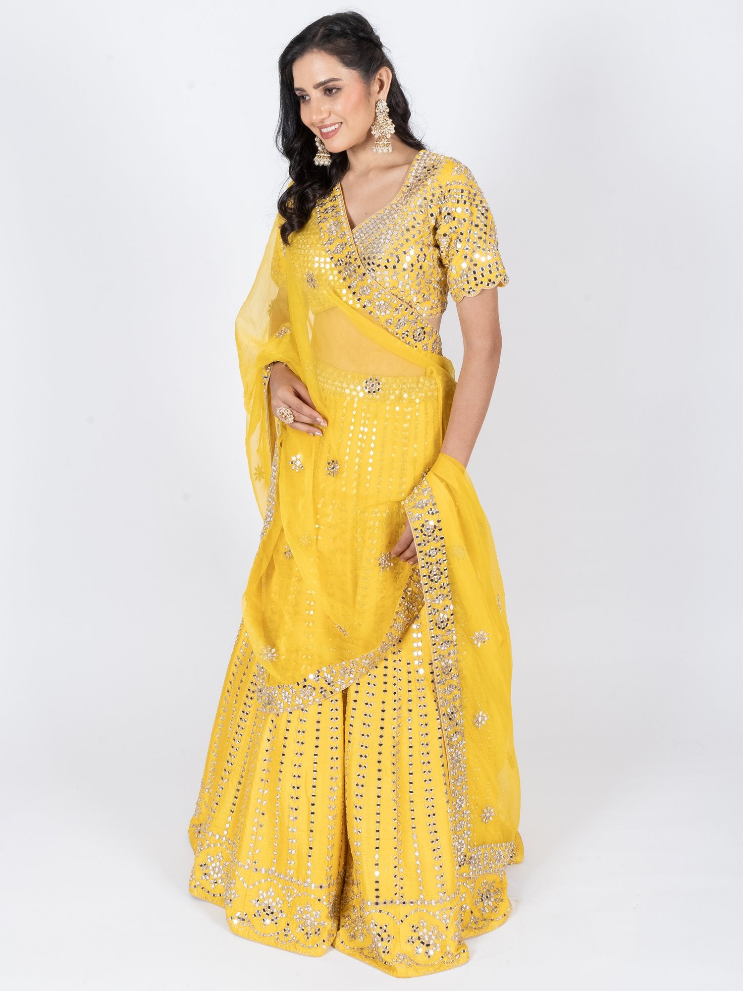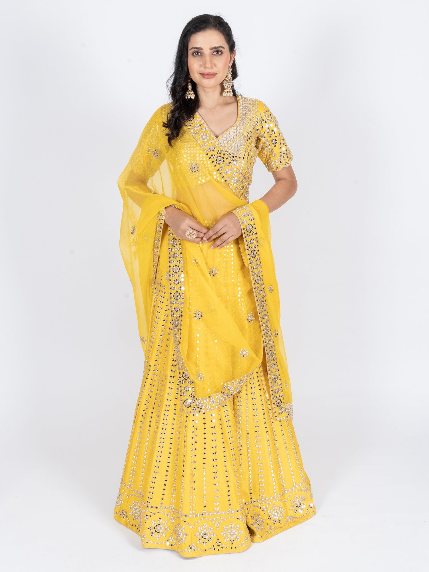 This Ranas Mirror work Designer Lehenga in yellow is the perfect combination of trendy and traditional. The intricate mirror work adds a touch of elegance, making it ideal for mehendi functions and ring ceremonies. Elevate your look and stand out with this stunning lehenga.