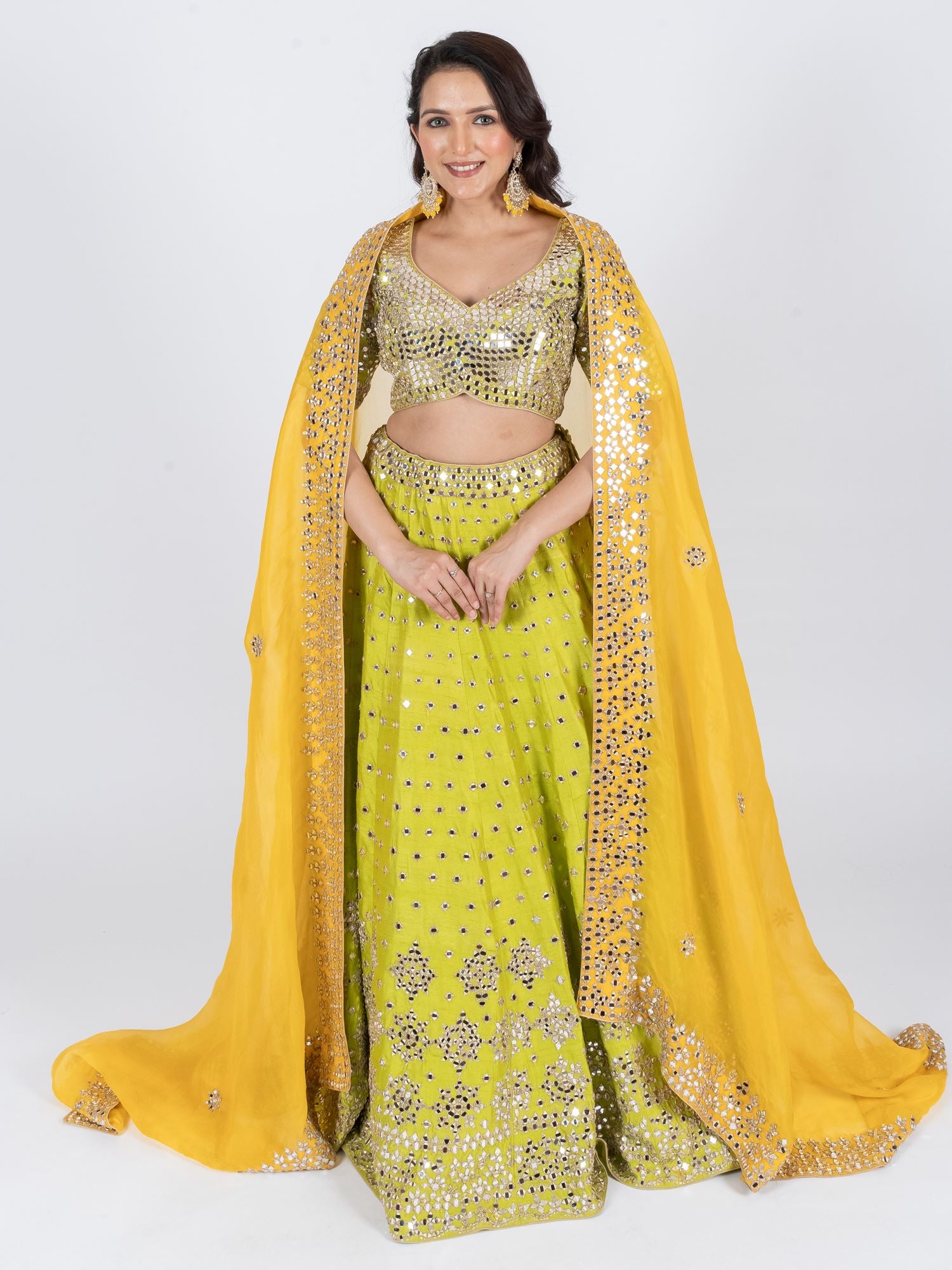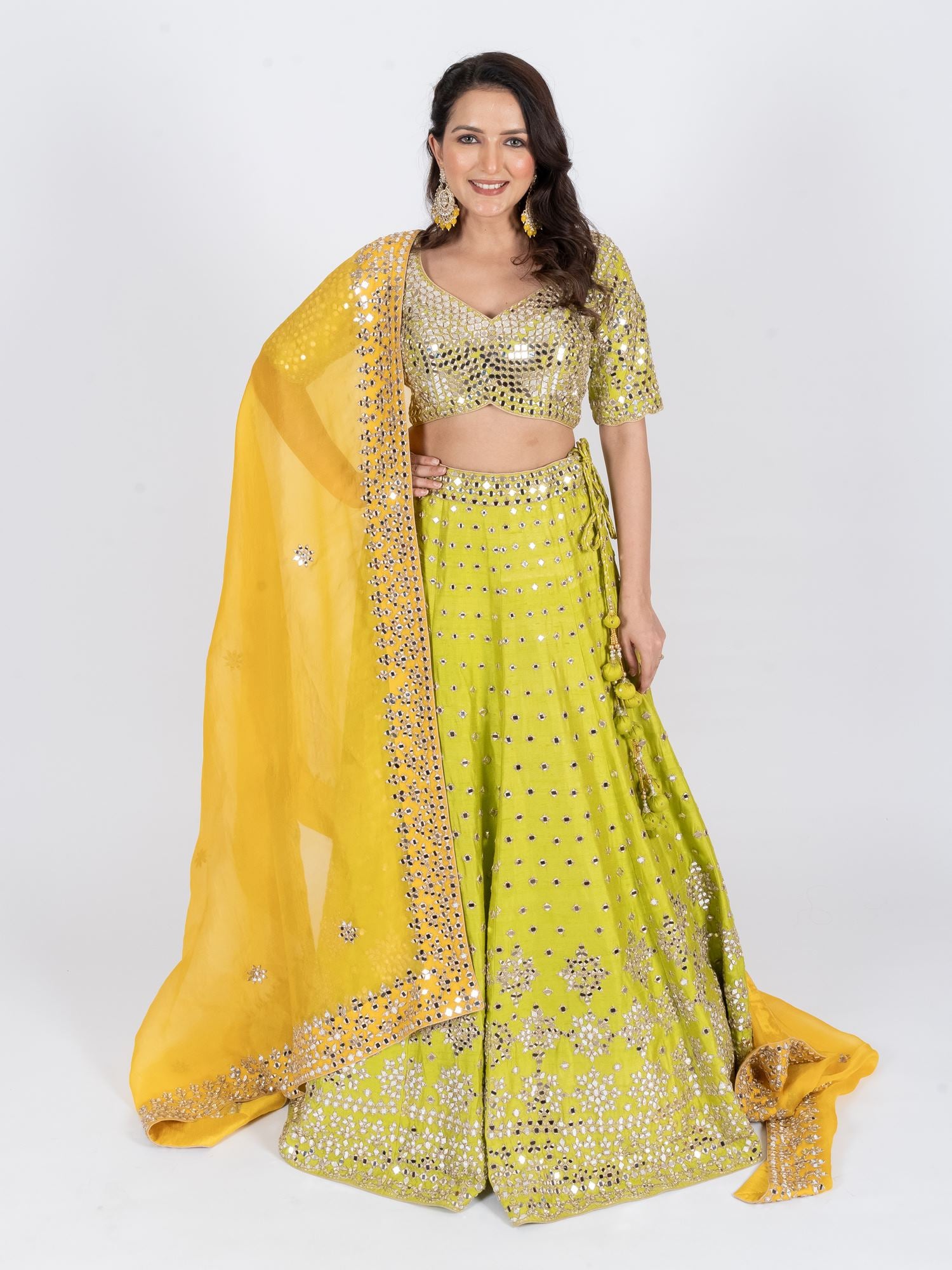 | Lehenga Color : Parrot Green Lehenga Fabric : Raw silk Lehenga Work : Mirror , Kasab Dupatta Color : Yellow Dupatta Fabric : Organza Dupatta Work : Mirror, Kasab Blouse Color : Parrot Green Blouse Fabric : Raw Silk Blouse Work :Β Mirror, Kasab |