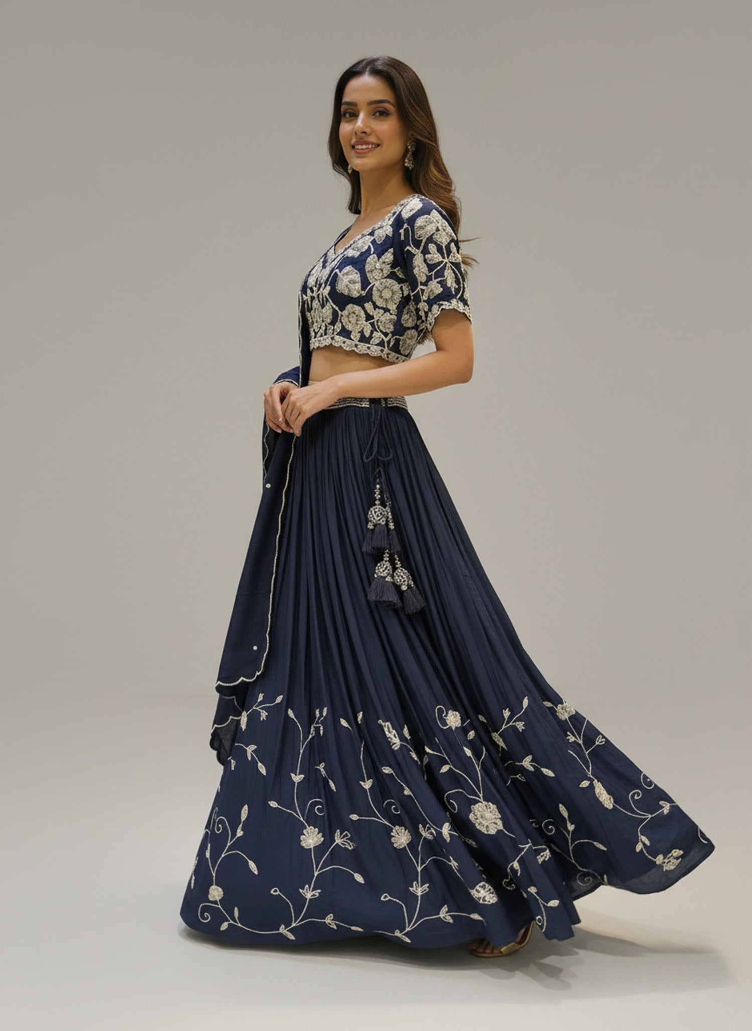 Lehenga Color : Navy Blue Lehenga Fabric : Crepe Georgette Lehenga Work : Cutdana , Sequine & Pearl Dupatta Color : Navy Blue Dupatta Fabric : Crepe Georgette Dupatta Work : Cutdana , Sequine & Pearl Blouse Color : Navy Blue Blouse Fabric : Crepe Georgette Blouse Work : Cutdana , Sequine & Pearl |
