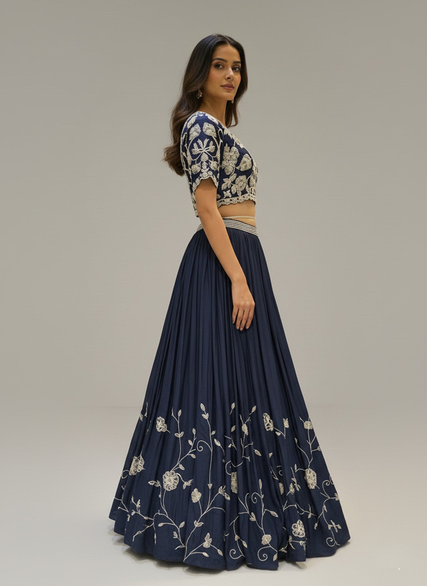 Elevate your festive wardrobe with the Ranas Navy Blue Pearl Work Lehenga, crafted from luxurious crepe georgette for a graceful drape. Featuring intricate cutdana, sequence, and pearl embellishments, this lehenga combines traditional artistry with contemporary elegance. Ideal for weddings or special occasions, its detailed craftsmanship ensures you stand out with a refined, timeless look.