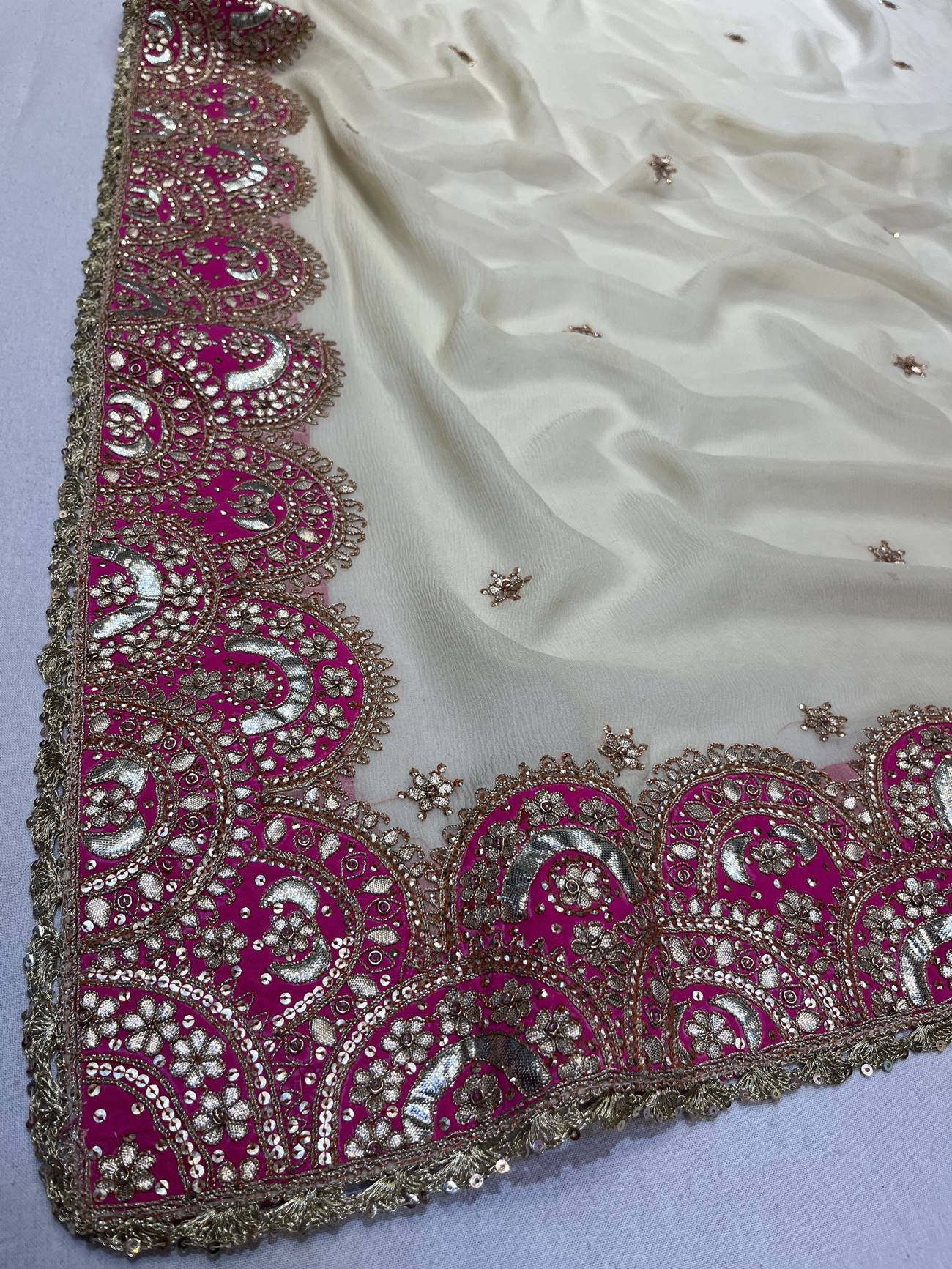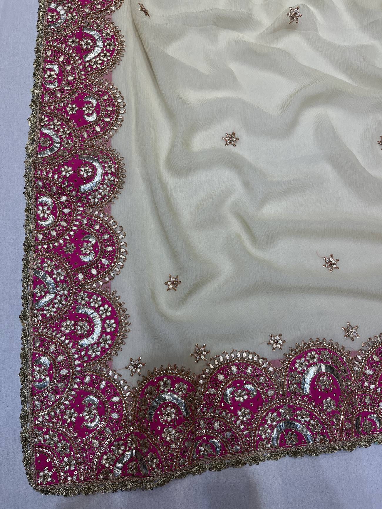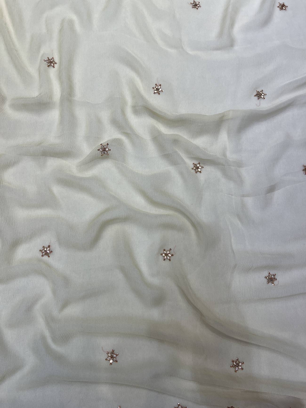 Saree Color : Off White Saree fabric : Pure Chiffon Saree Work : Gota Patti , Dori , Sequine Blouse Color : Off White Blouse Fabric : Crepe Blouse Work : Gota Patti , Dori , Sequine |