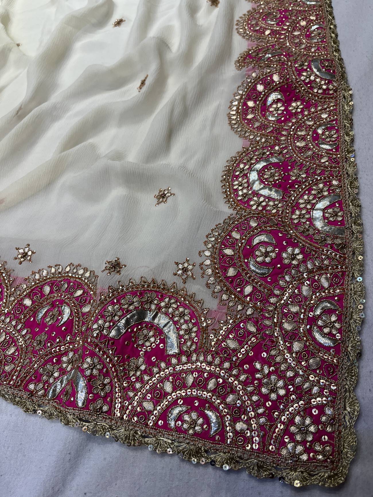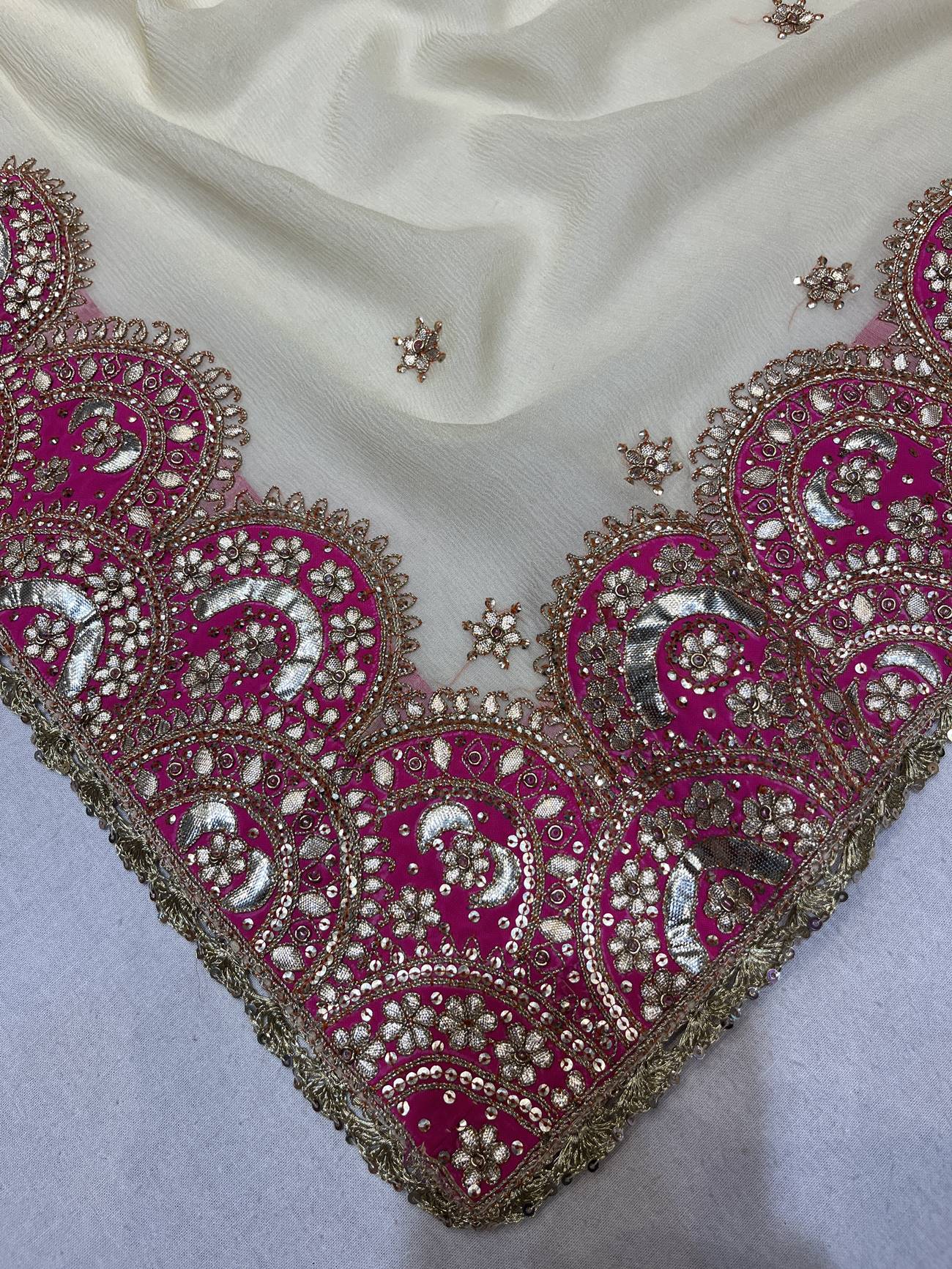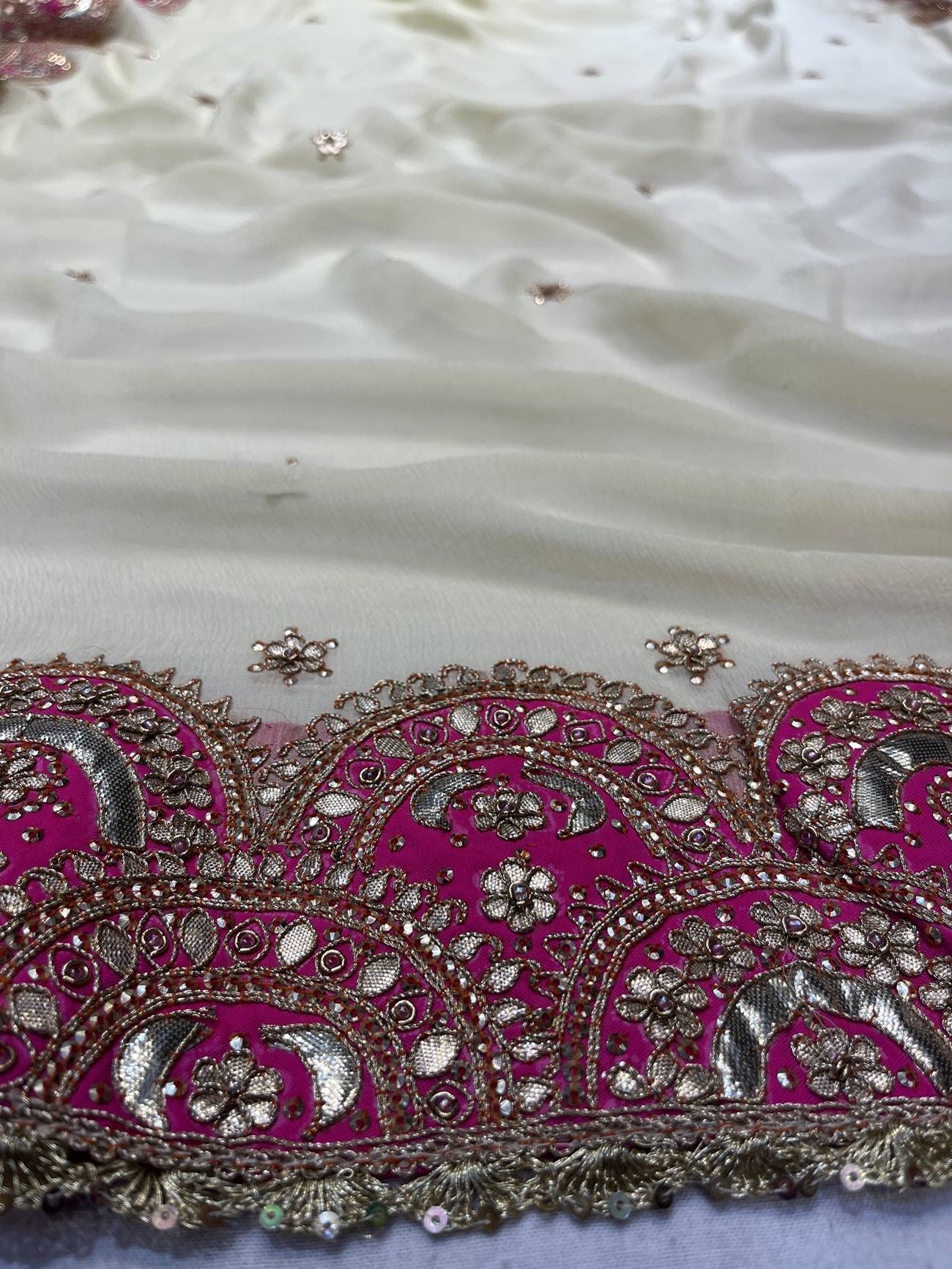 Saree Color : Off White Saree fabric : Pure Chiffon Saree Work : Gota Patti , Dori , Sequine Blouse Color : Off White Blouse Fabric : Crepe Blouse Work : Gota Patti , Dori , Sequine |