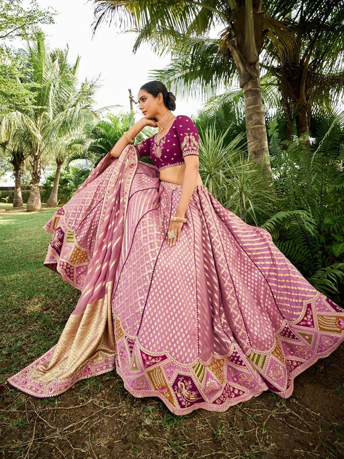This traditional Onion Pink Organza Silk Lehenga Set combines elegance with intricate craftsmanship. Crafted from lightweight organza fabric, the lehenga features a generous 3-meter gher adorned with detailed embroidery and handwork. Complemented by a vibrant cherry blouse and a matching organza dupatta, this ensemble offers a refined and cohesive look. Ideal for engagements, festivals, sangeet, and weddings, it ensures a graceful presence at any special occasion.