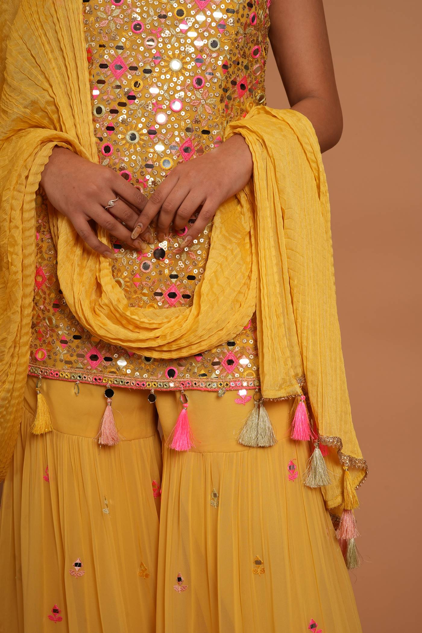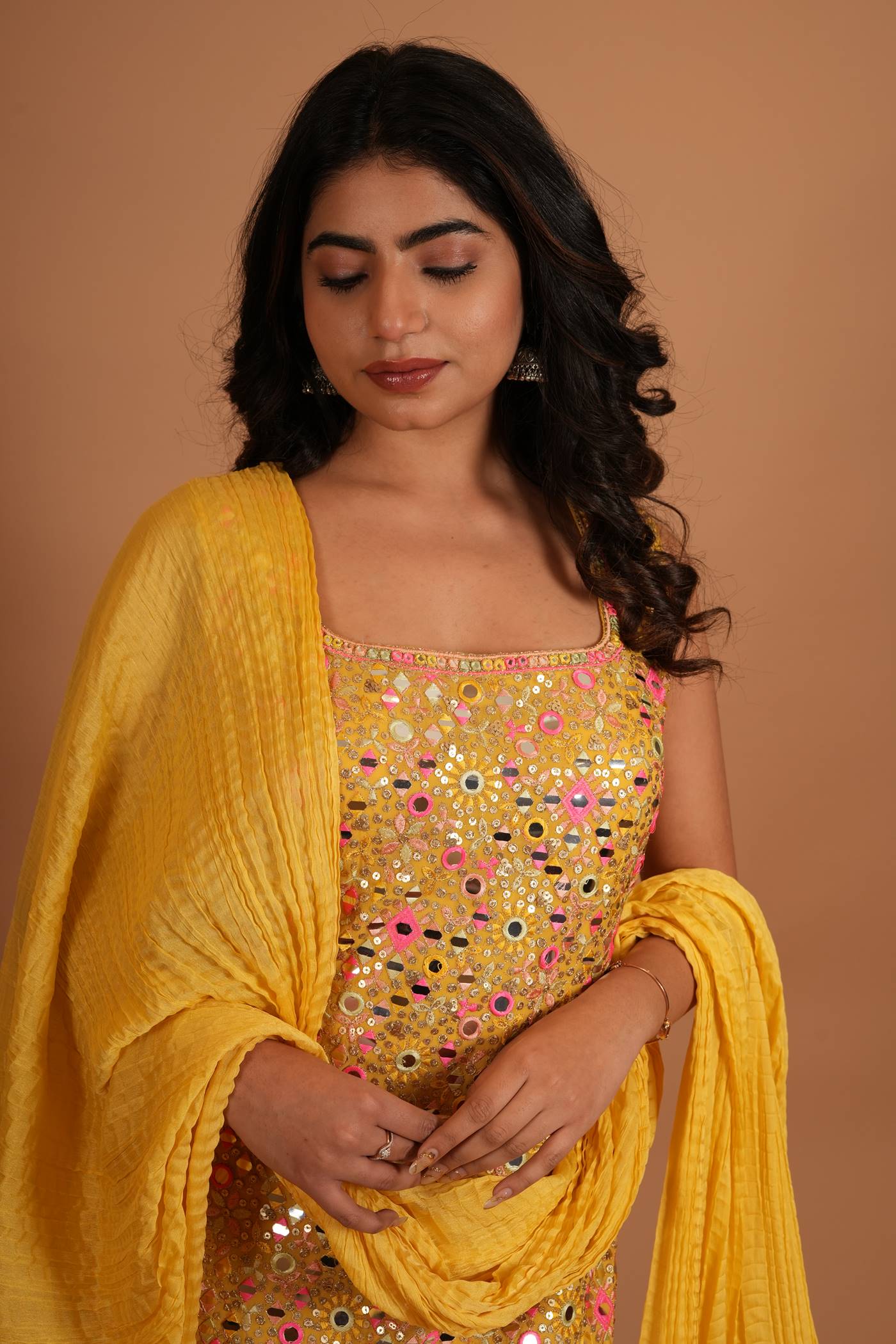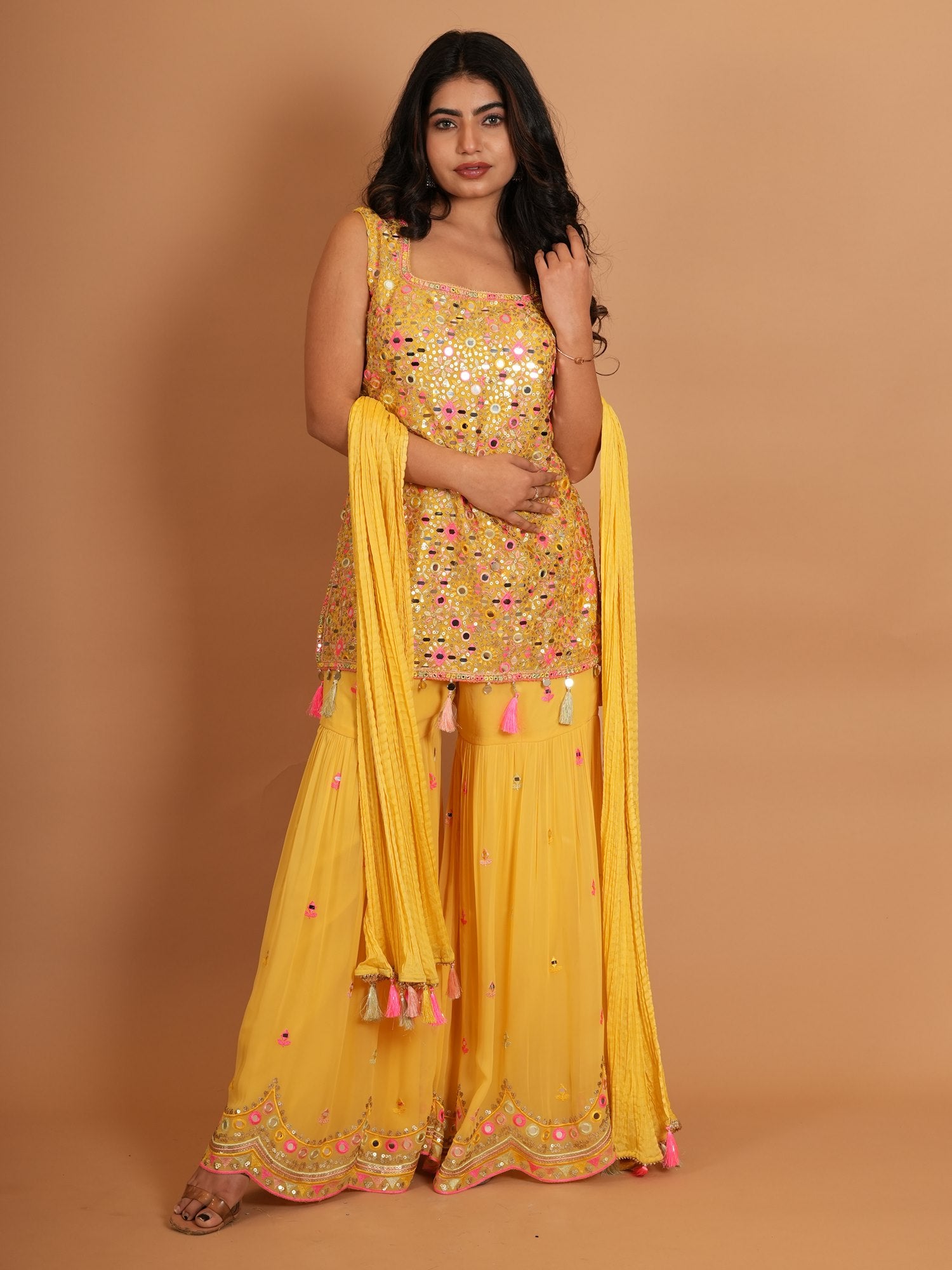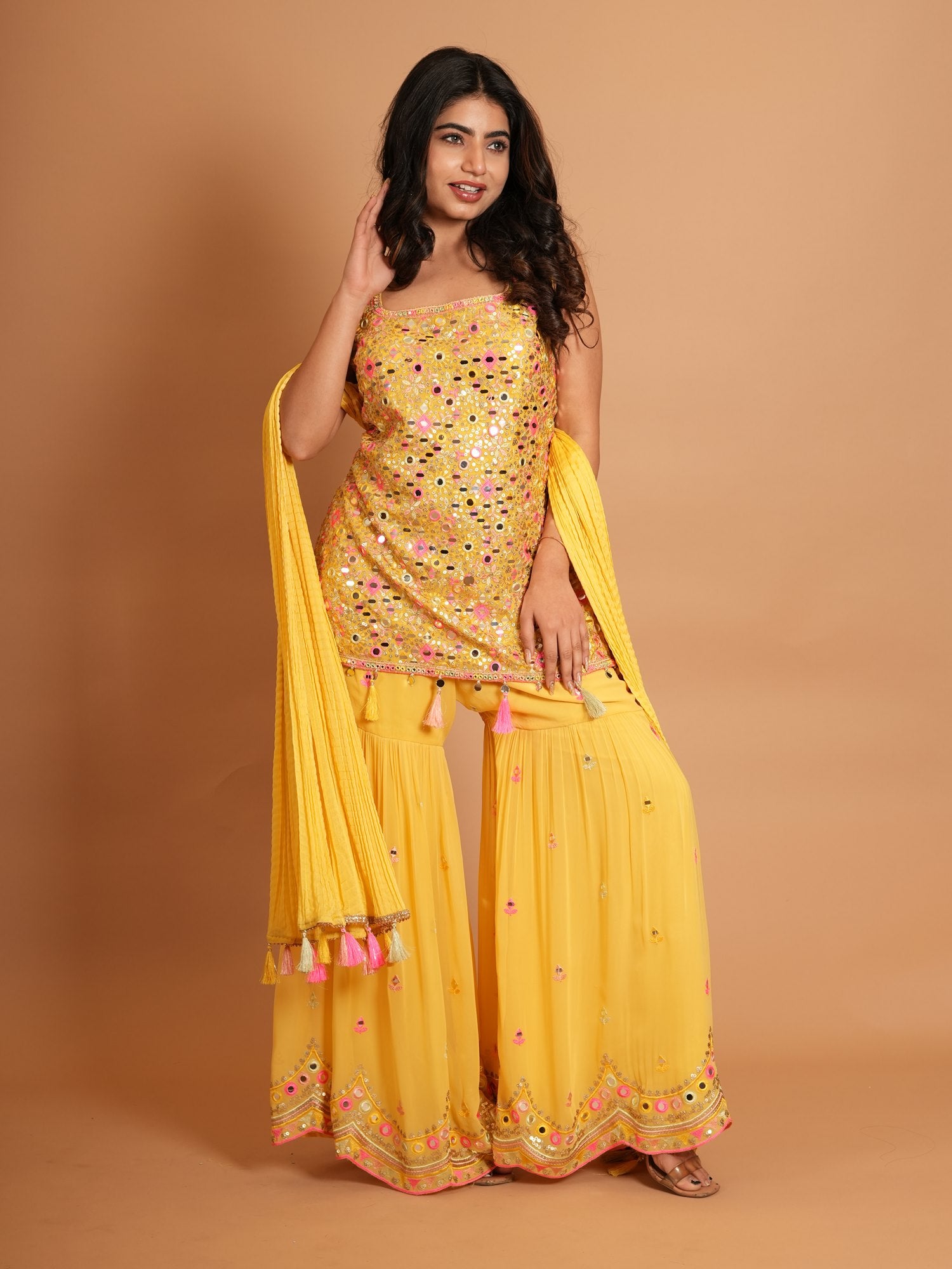Effortlessly stand out at any party in our Ranas Party wear sharara set. The intricate sequin and mirror work on the trendy yellow art georgette fabric adds an elegant touch while keeping you stylish. Perfect for any occasion- formal or casual.
