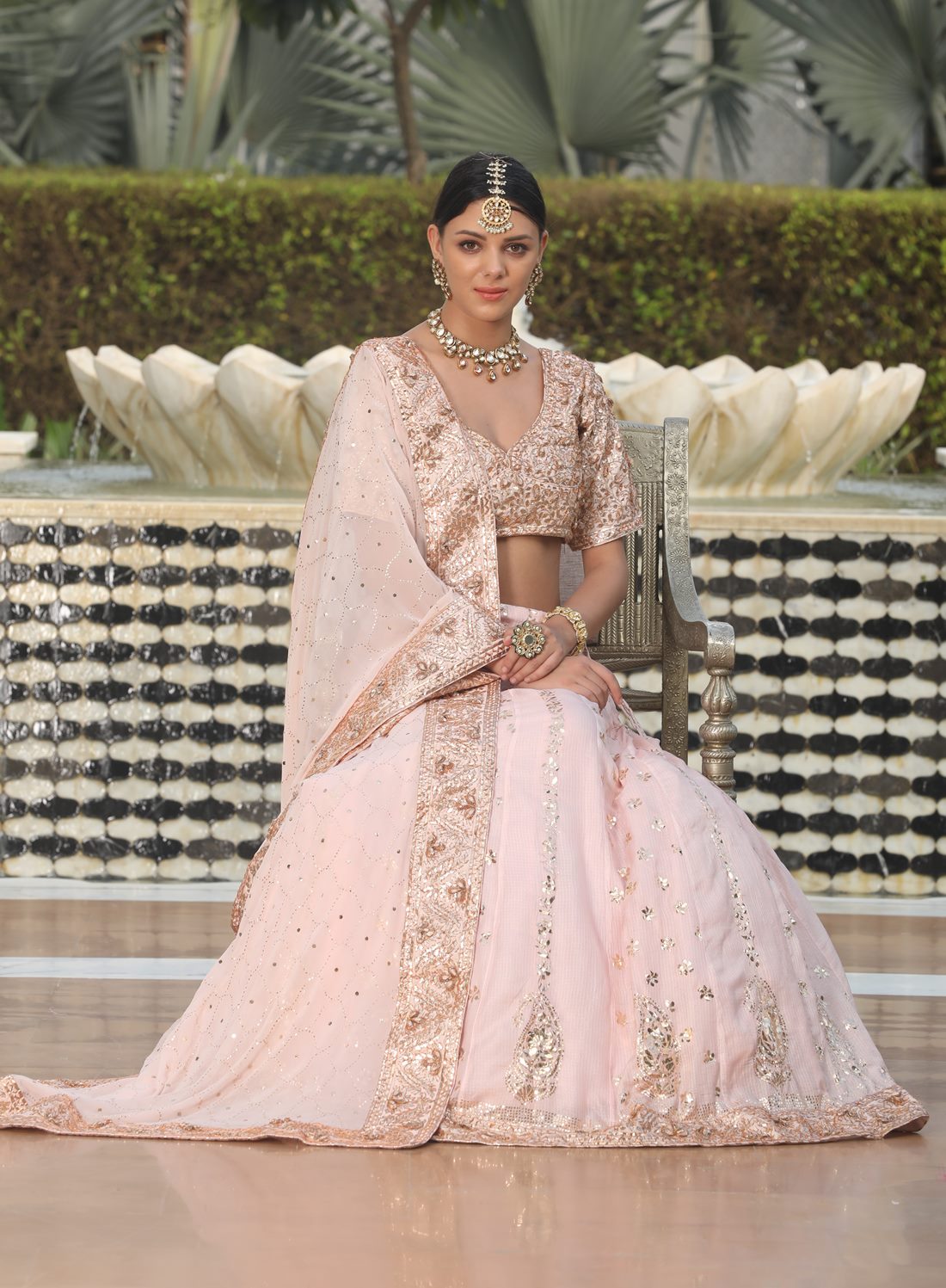 This Ranas Peach Color Kota Silk Lehenga is a designer and trendy lehenga with a delicate peach color. Made with kota silk fabric, it features intricate mukaish and gota patti work, adding a touch of elegance. The matching georgette dupatta completes the look. Perfect for any special occasion.
