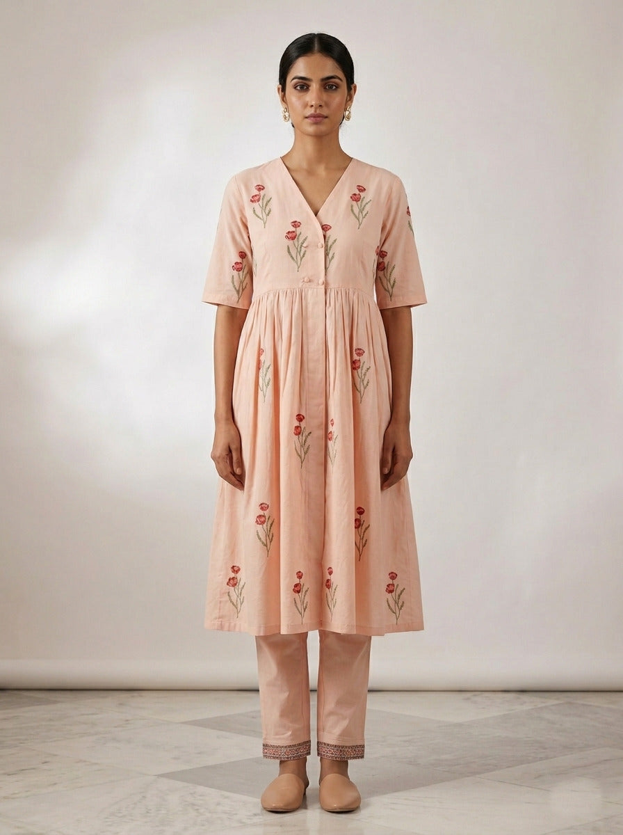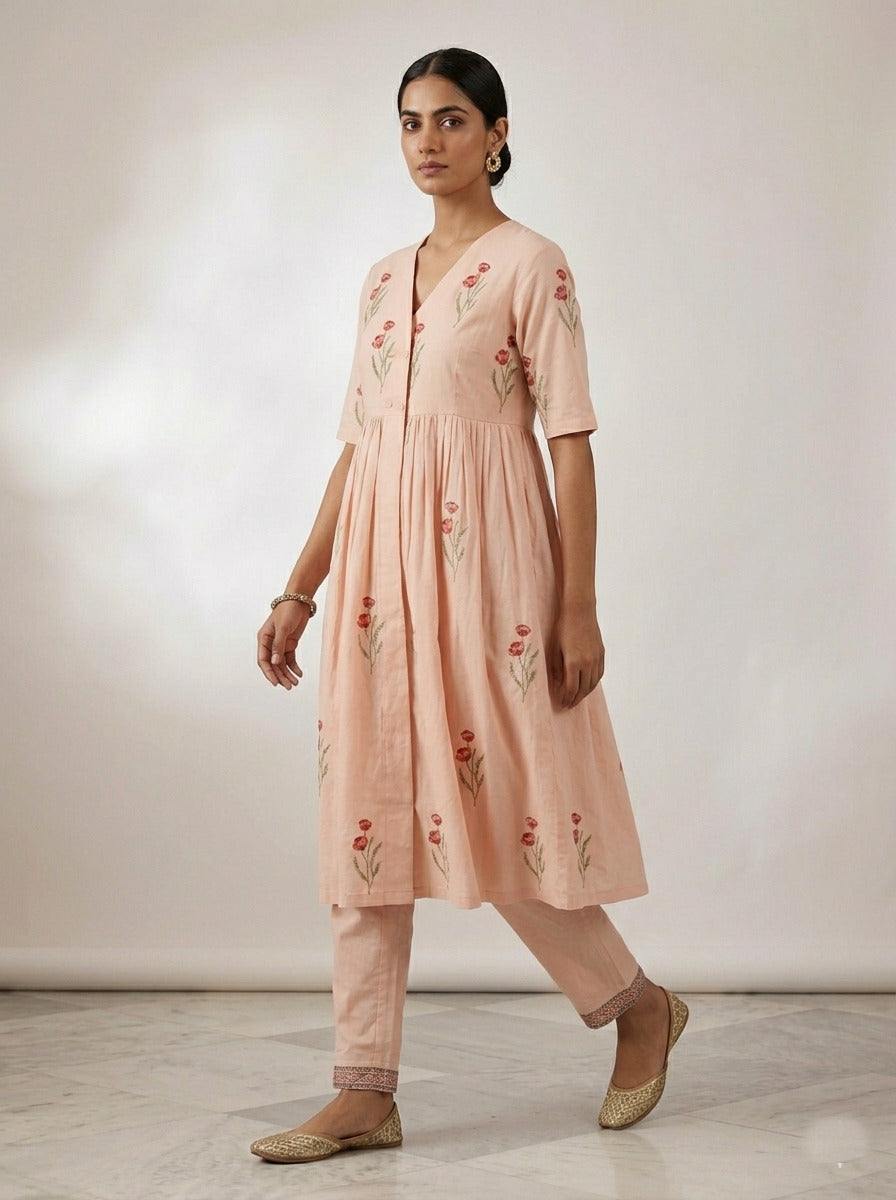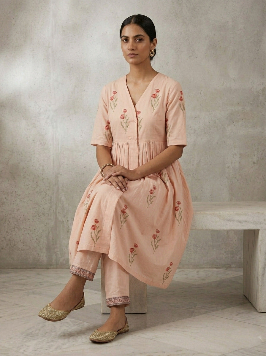 Kurta Color : Peach Kurta Fabric : Cotton Kurta Work : Block Print Bottom Type : Pant Pant Color : Peach Pant Fabric : Cotton |